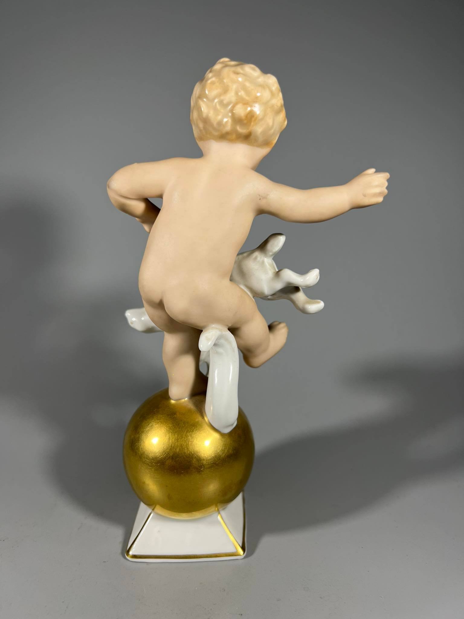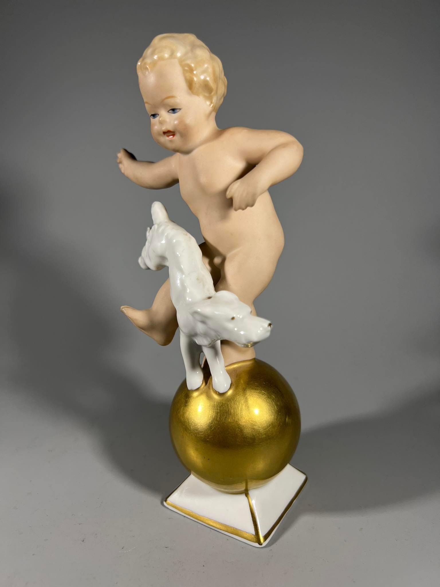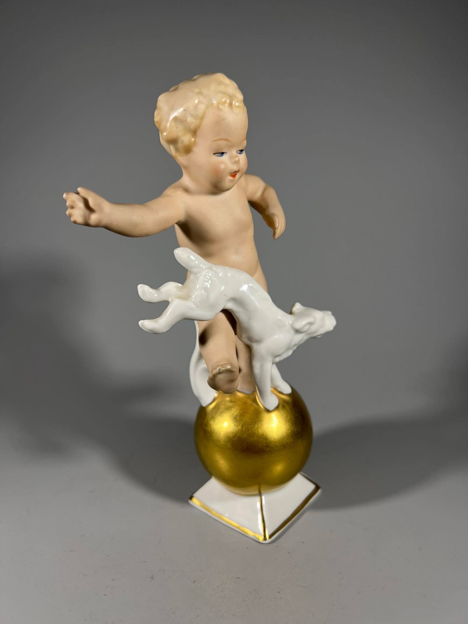 Statulėlė porcelianinė, antikvarinė Berniukas Putti su šunimi. Porceliano manufaktūra Gerold & Co, Bavaria, Vokietija. XX amžiaus vidurys. 1949 m. Porcelianas, rankomis tapytas, paauksuotas. Aukštis 17 cm. Kaina 73