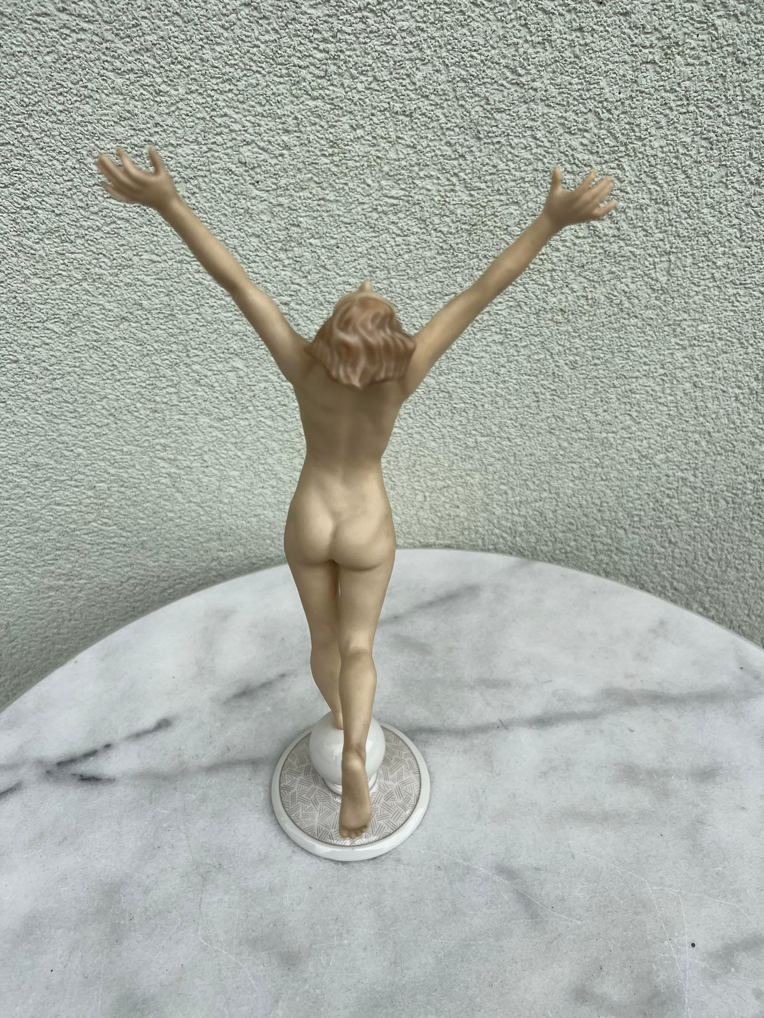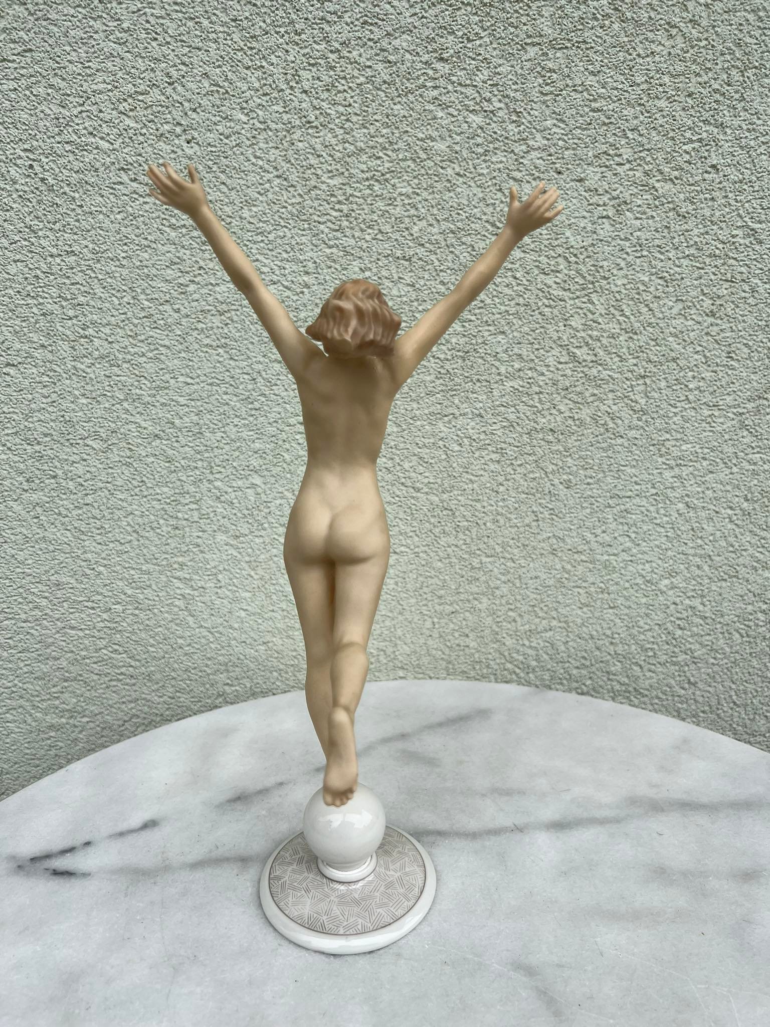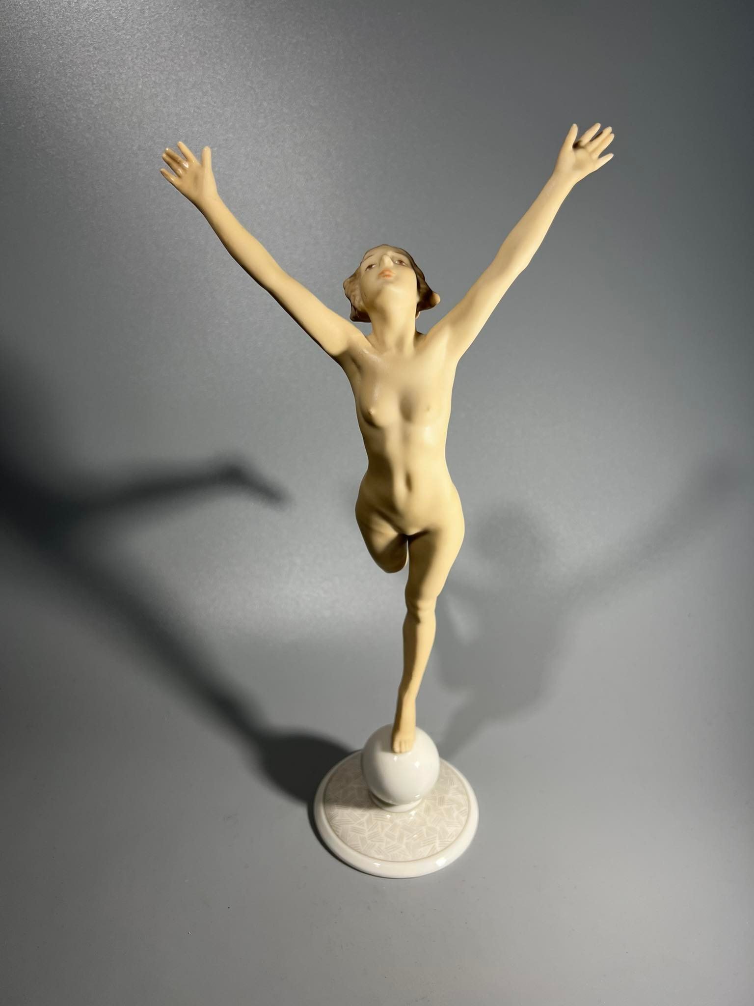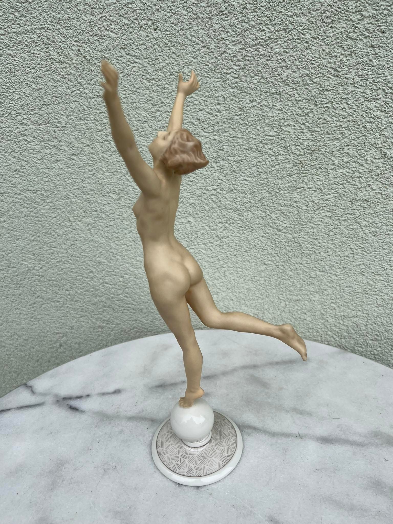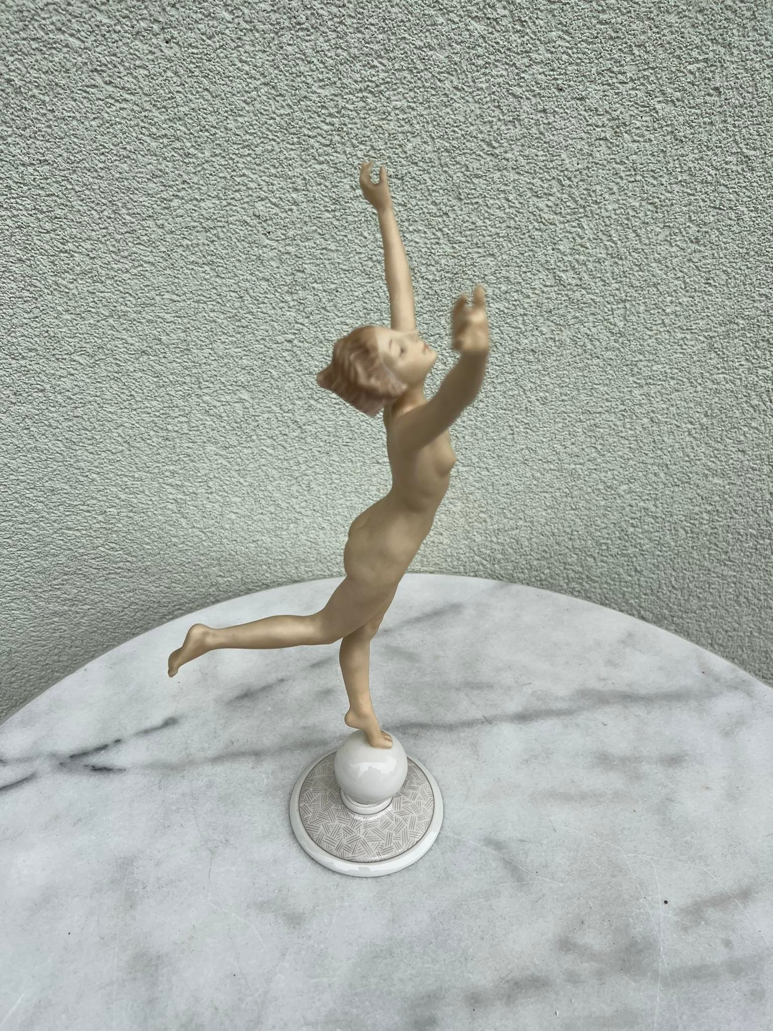 Statulėlė porcelianinė, antikvarinė Mergina, Saulės vaikas. Hutschenreuther Karl Tutter Sonnenkind. Art Deco stiliaus. Vokietija. Aukštis 33, pagrindo skersmuo 8,5 cm. Būklė be trūkumų. Kaina 168
