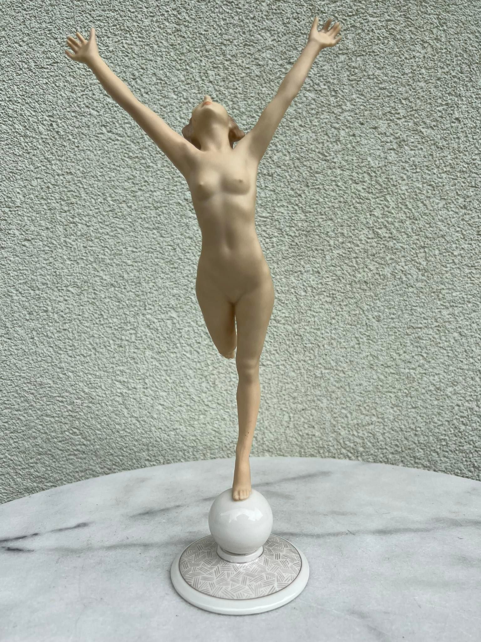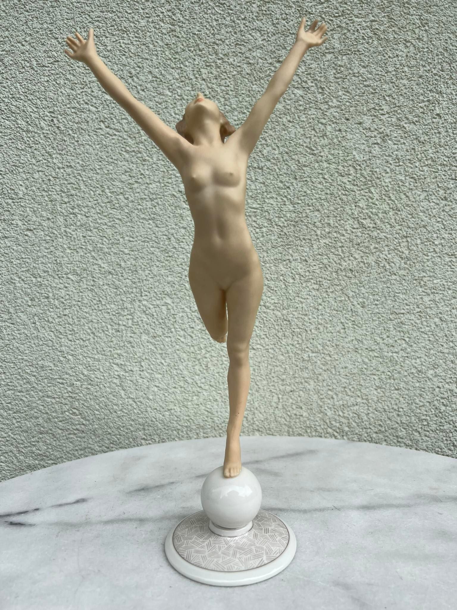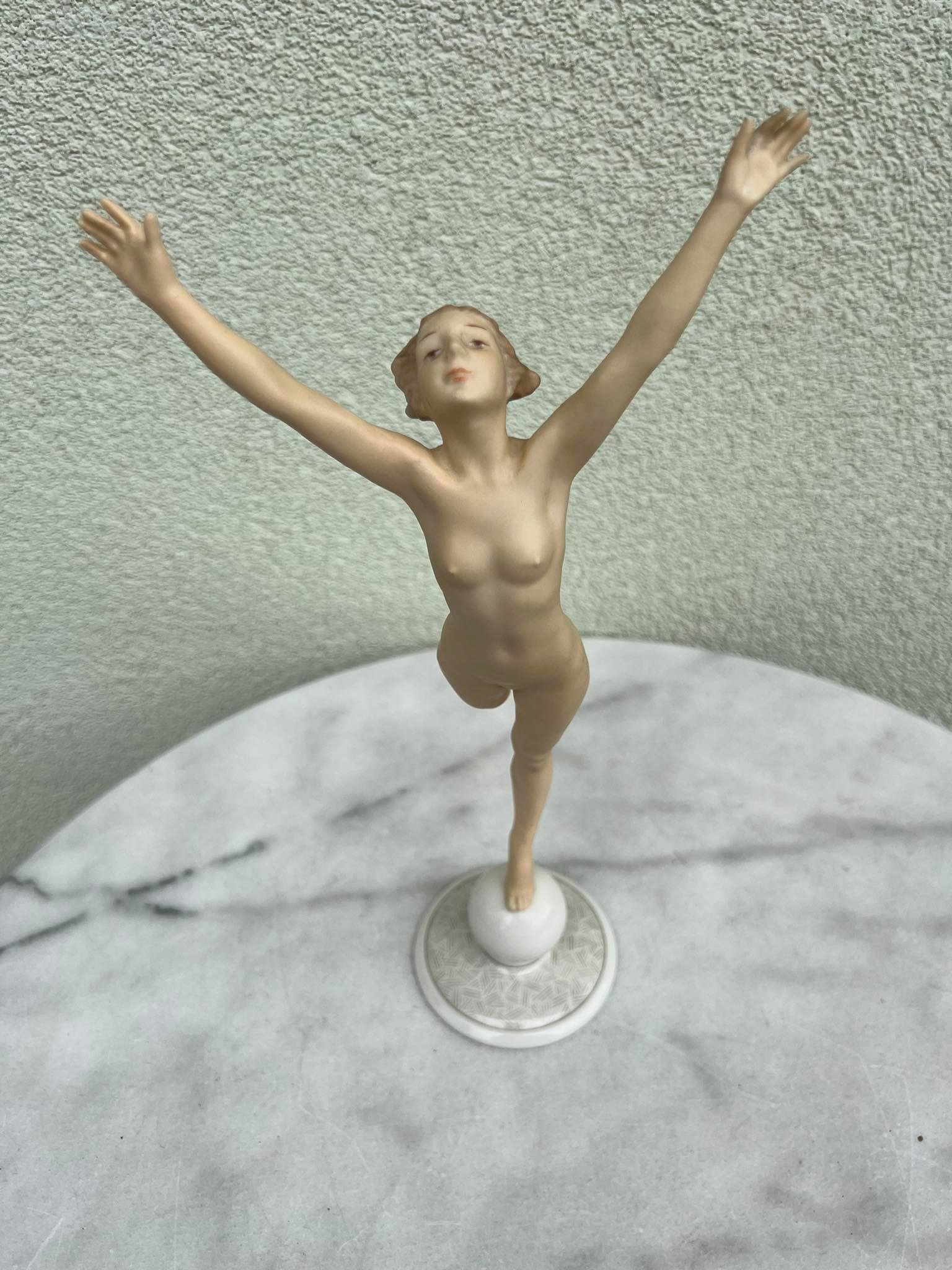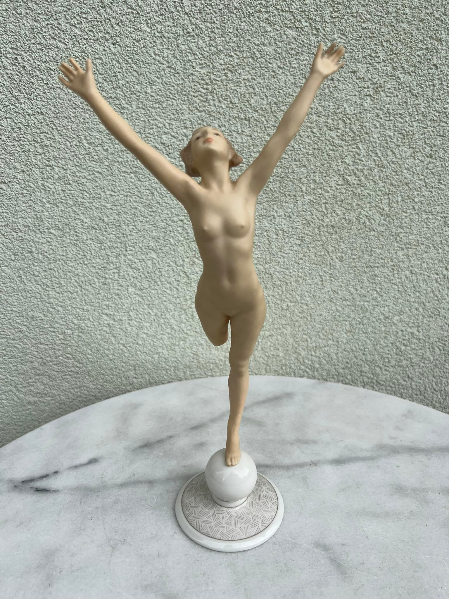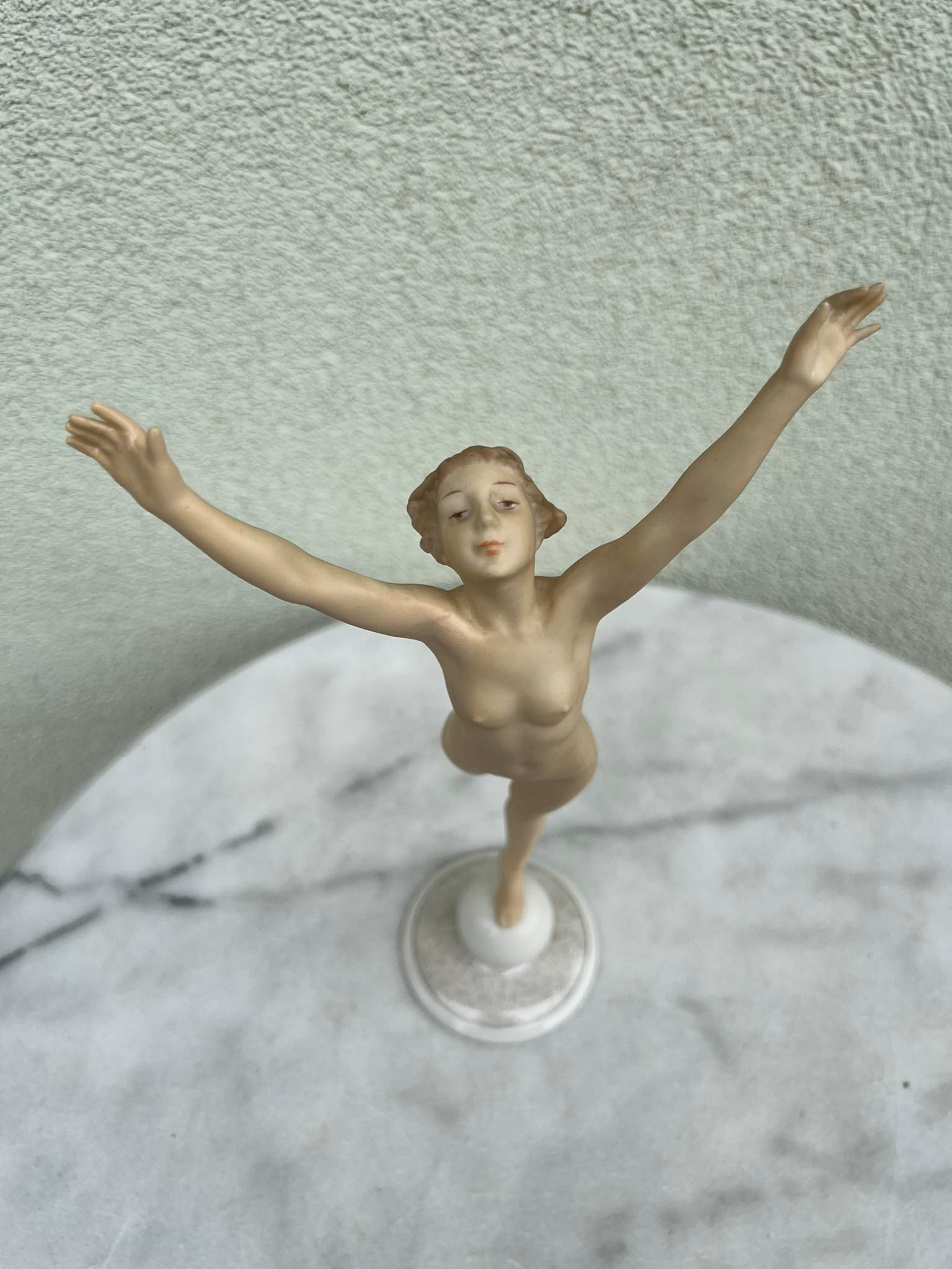 Statulėlė porcelianinė, antikvarinė Mergina, Saulės vaikas. Hutschenreuther Karl Tutter Sonnenkind. Art Deco stiliaus. Vokietija. Aukštis 33, pagrindo skersmuo 8,5 cm. Būklė be trūkumų. Kaina 168