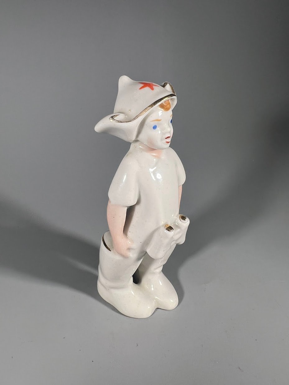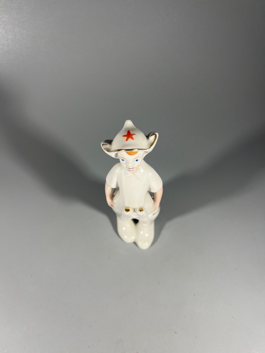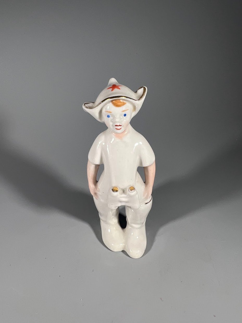 Statulėlė porcelianinė Berniukas su budionovka, sovietinė, tarybinių laikų. Polonės meninės keramikos gamykla. 1950–1970 m. 4 vnt. Kaina po 48