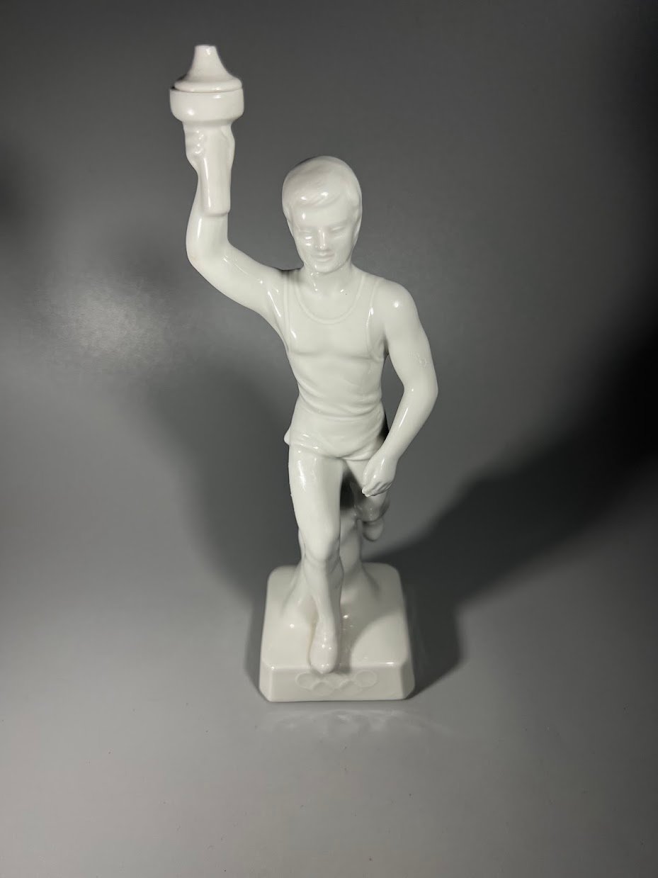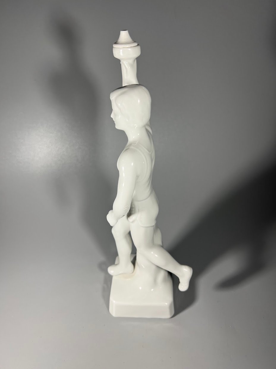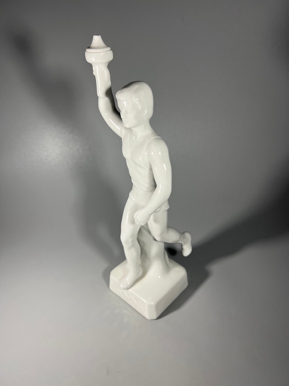 Statulėlė porcelianinė Olimpinės ugnies nešėjas. Originalus 1936 m. Berlyno olimpinių žaidynių suvenyras. Vokietijos Reichas. Aukštis su fakelu 26 cm. 2 vnt. Kaina po 63