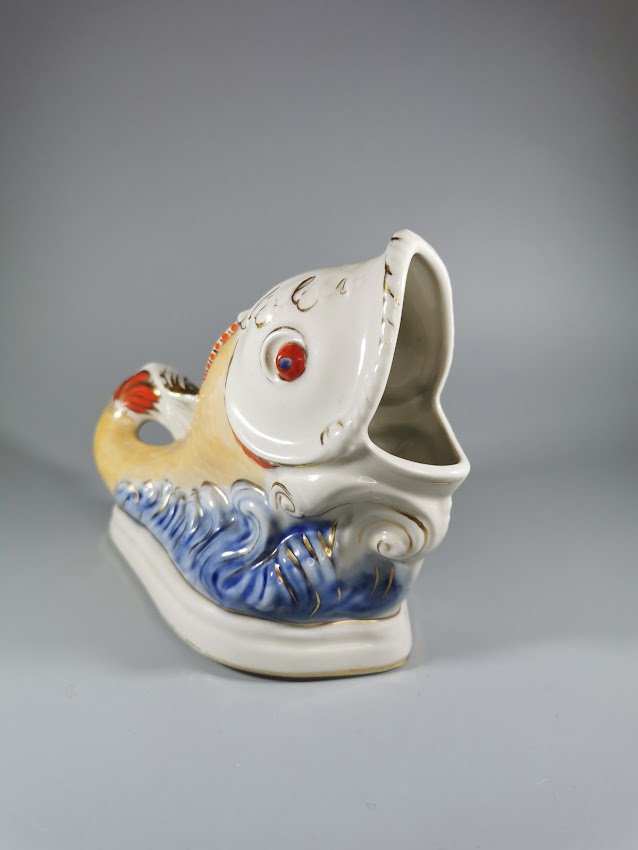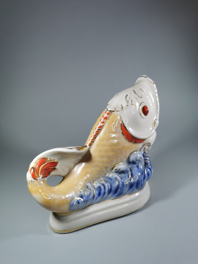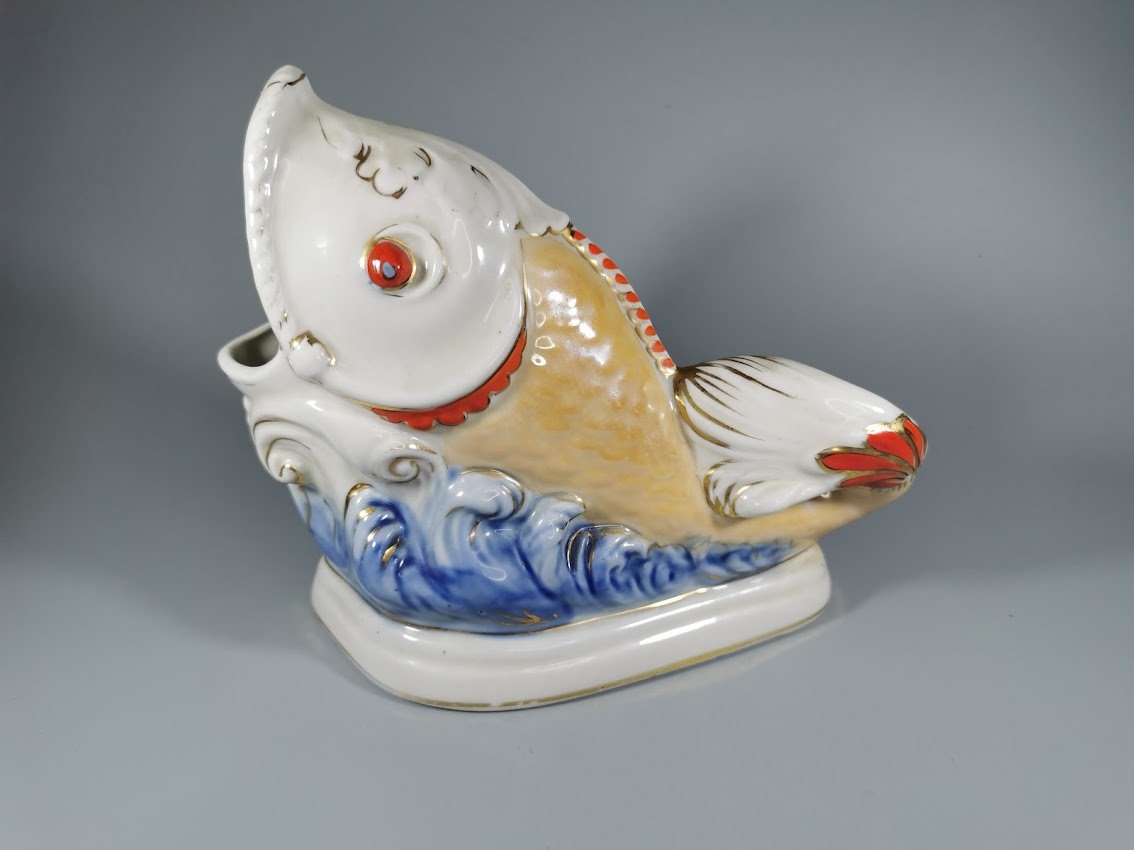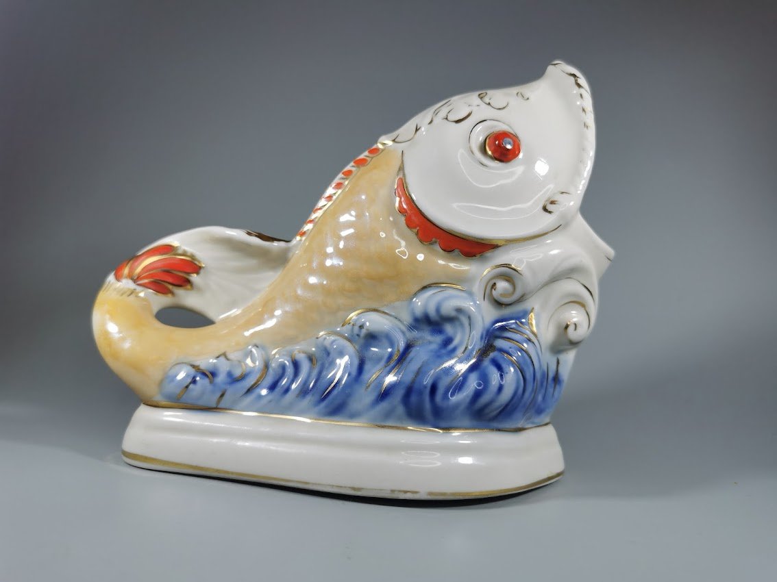 Statulėlė porcelianinė, servetėlių laikiklis – Žuvis. Korostno (Коростень) porceliano fabrikas, 1950-60 m. Kaina 36