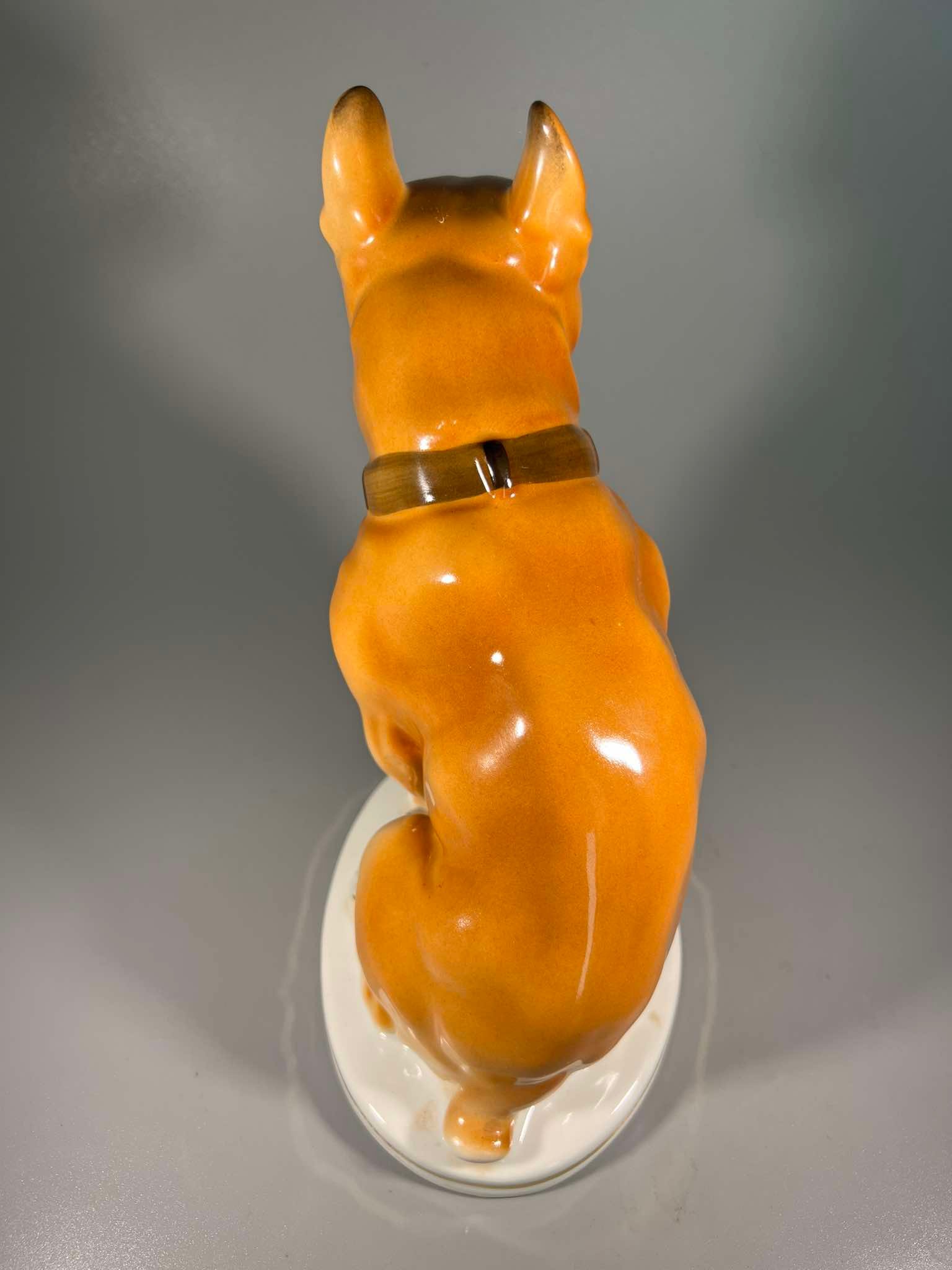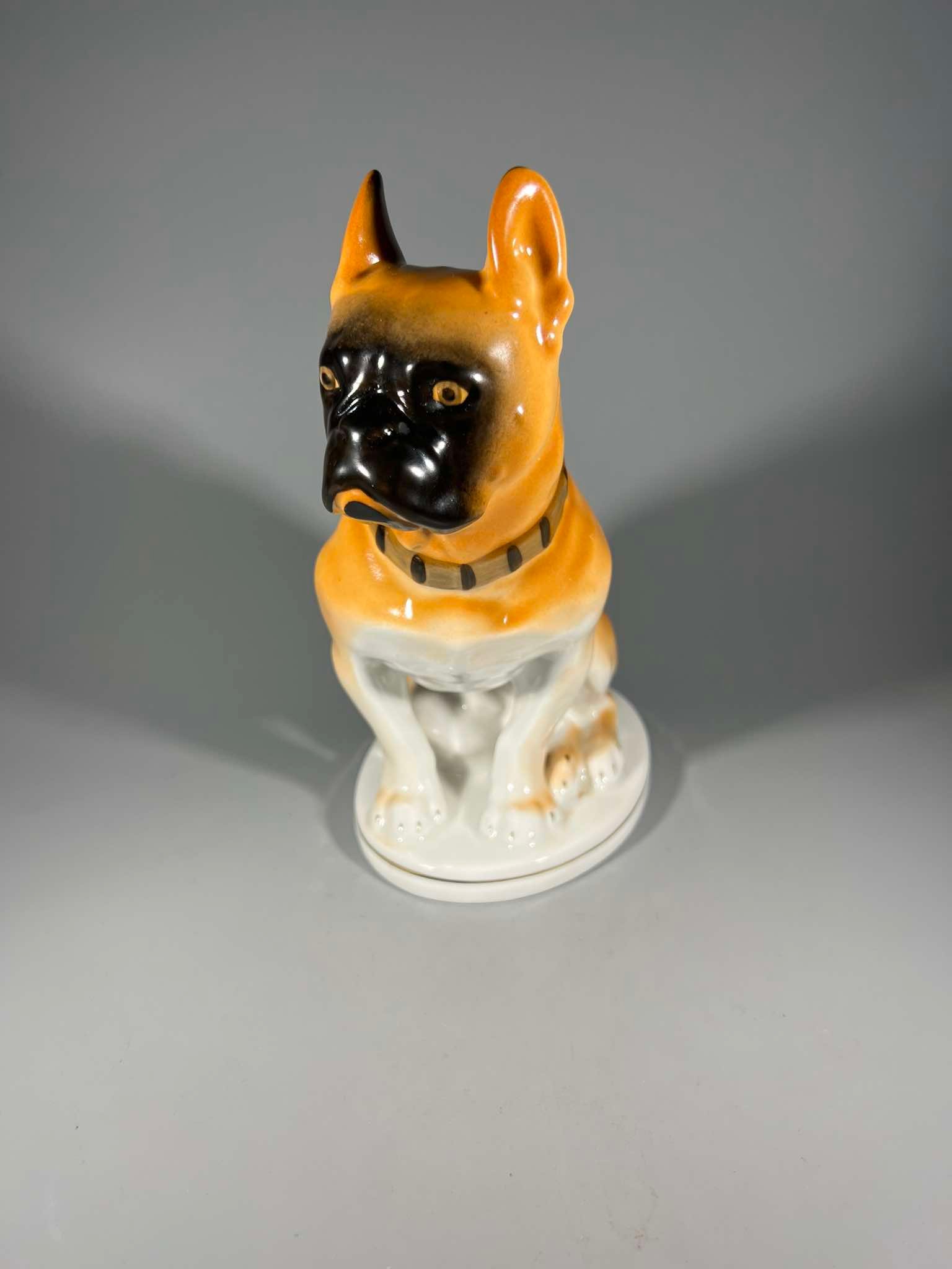 Statulėlė porcelianinė Šuo Buldogas, bokseris. Autorius V.S. Drachinskaya. Modelio sukūrimo metai: 1949. LFZ. Aukštis 21 cm. Pirkta Prancūzijoje. Kaina 63