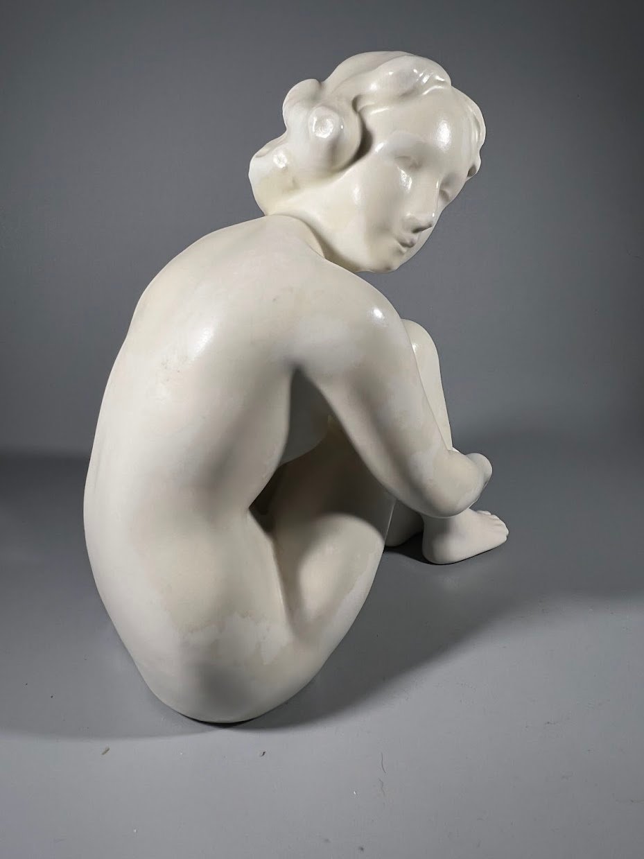 Modelis: Goebel FN 26, Tema: Sėdinti nuoga mergina „Sitzender Akt“, Gamintojas: W. Goebel Porzellanfabrik. Dizaineris: Tikėtina, Adolfas Reubke arba Albinas Döbrichas. Data: 1934–1939 m. Medžiaga: Glazūruotas porcelianas, dramblio kaulo/kreminės spalvos. Šios FN serijos figūrėlės buvo „Goebel“ atsakas į Europos Art Deco skulptūros tendenciją, akcentuojant natūralias žmogaus formas, grakštumą ir ramybę.