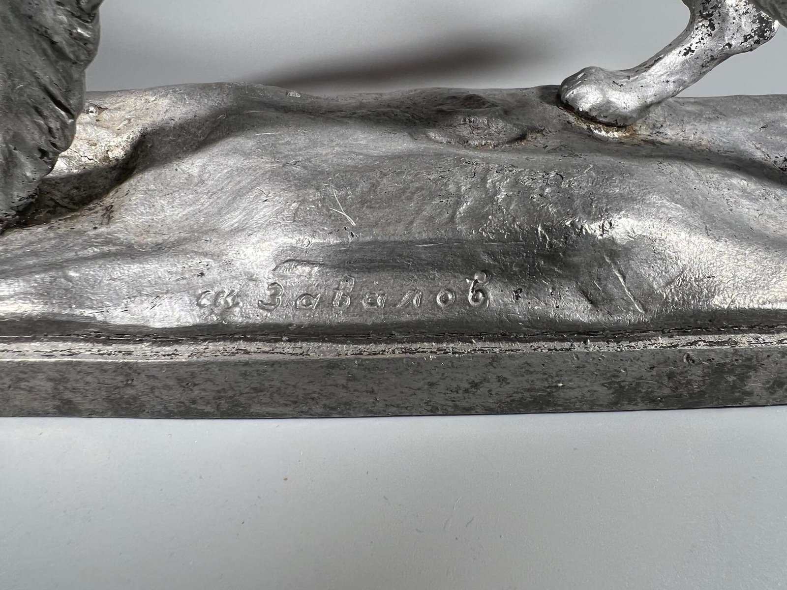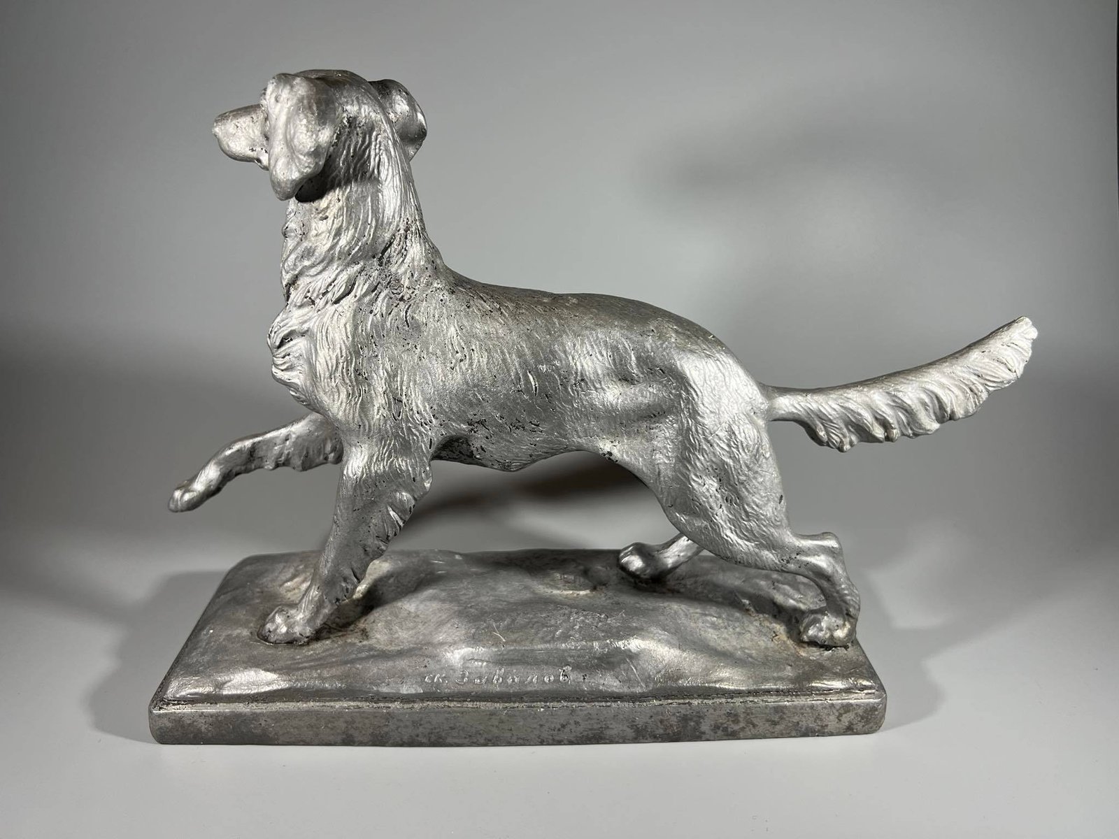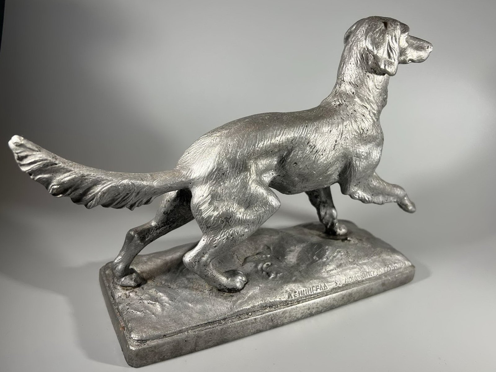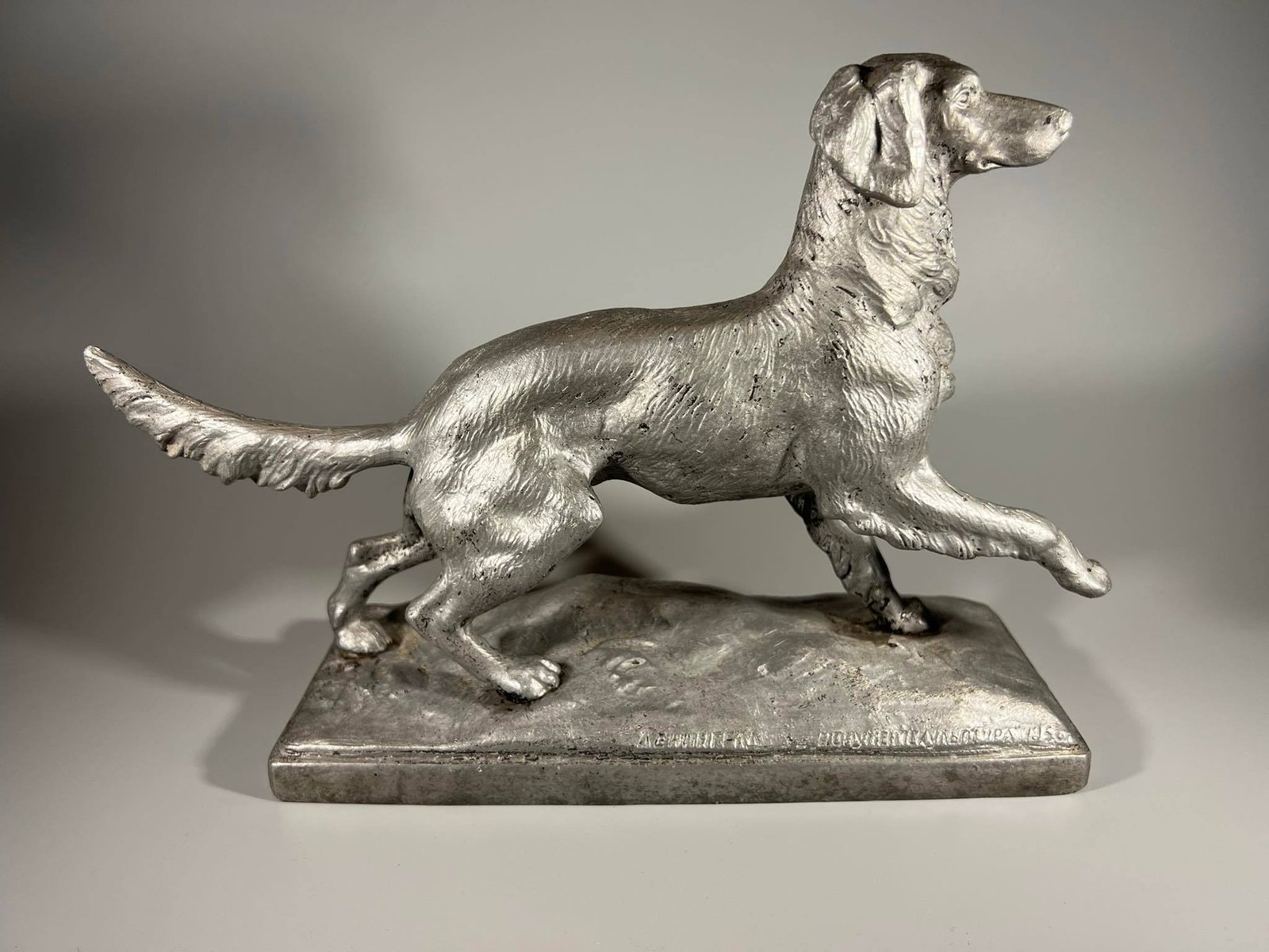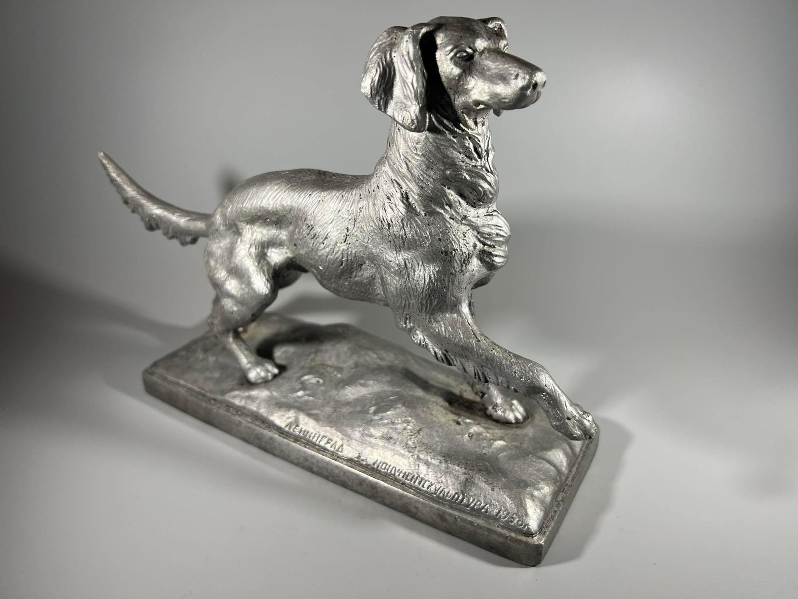 Statulėlė Šuo, Ленинград „Монументскульптура” 1956 г. Ск. Завалов. Leningradas, skukptorius Zavalov, 1956 m. Metalas aliuminis. Svoris 1,5 kg. Aukštis 21 cm. Pagrindo dydis: 9 x 24 cm. Kaina 83