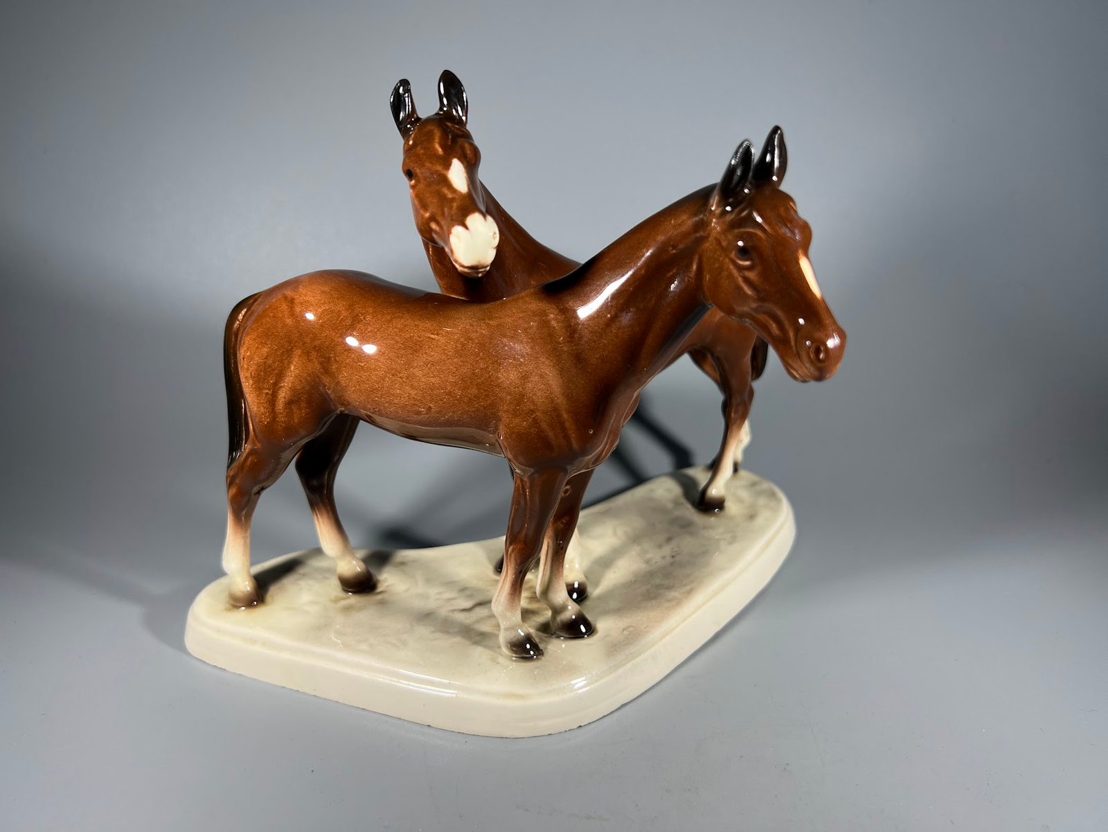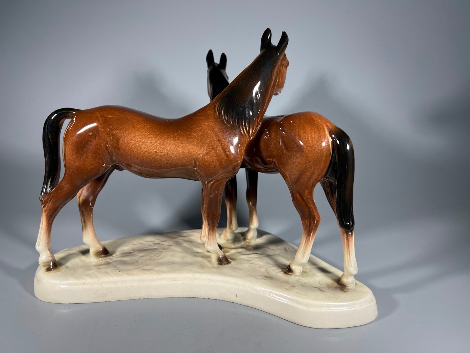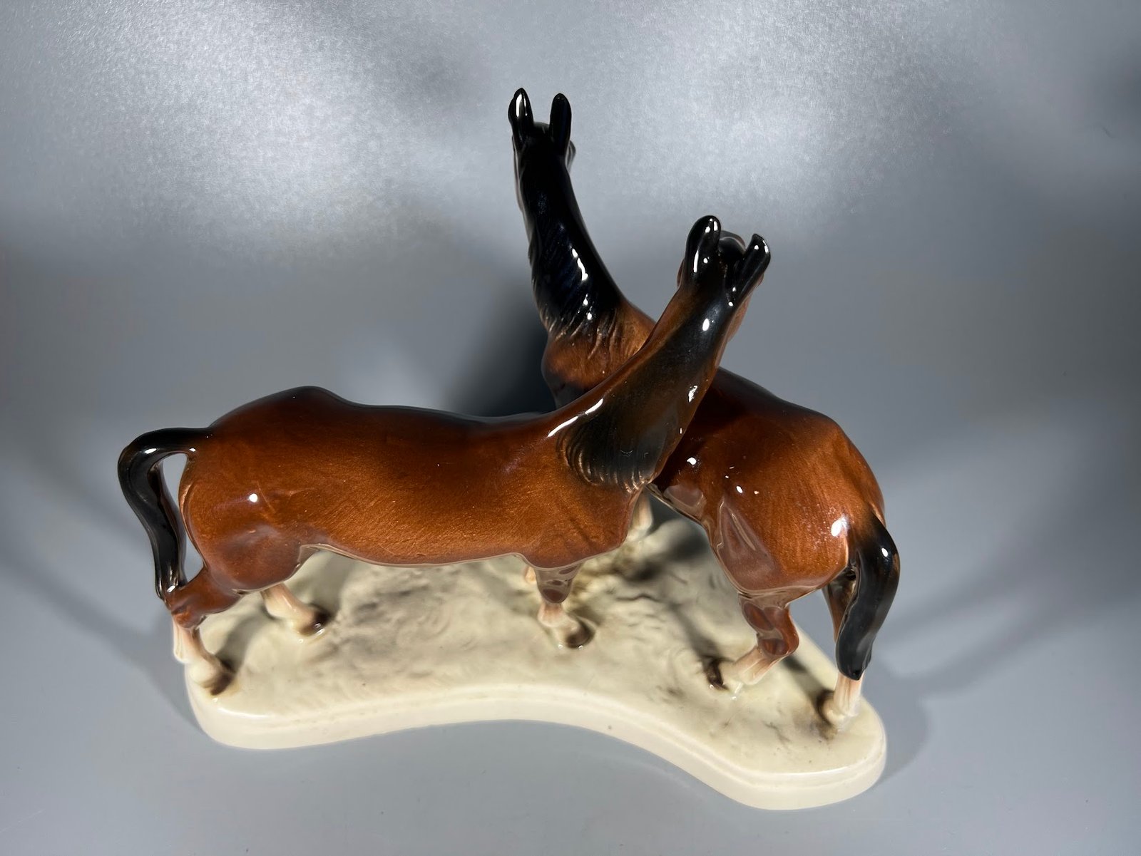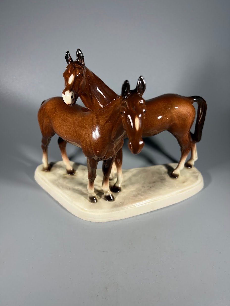 Statulėlė Žirgų, arklių pora. Hertwig & Co Katzhutte. Vokietija. 1941-1958 m. Aukštis 18, ilgis 24 cm. Kaina 68