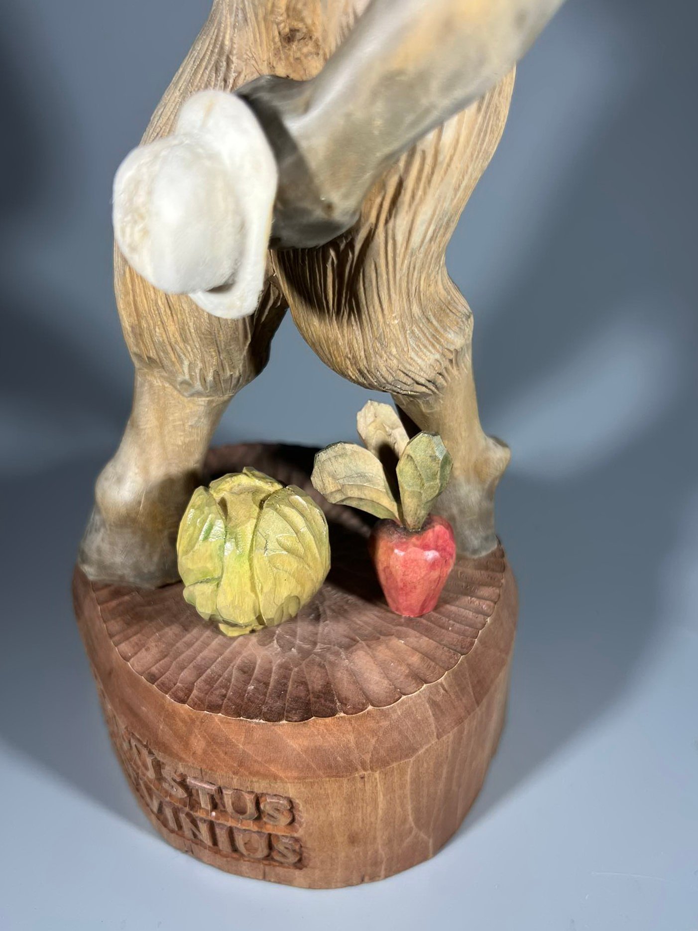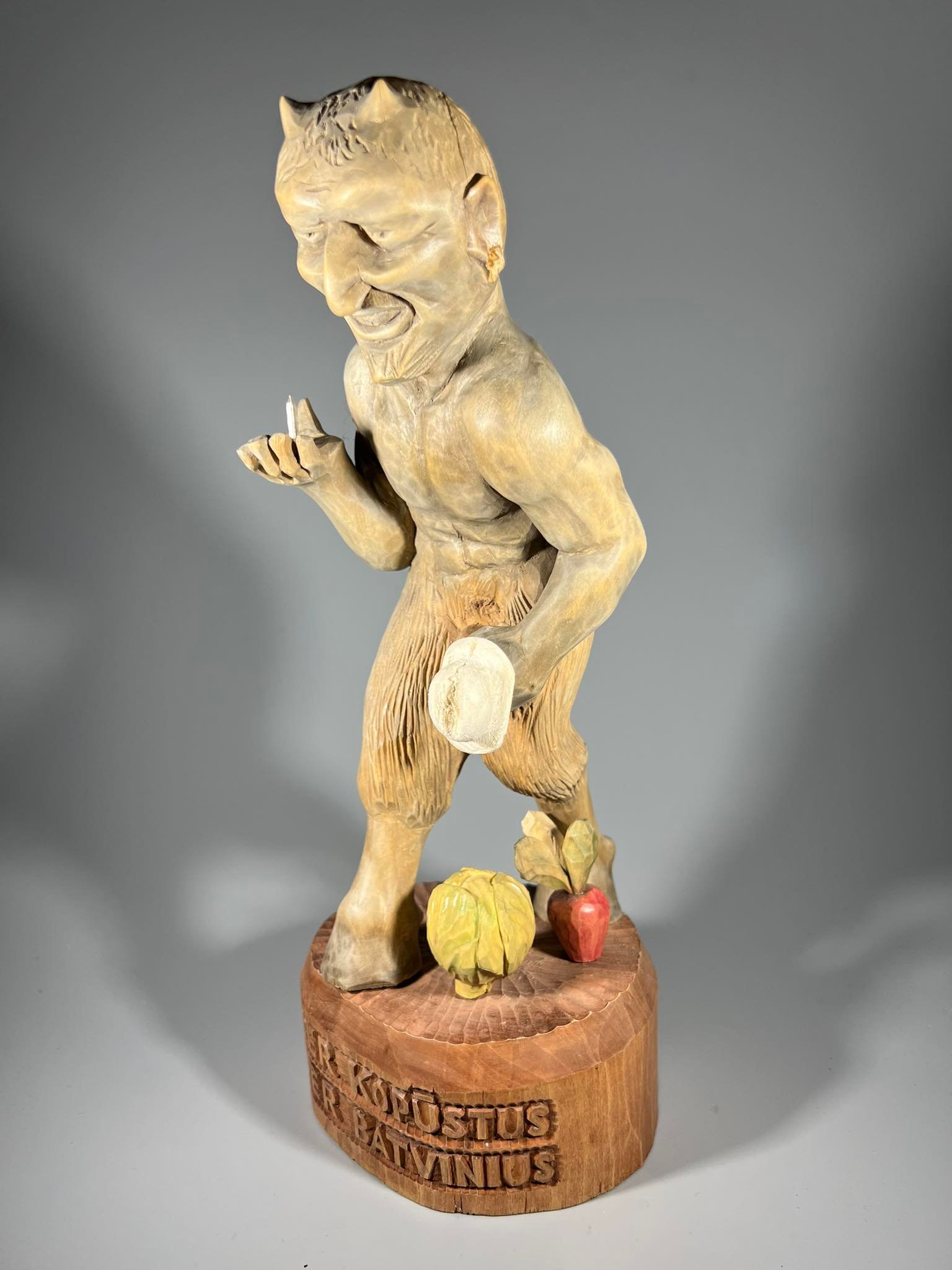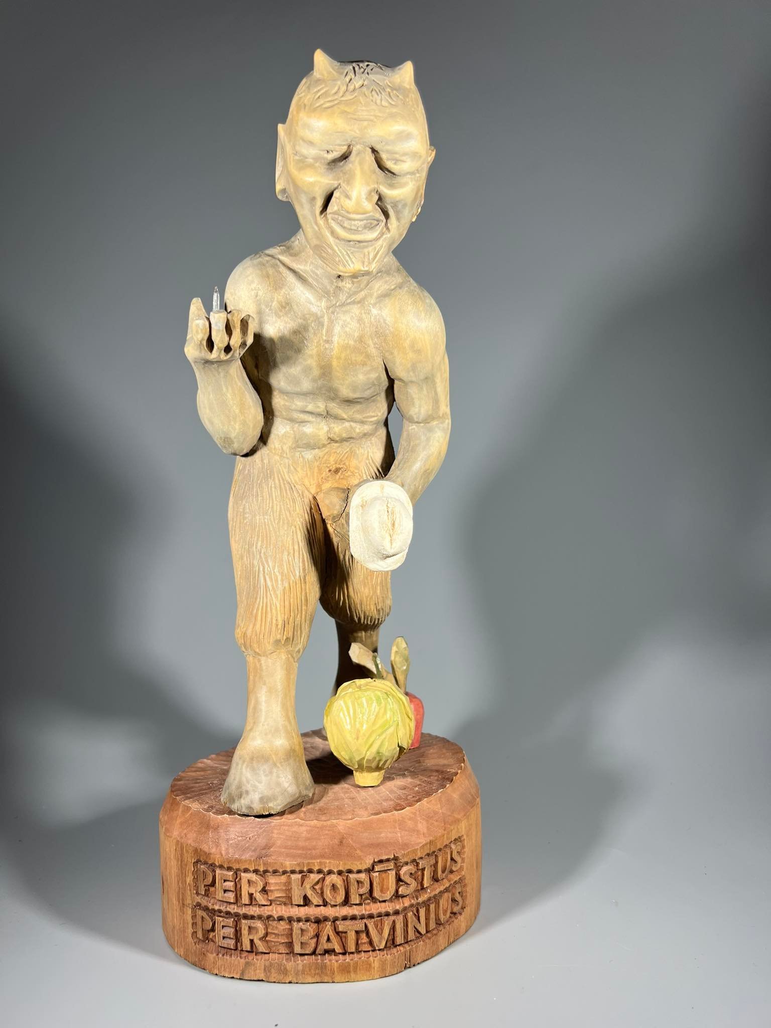 Statulėlė, žvakidė Velnias, per kopūstus per batvinius, medinė, drožinėta, lietuviška. Aukštis 30 cm. Kaina 168