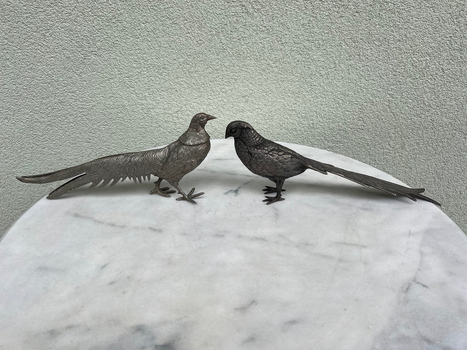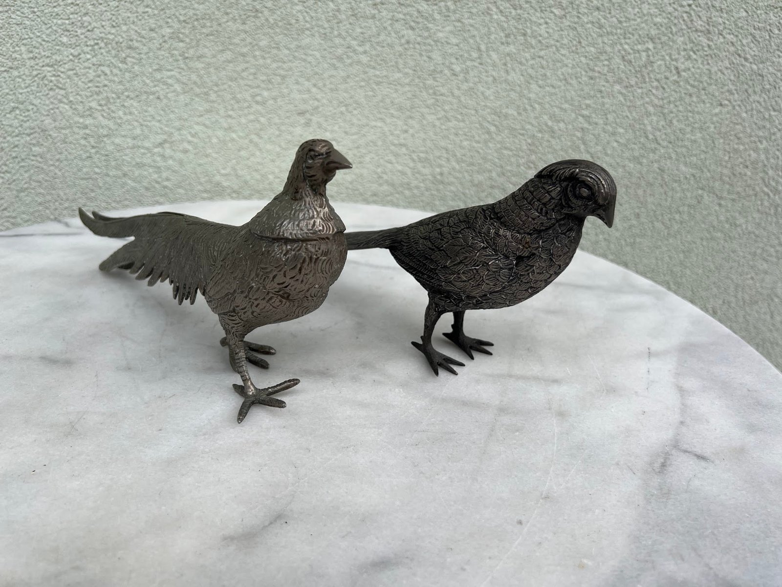 Statulėlės Fazanai, fazanas, porelė, metalinė, sidabro spalvos, vintažinė. Prancūzija, Italija. 1950–1970 m. Kaina 143 už abu