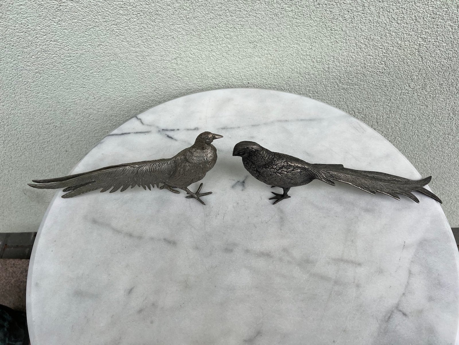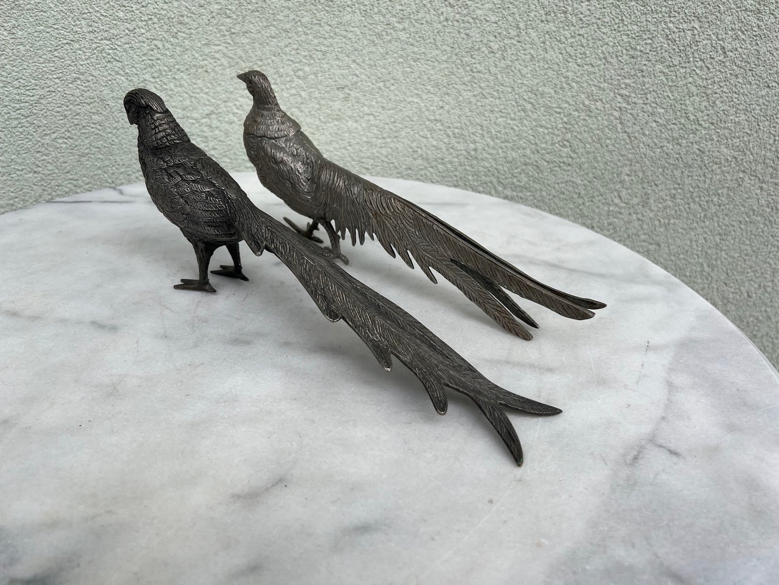 Statulėlės Fazanai, porelė, metalinė, sidabro spalvos, vintažinė. Prancūzija, Italija. 1950–1970 m. Aukštis 12, ilgis 30 cm. Kaina 143 už abu