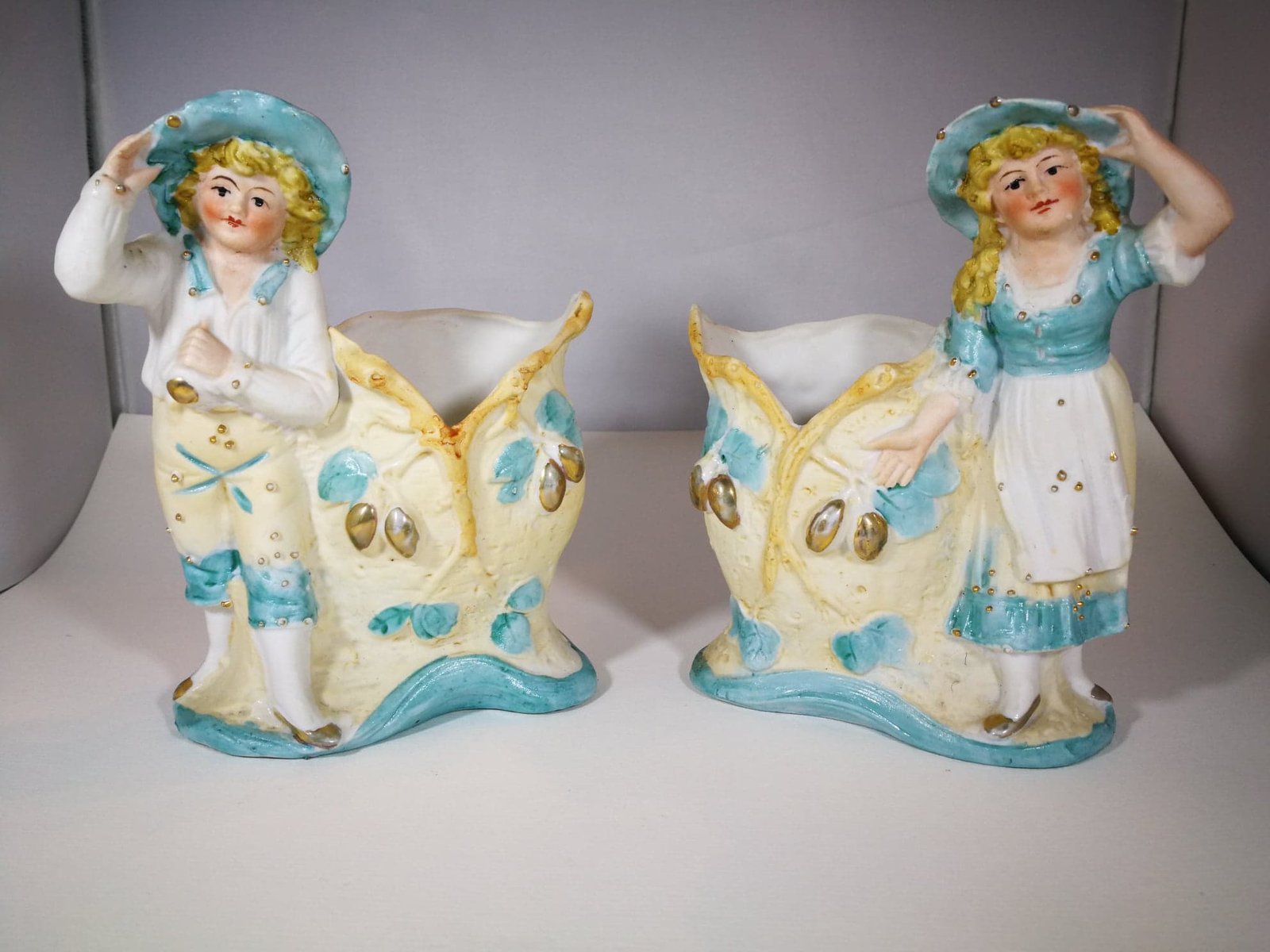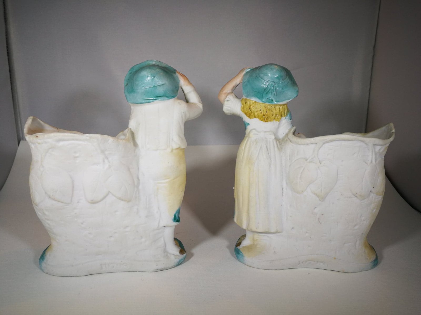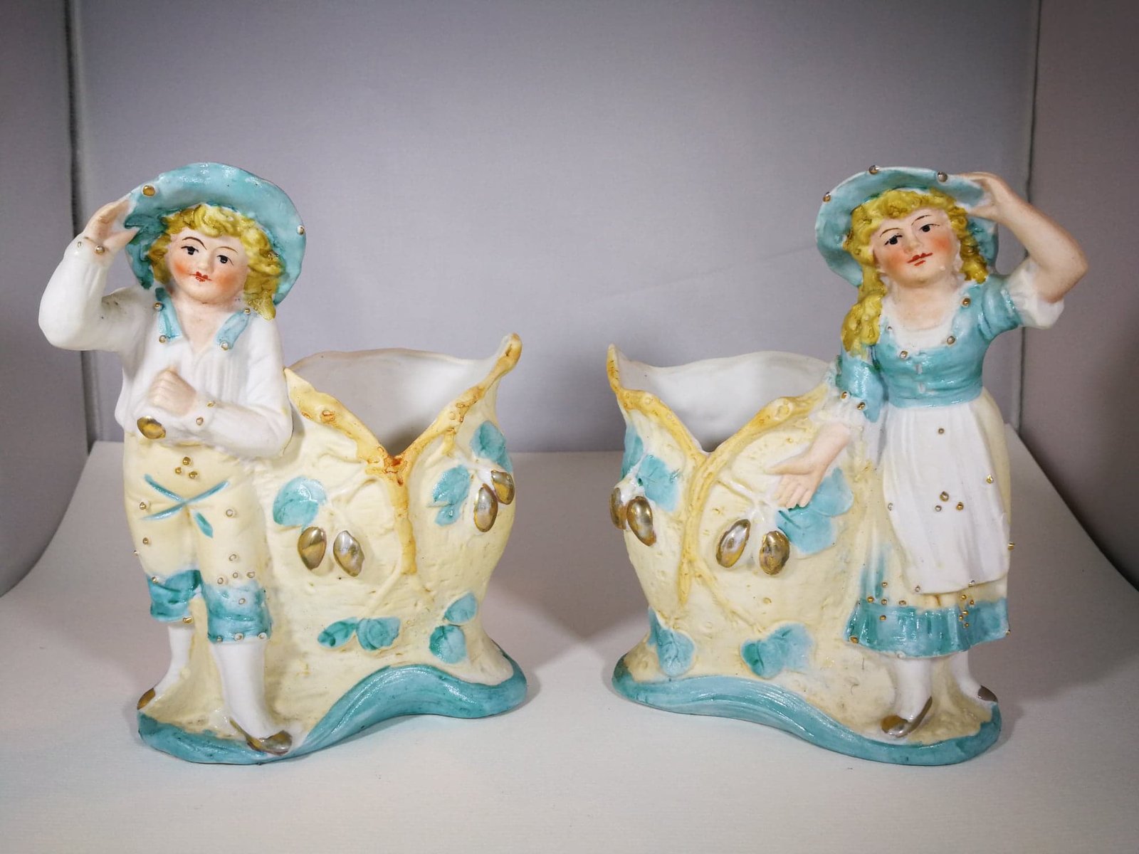 Statulėlės-vazelės antikvarinės Porelė. Biskvitas. Aukštis 15, ilgis 10 cm. LIKO VIENA. Kaina 16