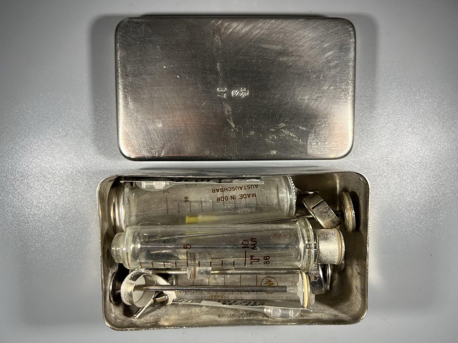 Sterilizatorius medicininis su švirkstais ir adatomis tarybinių, sovietinių laikų. Švirkštų 4 vnt. Sterilizatoriaus dydis: 4 x 7 x 12 cm. Kaina 28 už viską