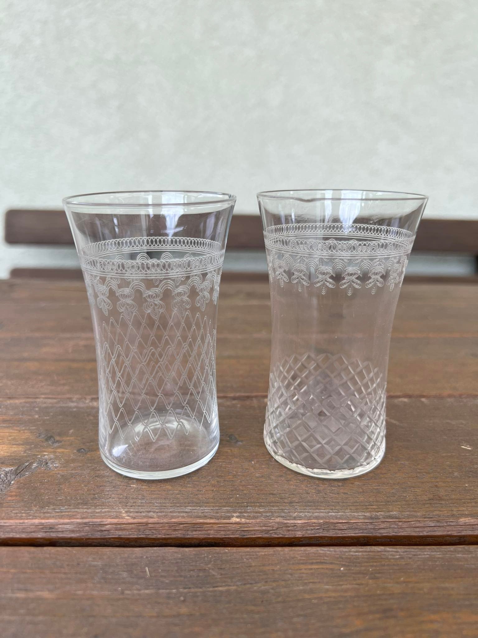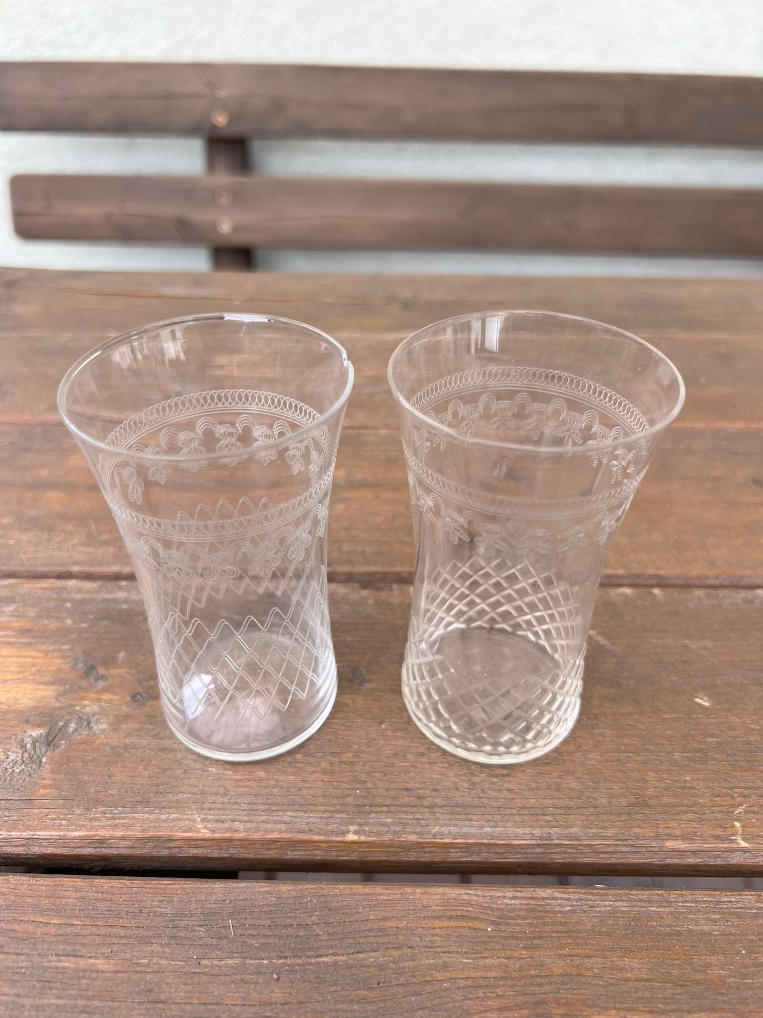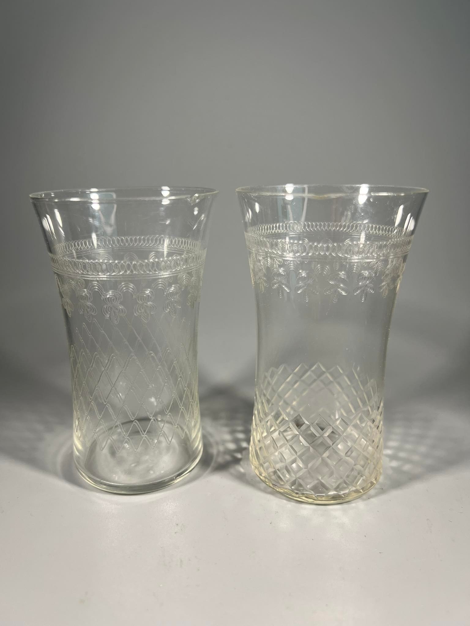 Stiklinės antikvarinės, raižytos, plono stiklo, Viktorijos laikų (1837-1901) stiliaus. 2 vnt. Aukštis 10, skersmuo viršuje 6, apačioje 4,5 cm. Kaina po 13