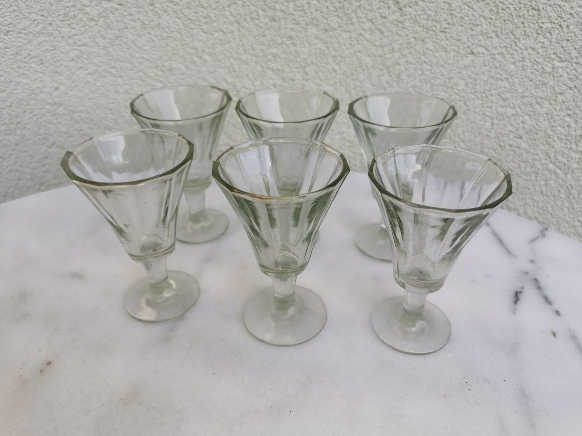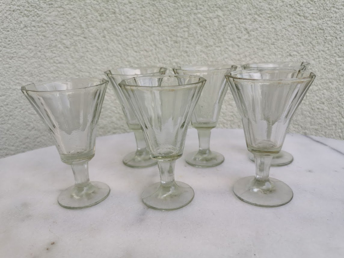 Stikliukai, taurelės ankstyvo pokario. LIKO 5 vnt. Aukštis 10, viršutinis skersmuo 6, pagrindo skersmuo 4,5 cm. Kaina po 8