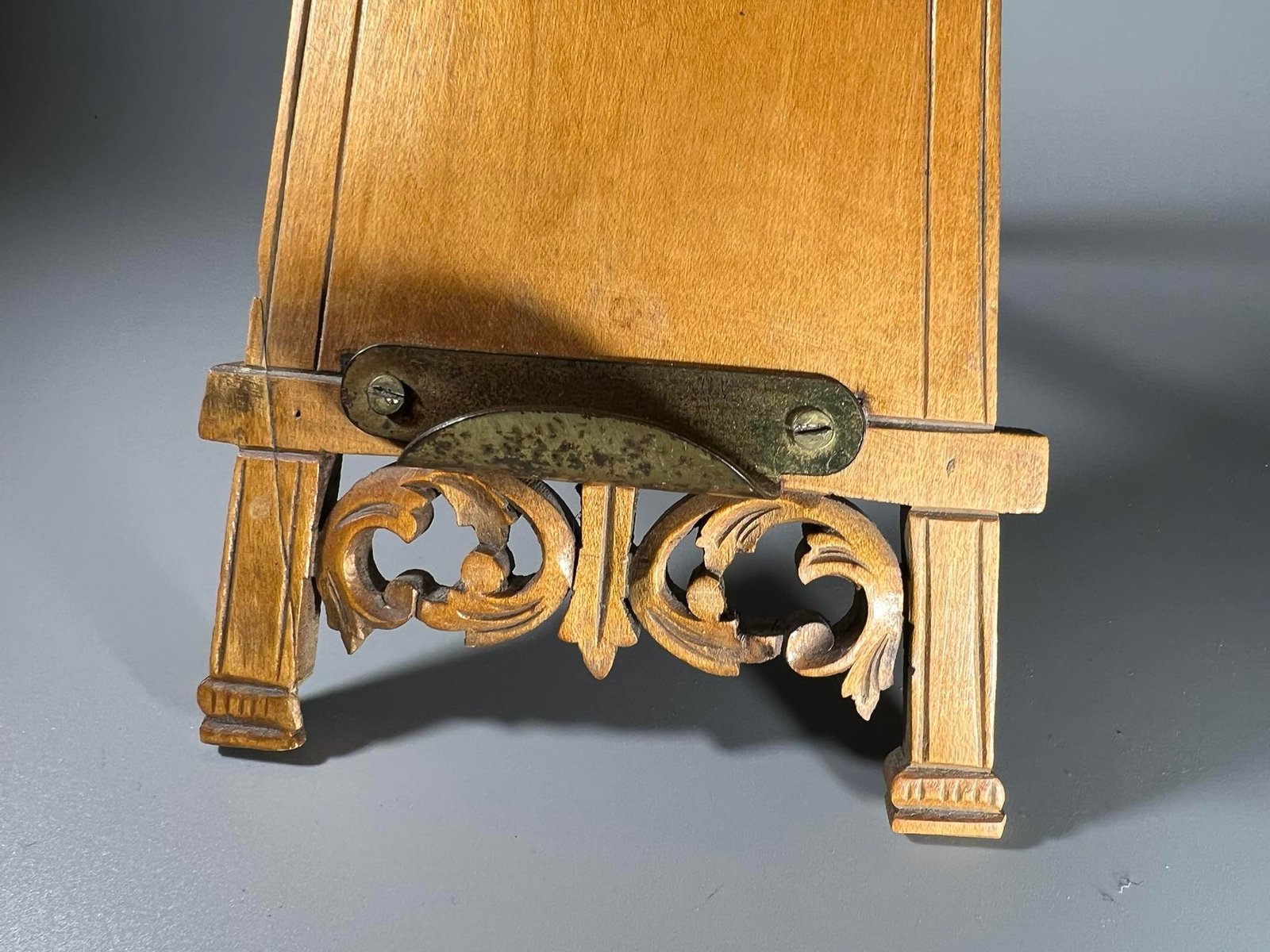 Stovelis medinis, drožinėtas, antikvarinis Jugendstil stiliaus. Stovelio aukštis 28, plotis apačioje 12, viršuje 9 cm. Aukštis padėjimui 11 cm. Kaina 53