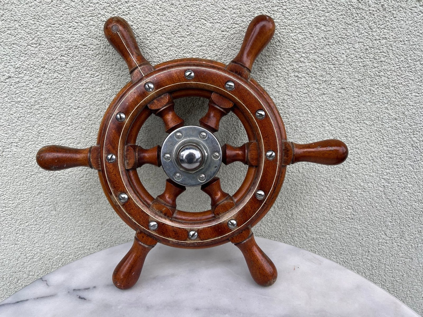 Šturvalas, laivo vairas autentiškas, medinis, kaustytas metalu, antikvarinis. Skersmuo 40 cm. Kaina 168