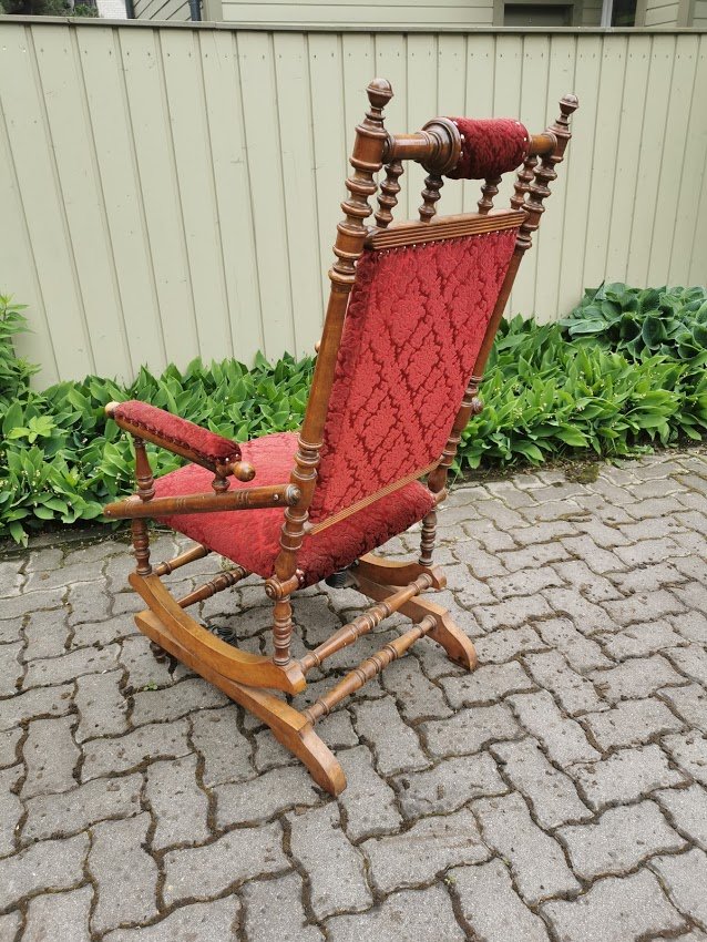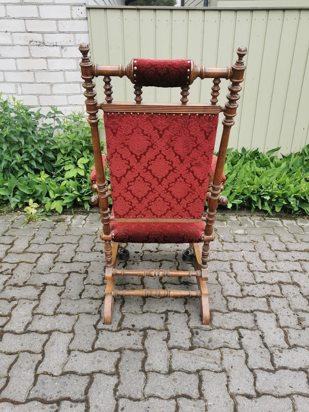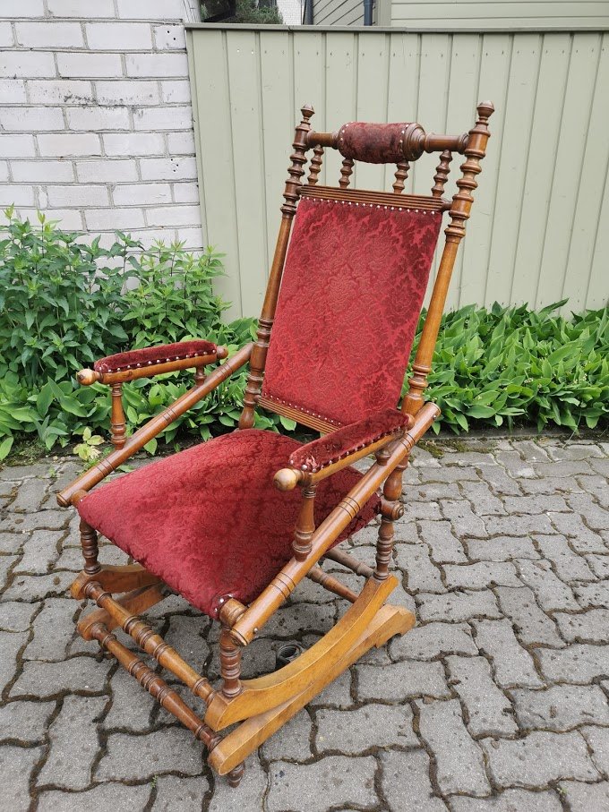 Supamas krėslas, spyruoklinis, antikvarinis. Atkaltės aukštis 122, sėdimosios dalies aukštis 48, plotis 63, gylis 52 cm. Kaina 167