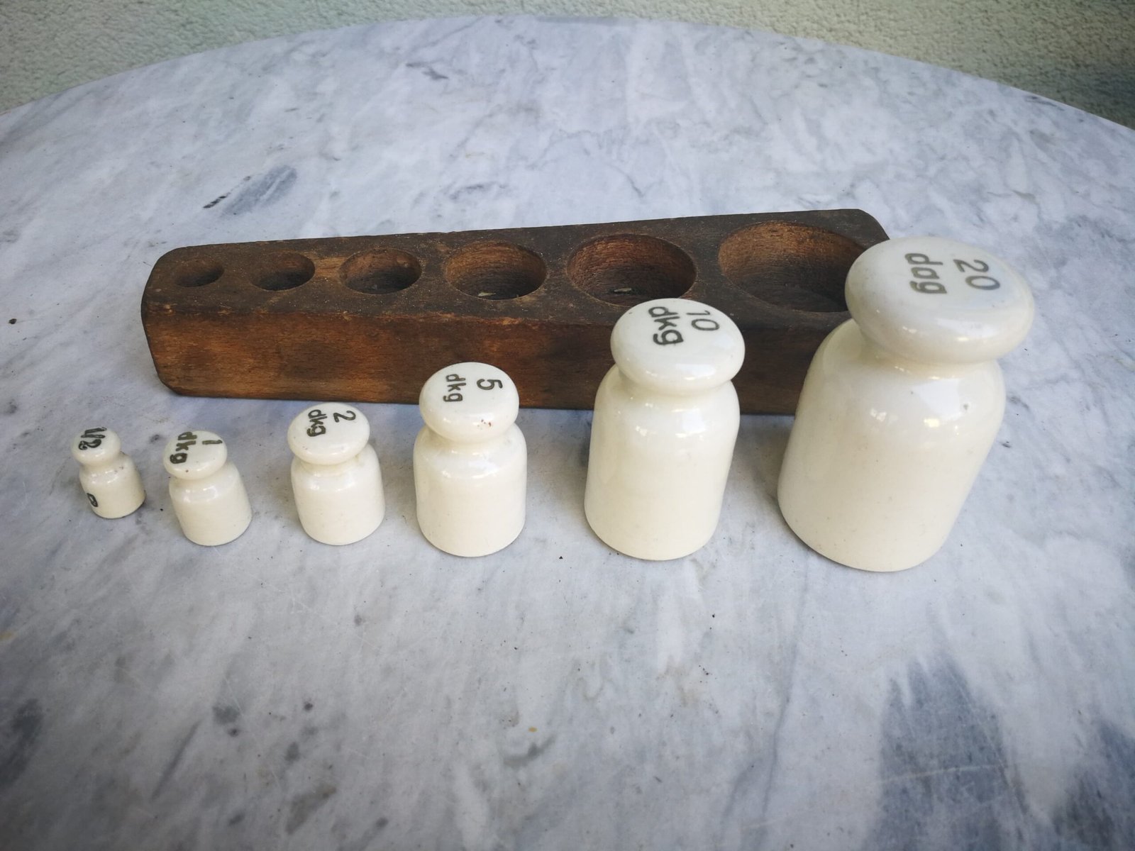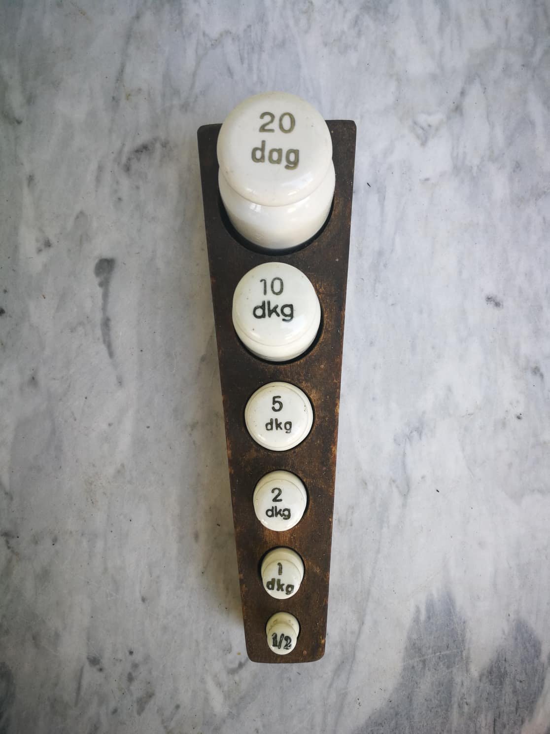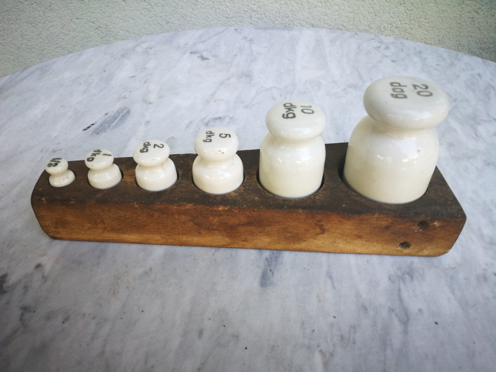Svareliai keraminiai glazūruoti antikvariniai, prabuoti mediniame stovelyje. Svoris iki 200 g. Kaina 32