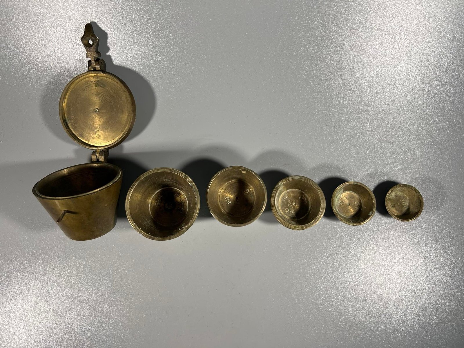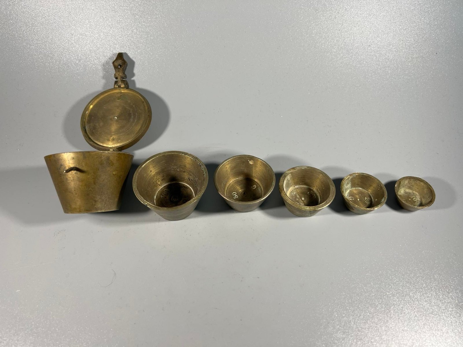 Svarelių rinkinys originalioje dėžutėje, antikvarinis. Pilnas komplektas. 500 g. Aukštis 4,5, pagrindo skersmuo 3,5 cm. Kaina 78