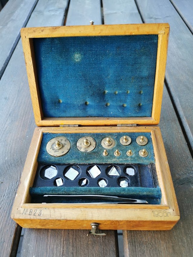 Svarelių rinkinys, svareliai medinėje dėžutėje, tarybiniai, 1956 m. Kaina 28