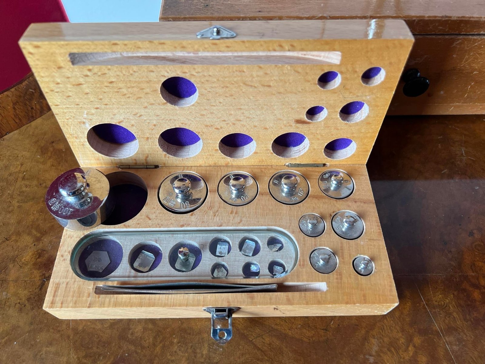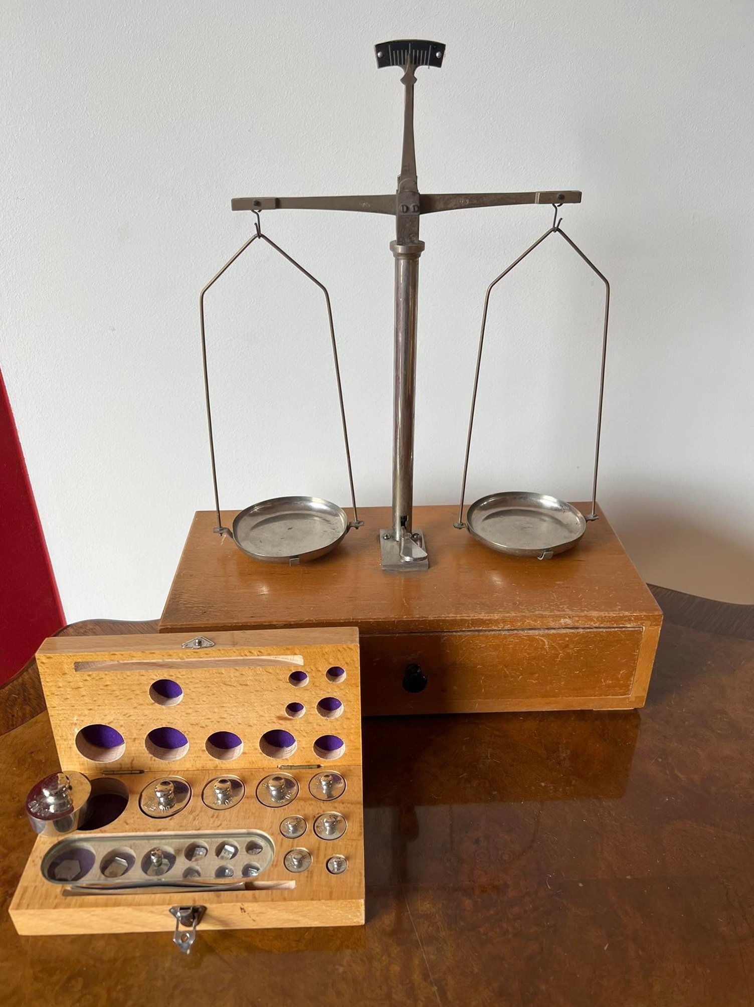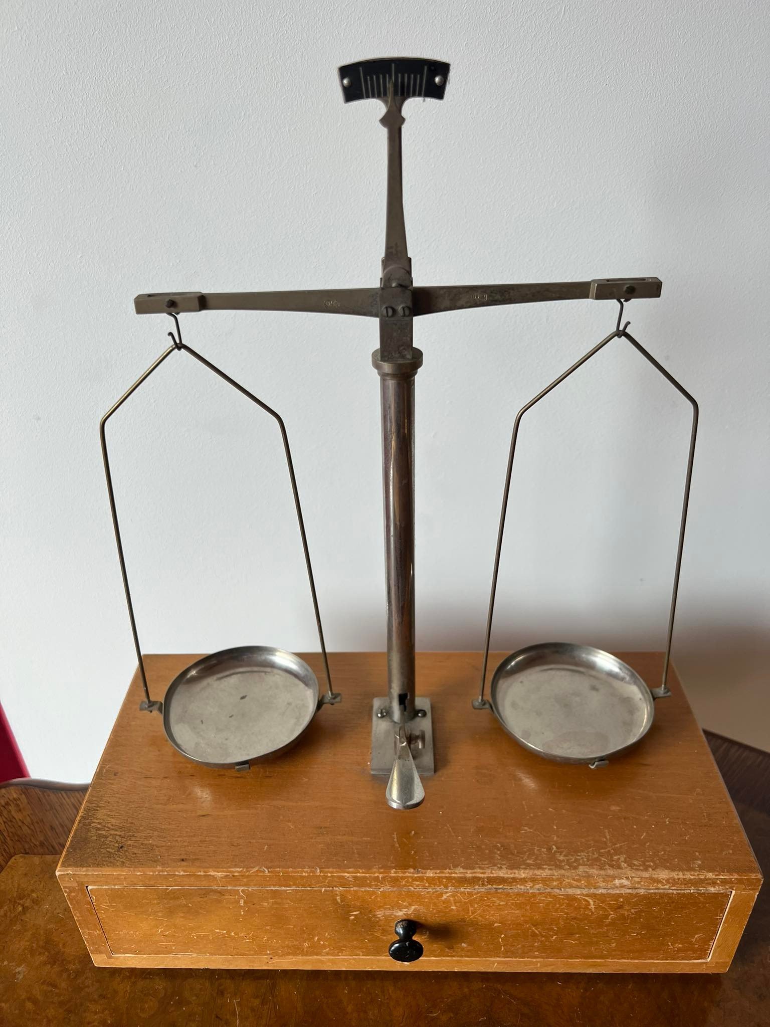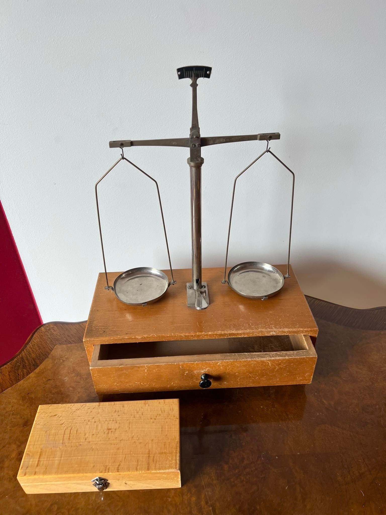 Svarstyklės su stalčiuku bei svareliais vintažinės. Prabuotos. Vokietija. Kaina 87 už viską.