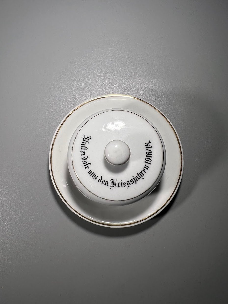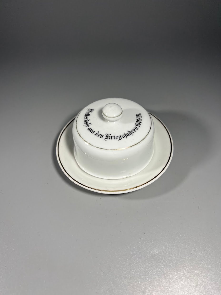 Sviestinė antikvarinė Butterdose aus den Kriegsjahren 1916/18. Sviestinė iš 1916–1918 metų karo metų, porcelianinė. Vokietija, I PK. Kaina 78