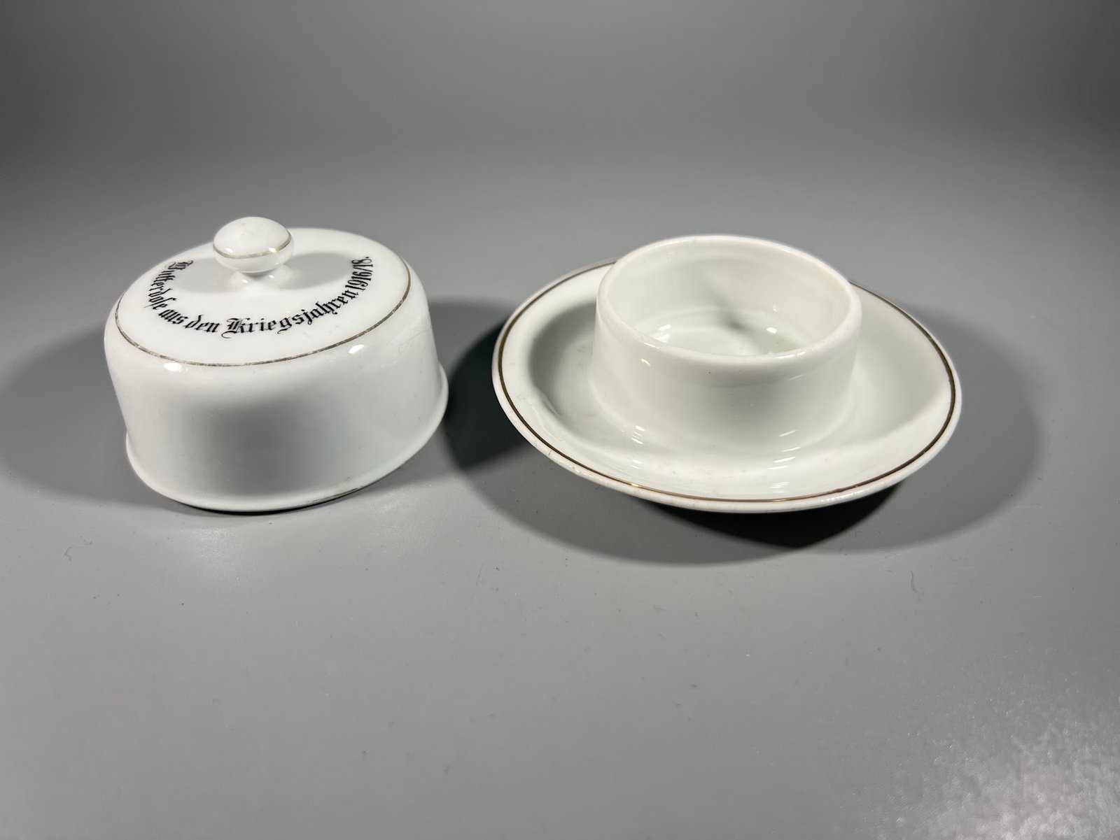 Sviestinė antikvarinė Butterdose aus den Kriegsjahren 1916/18. Sviestinė iš 1916–1918 metų karo metų, porcelianinė. Vokietija, I PK. Aukštis 6, skersmuo 9 cm. Kaina 78