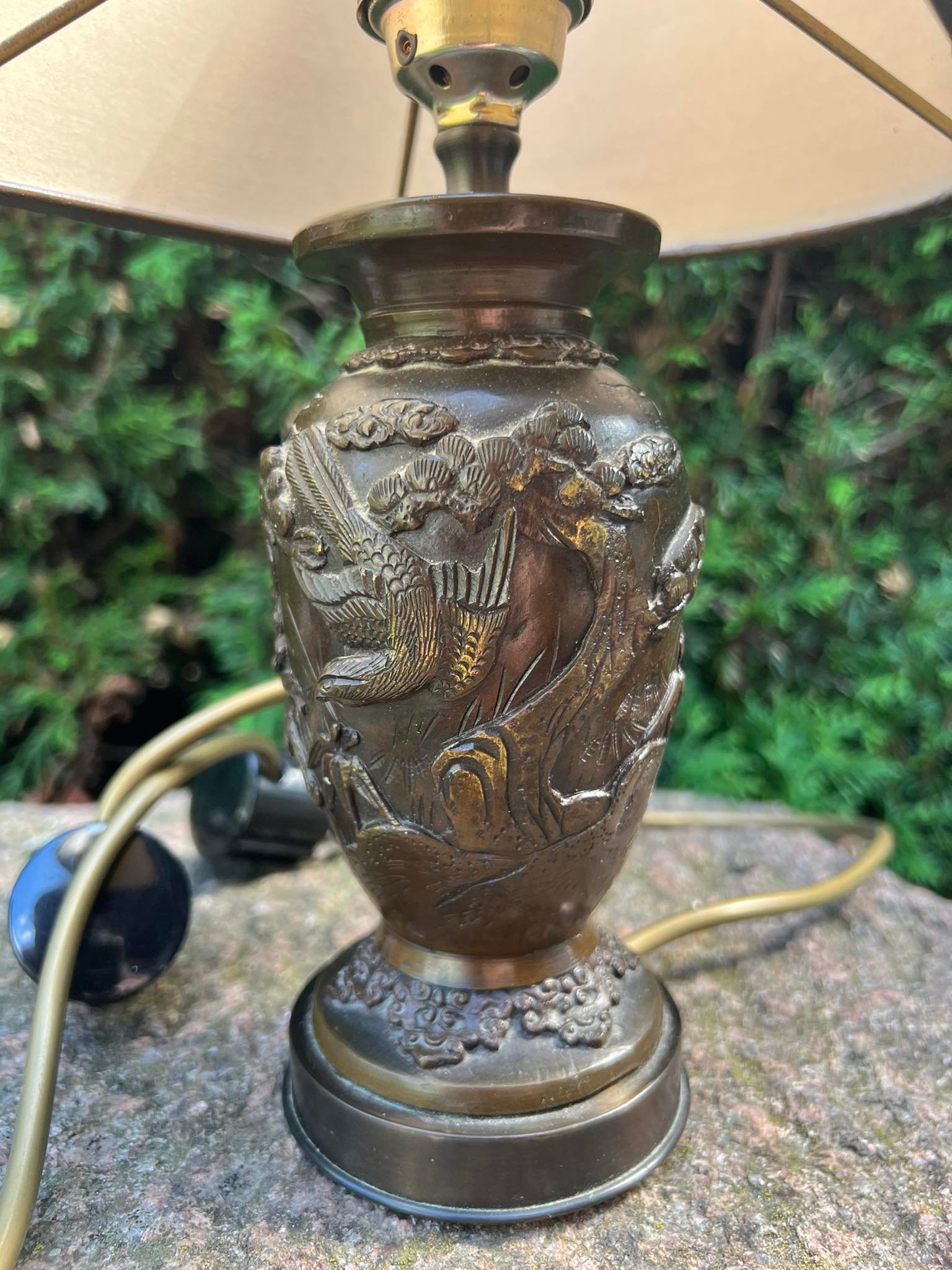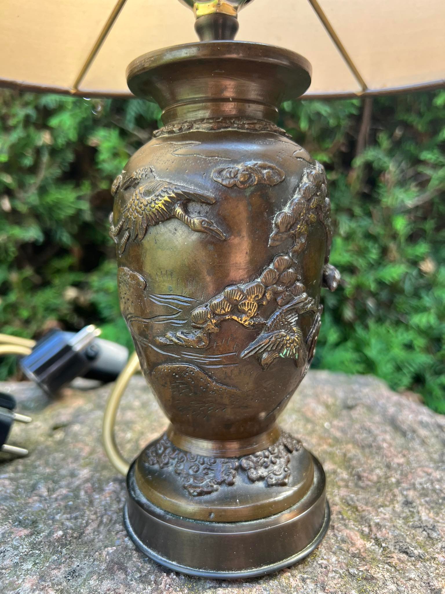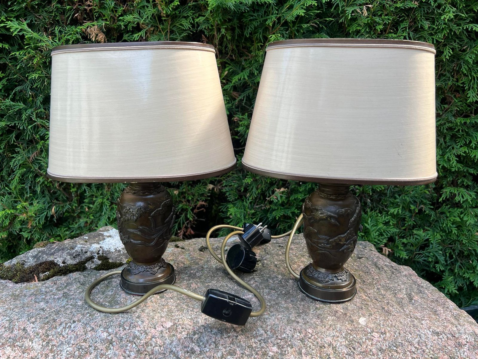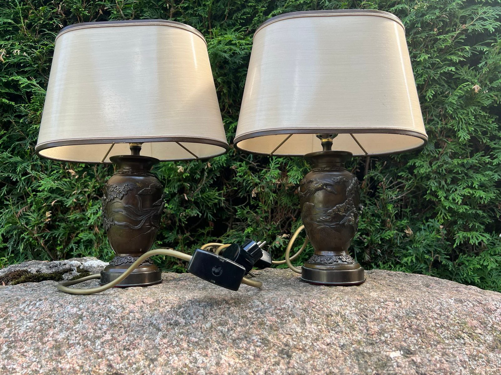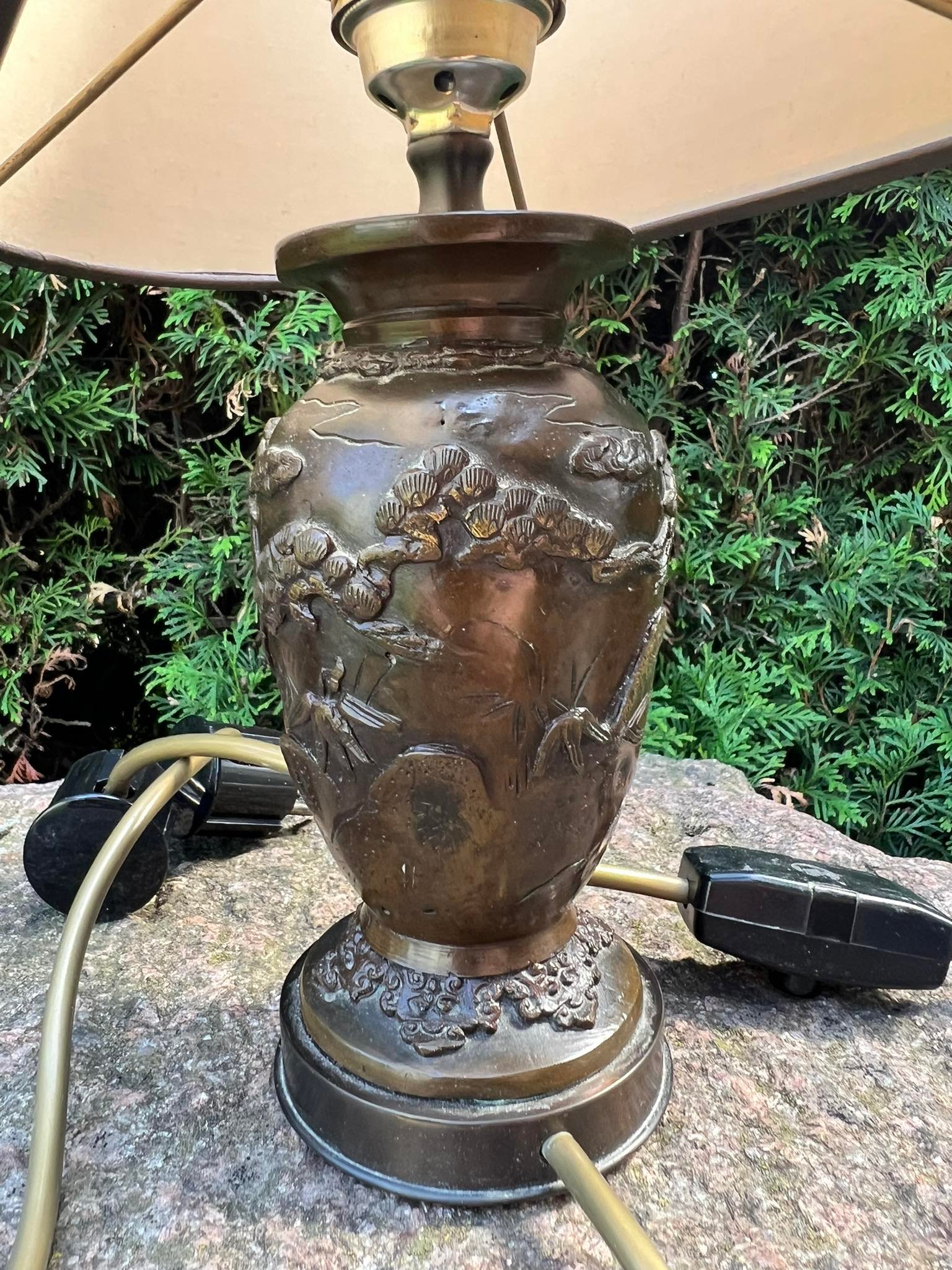 Šviestuvai, naktinės lempos variniais reljefiniais piešiniais, japoniškais motyvais. Veikiantys. 2 vnt. Aukštis 34 cm. Parduodami kartu. Kaina po 88