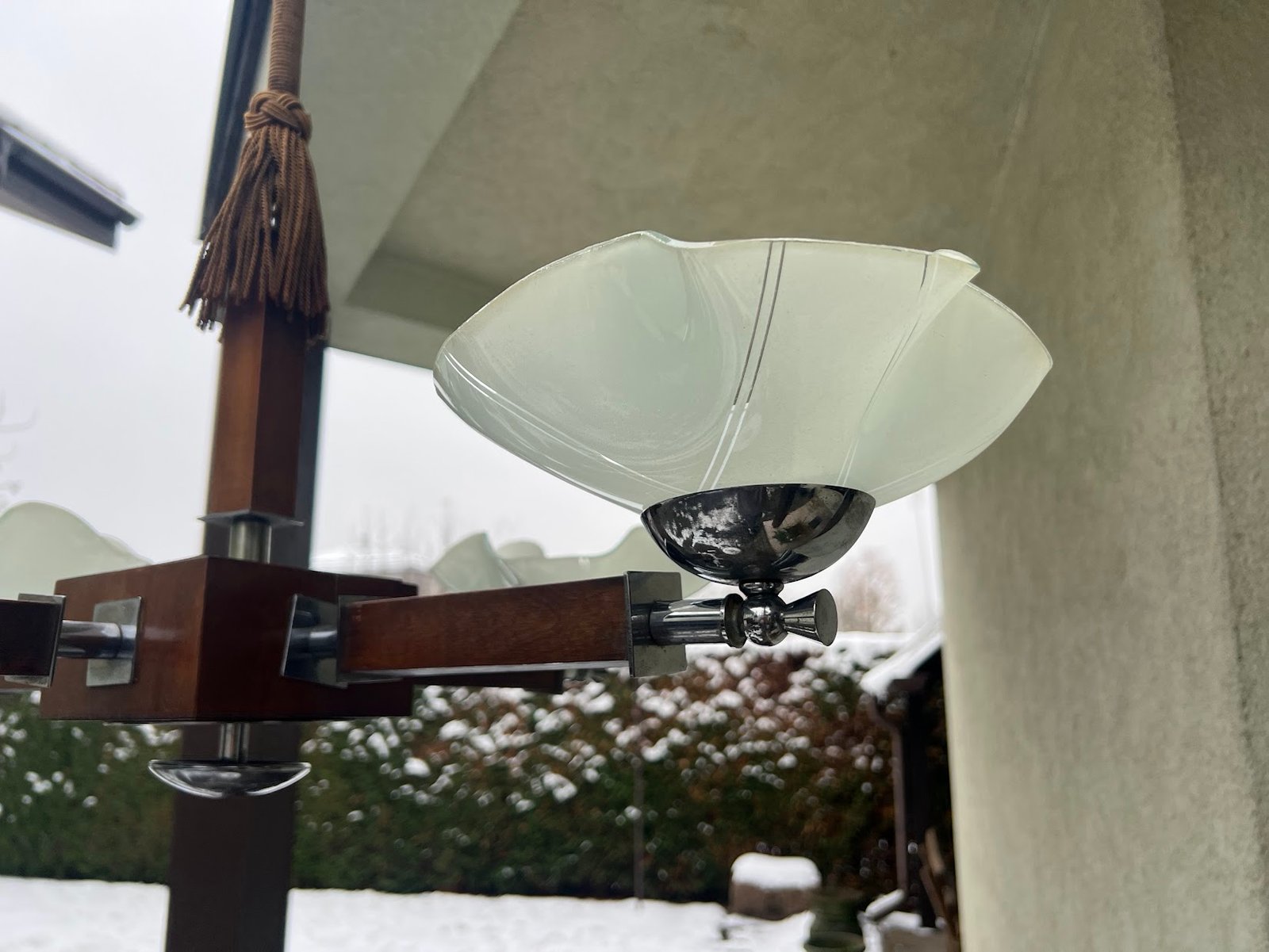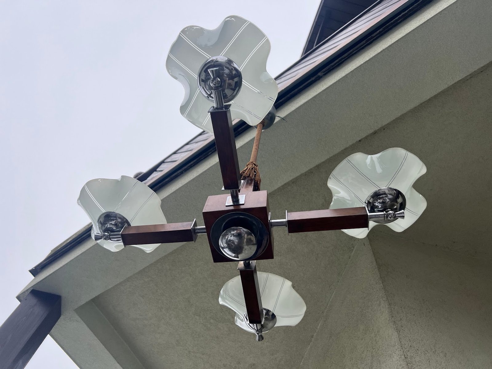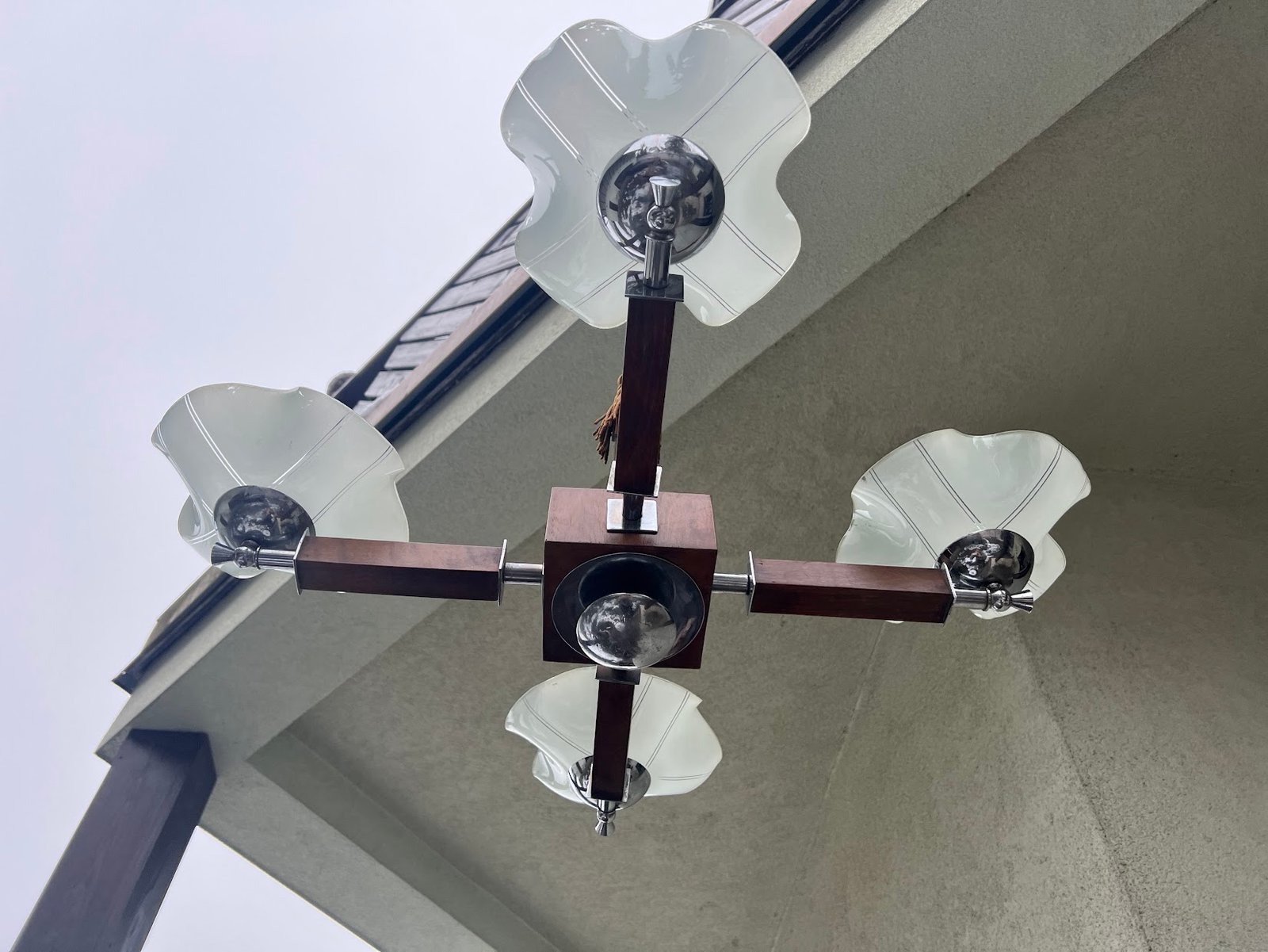 Šviestuvas antikvarinis Art Deco stiliaus, 1930-1940 m. Aukštis 82, skersmuo 78 cm. Medis, nikeliuotas žalvaris. Kaina 258