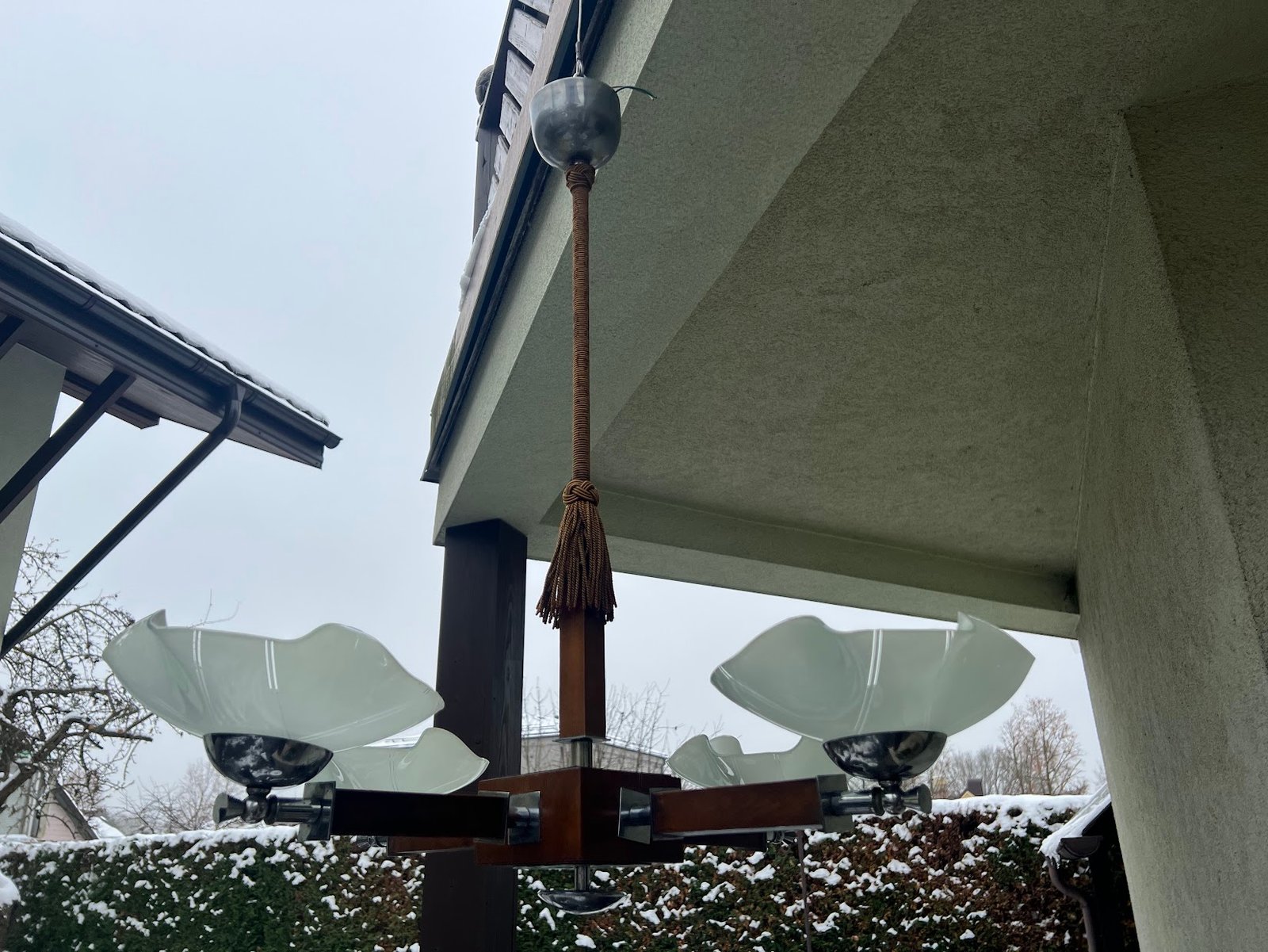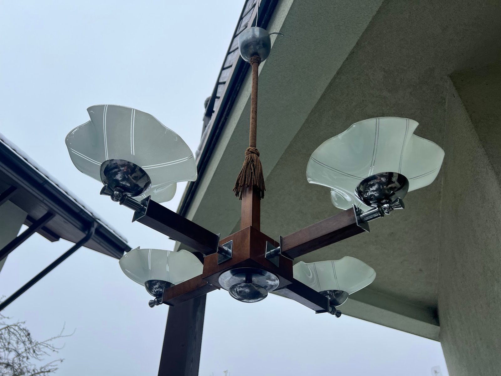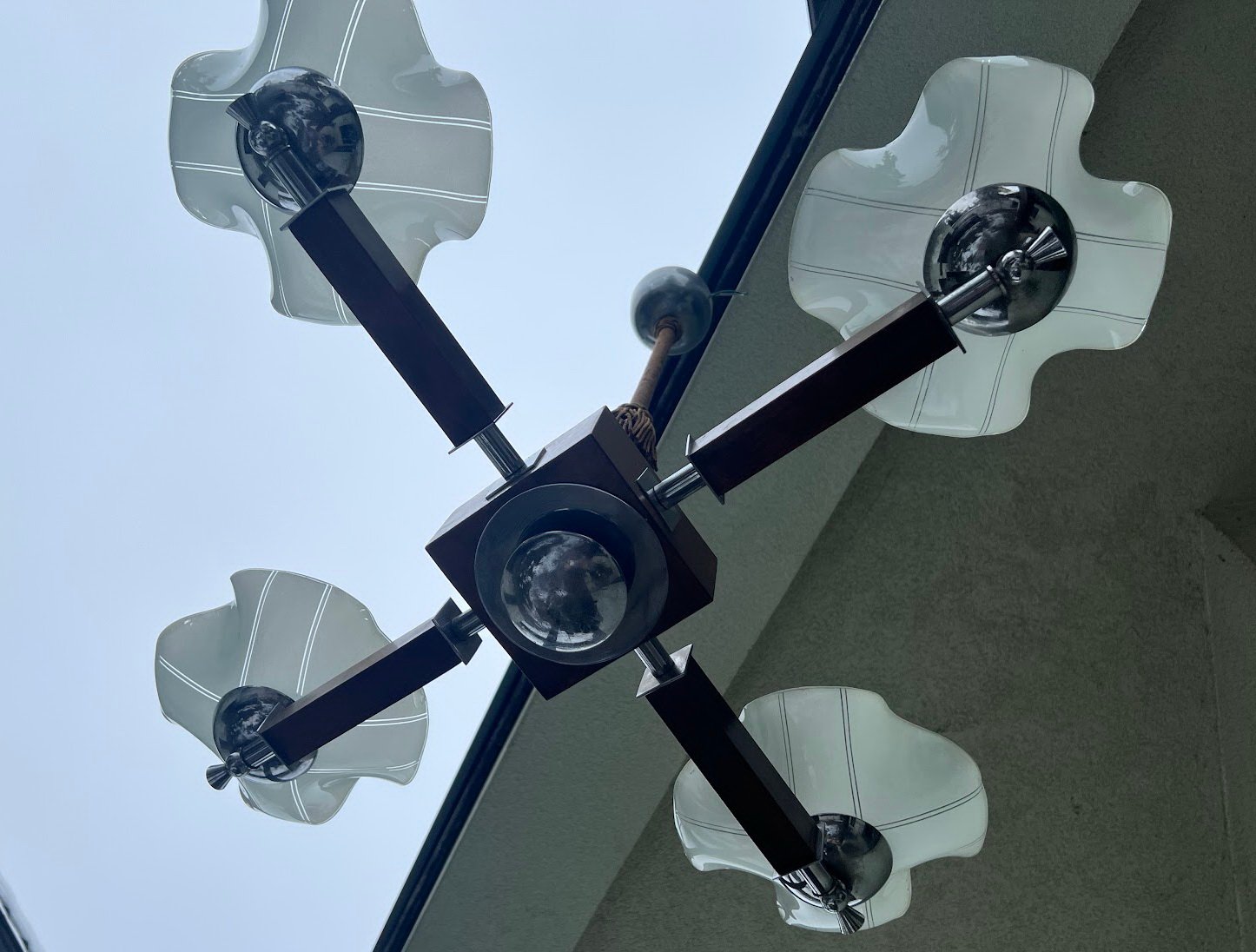 Šviestuvas antikvarinis Art Deco stiliaus, 1930-1940 m. Aukštis 82, skersmuo 78 cm. Medis, nikeliuotas žalvaris. Kaina 258