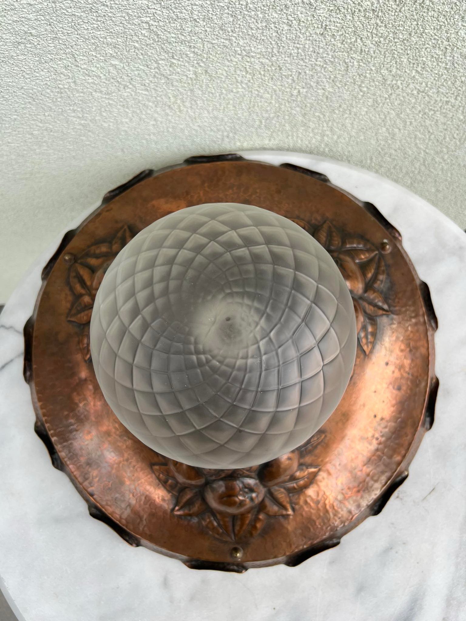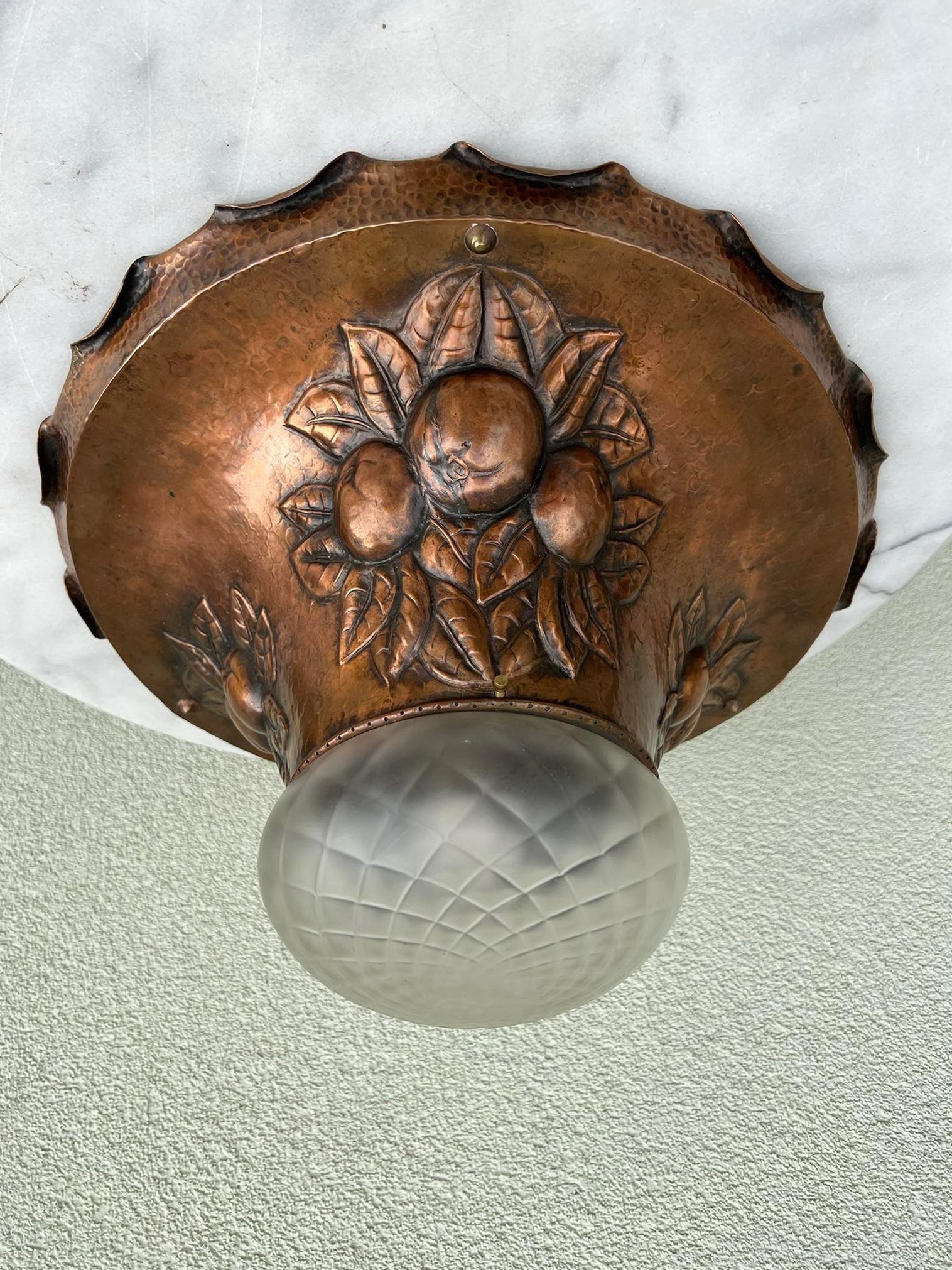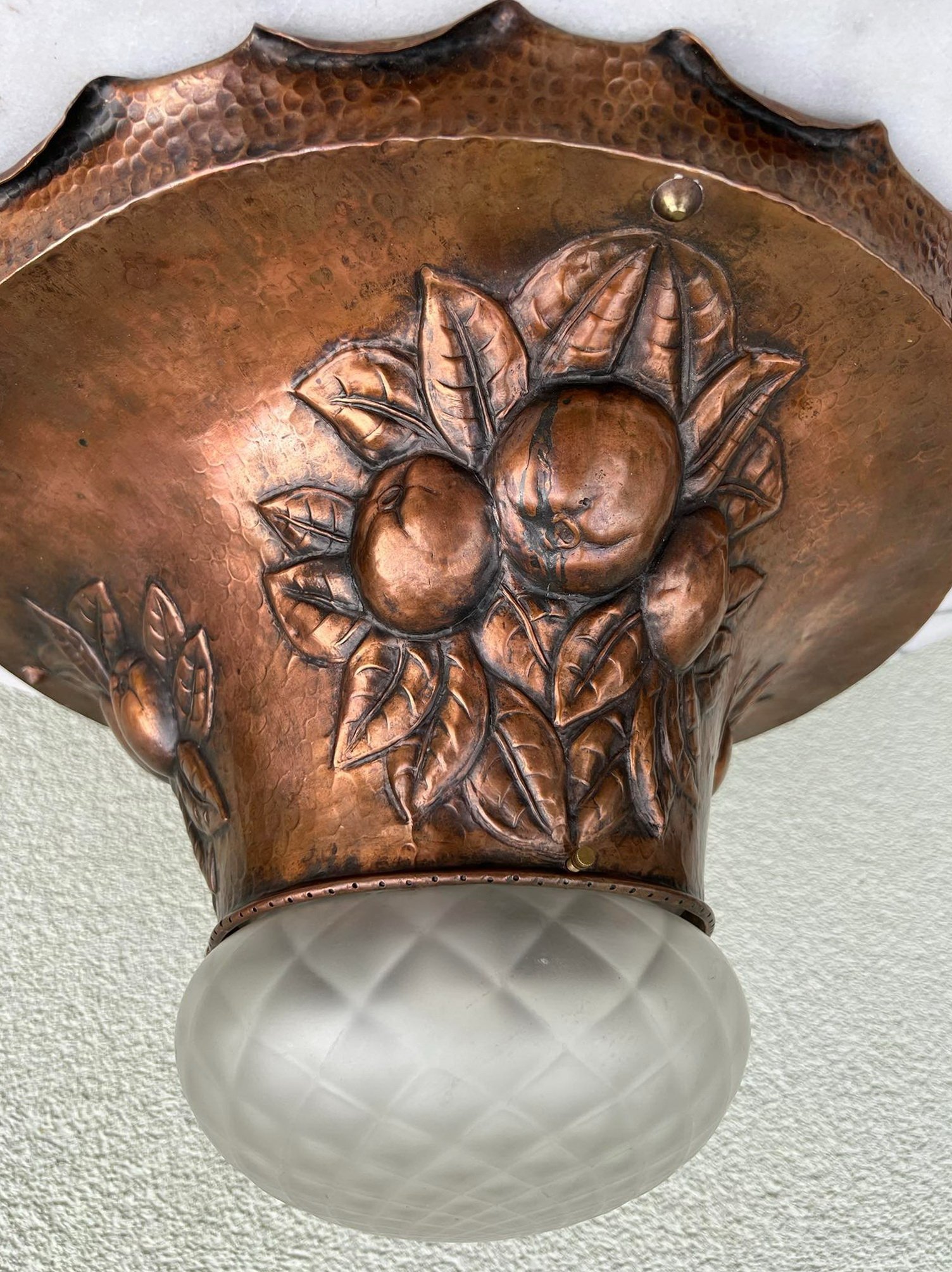 Šviestuvas antikvarinis, Secesijos stiliaus. Varis, kaltinis, reljefinias piešiniais, raižytas stiklas. Aukštis 25, skersmuo 45 cm. Kaina 193