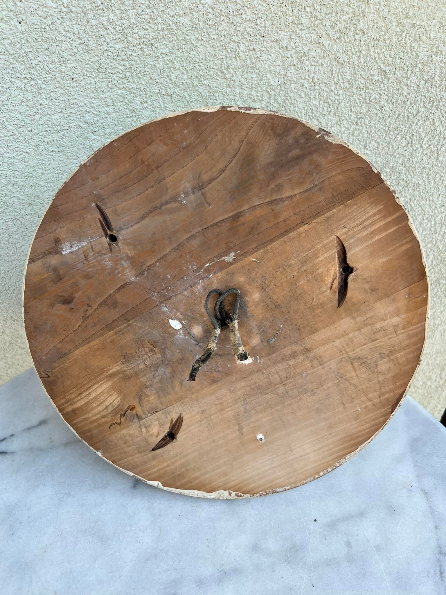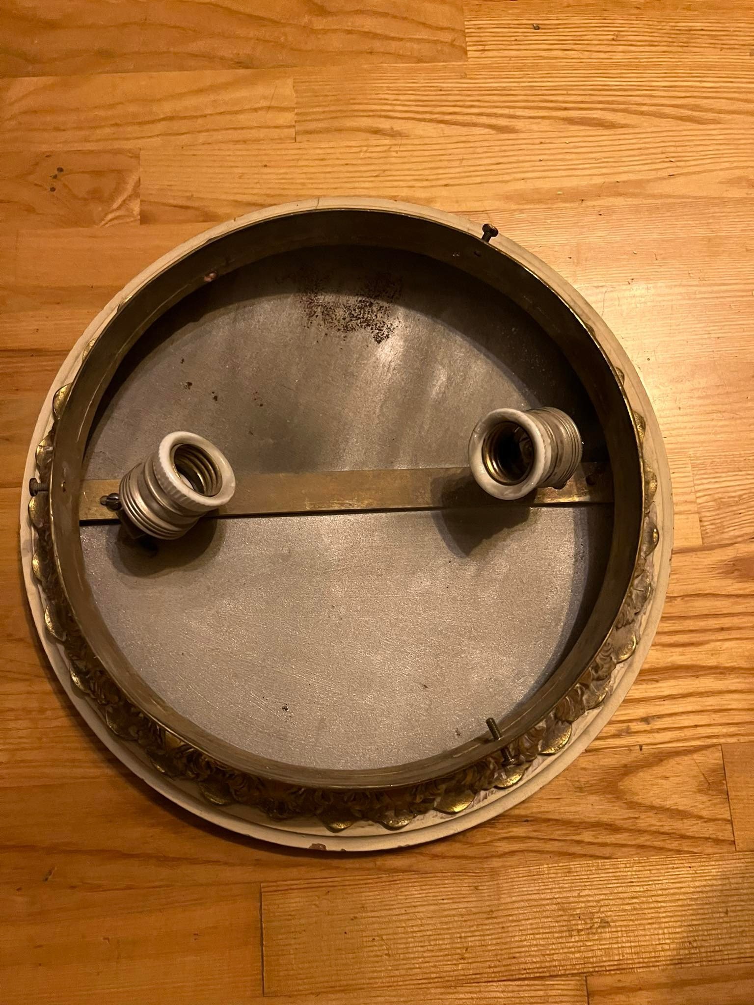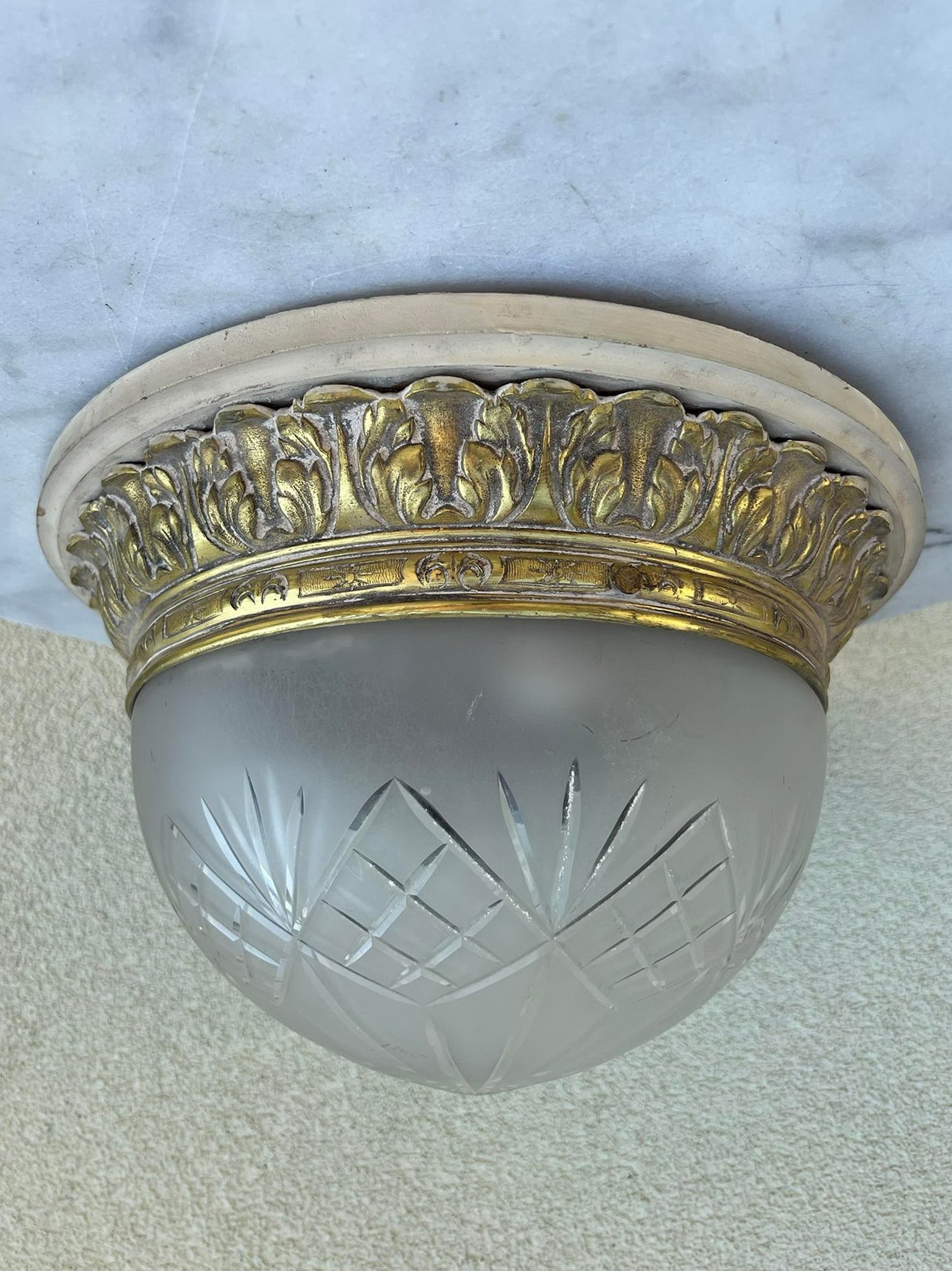 Šviestuvas antikvarinis, tarpukario laikų, bronziniu pagrindu, raižytu stiklu, 2 lempų. Aukštis 20, skersmuo 32 cm. Medinį pagrindą galima nuimti. Kaina 187