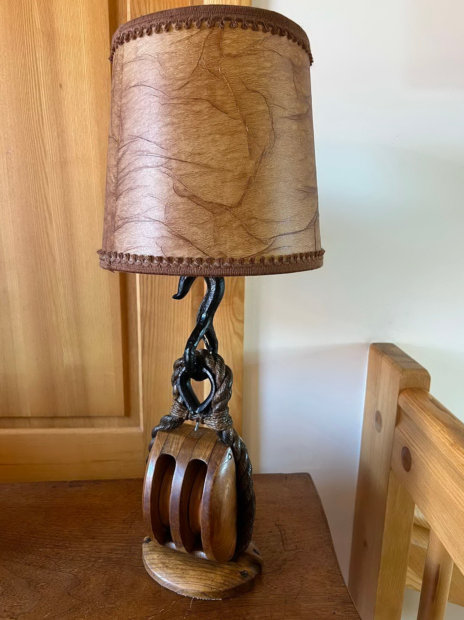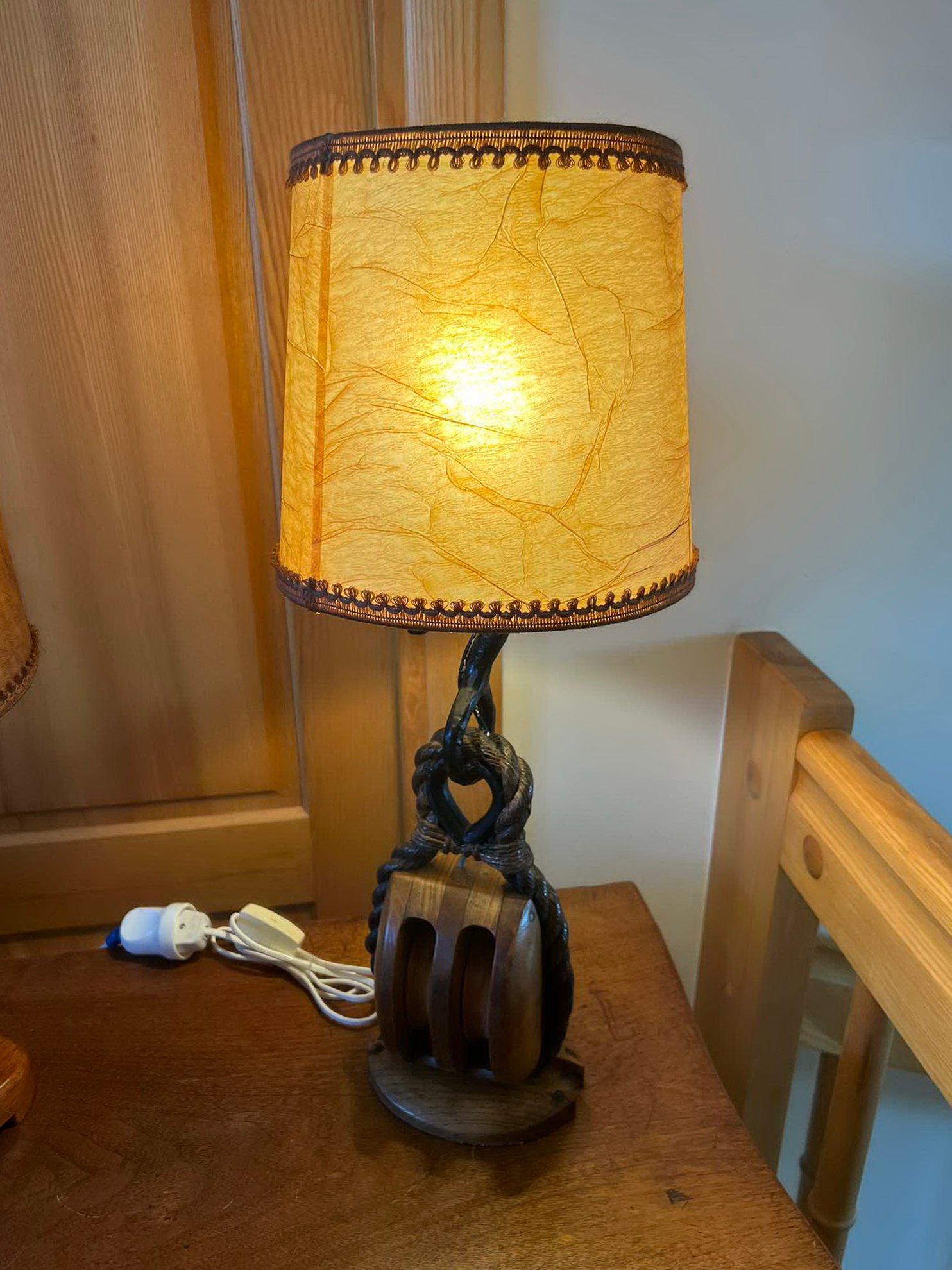 Šviestuvas, toršeras, stalinė lempa jūrine tematika, pagaminta iš originalių burlaivio dalių. 2 vnt. Aukštis 56 ir 60 cm. Kaina po 138