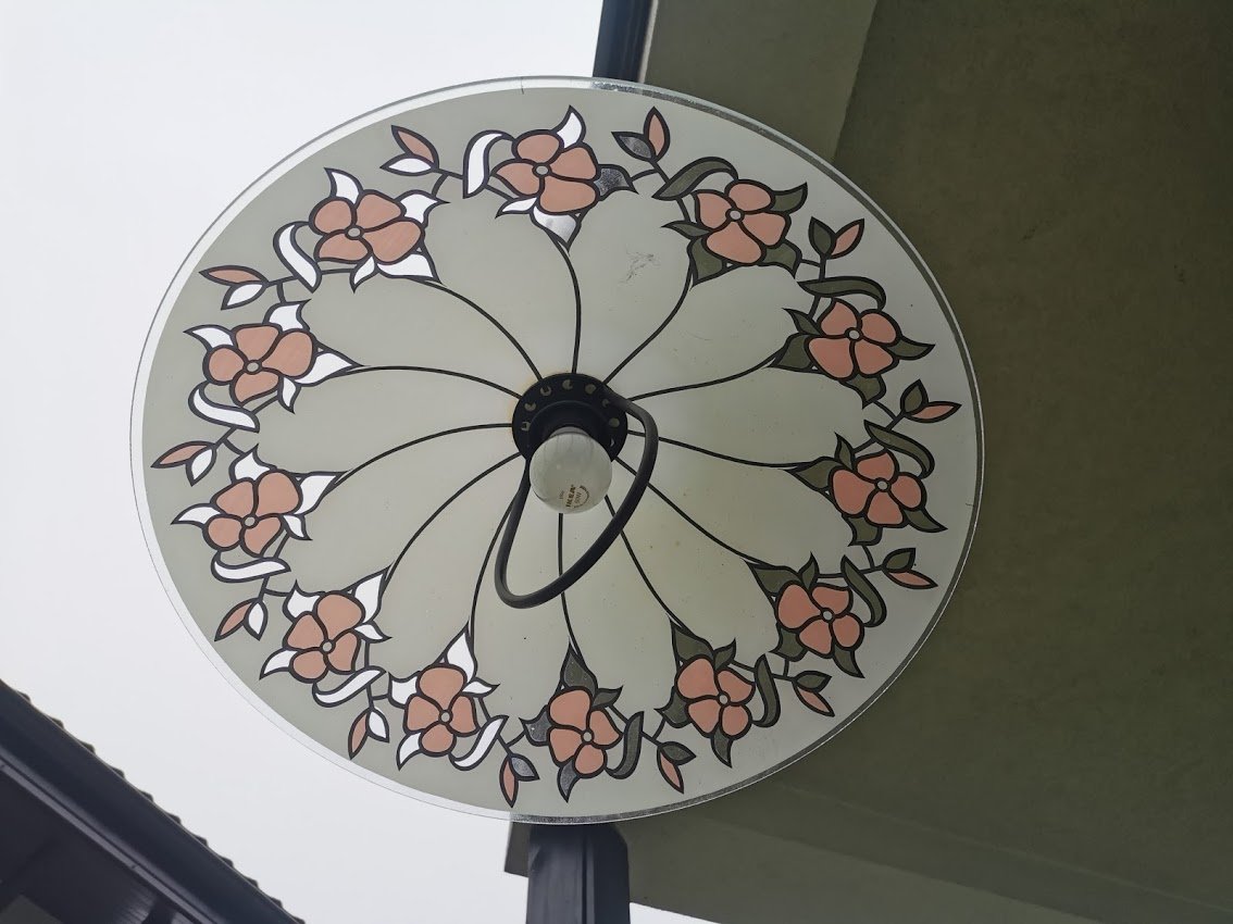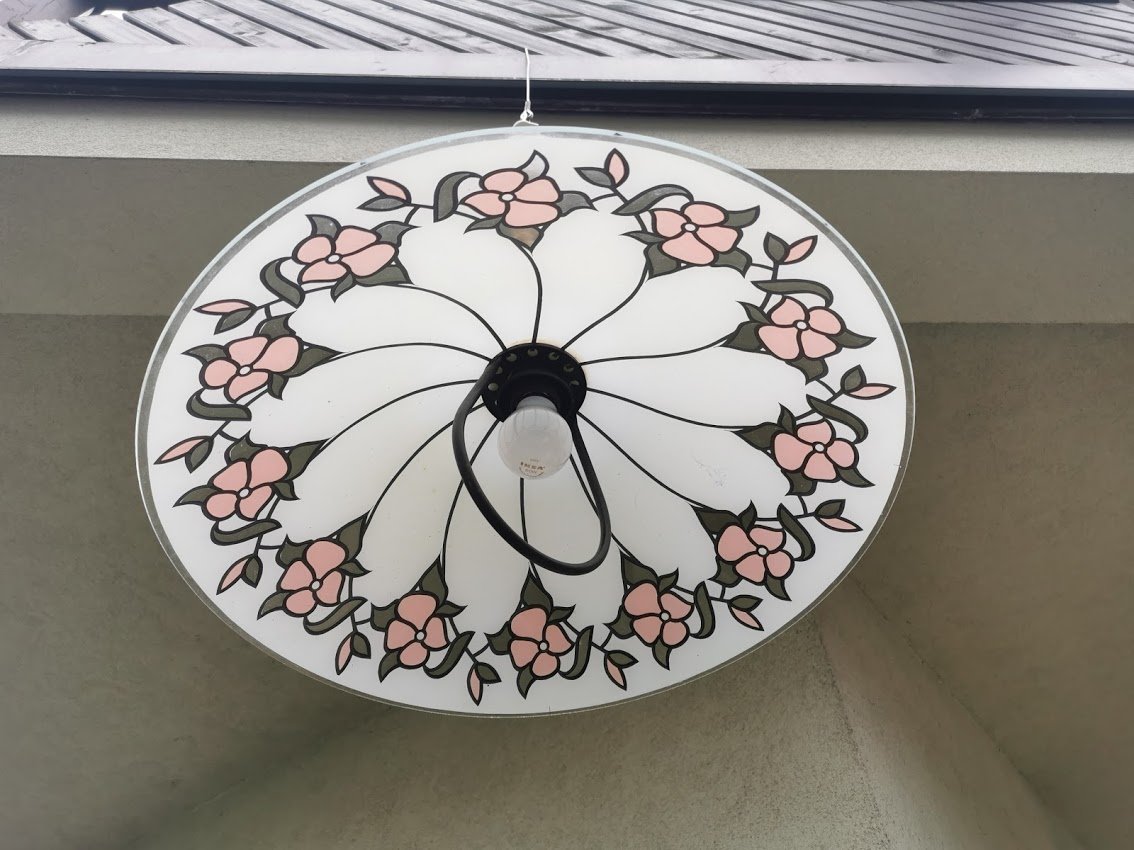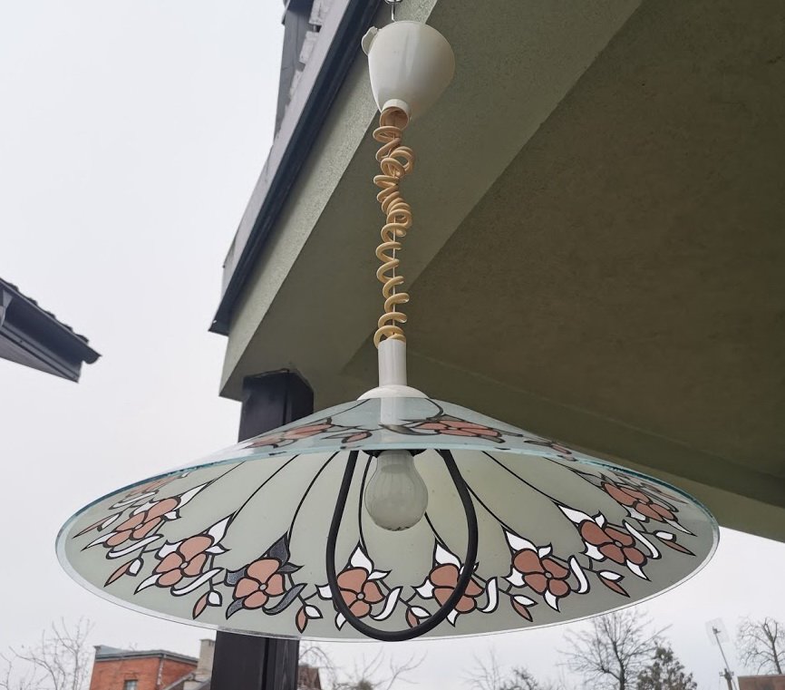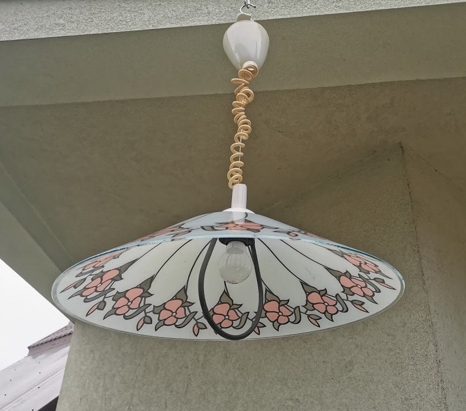 Šviestuvas vintažinis, stikliniu gaubtu, reguliuojamo aukščio, skandinaviškas. Gaubto skersmuo 50, aukštis maždaug 70 cm. Kaina 53