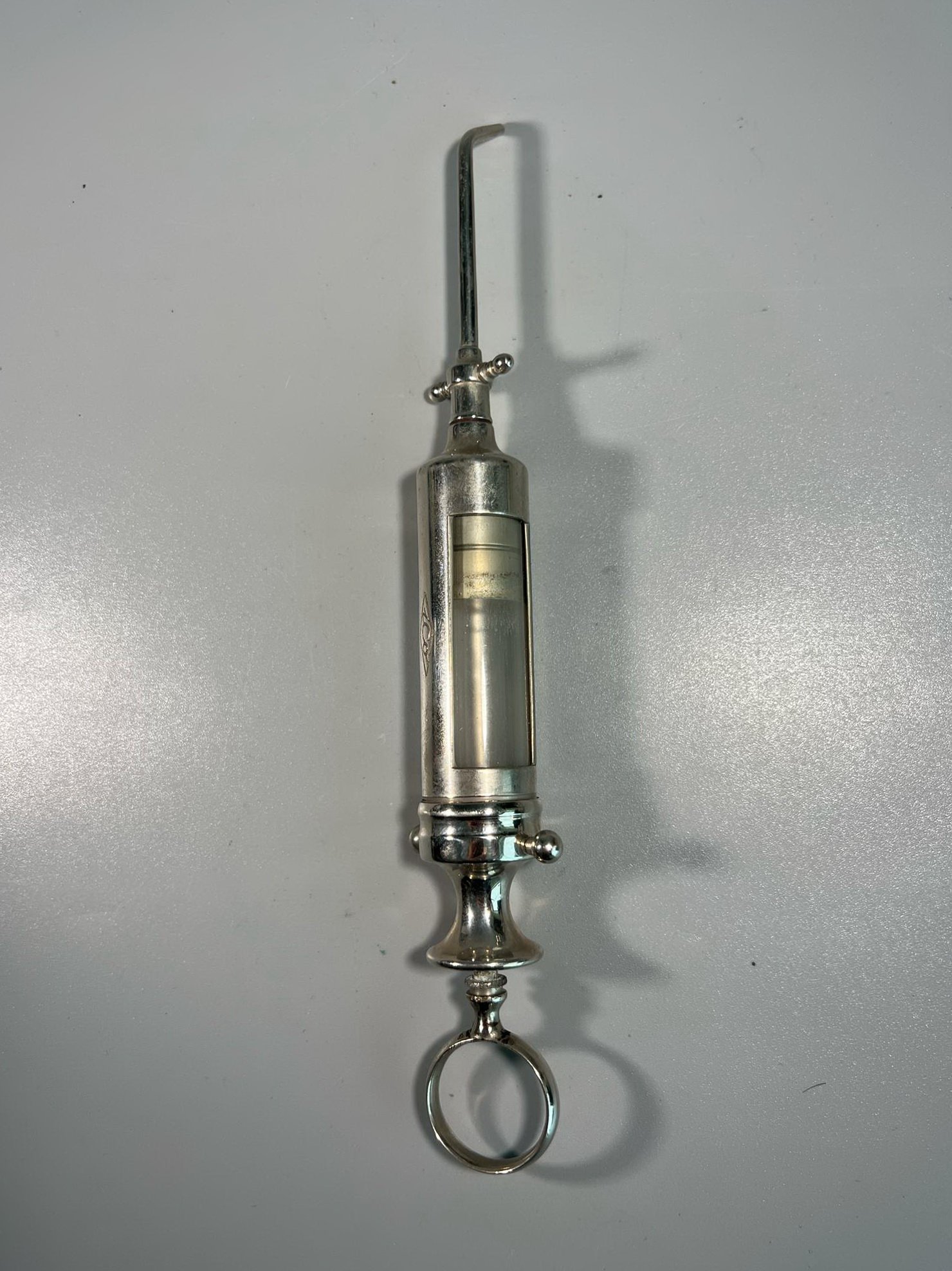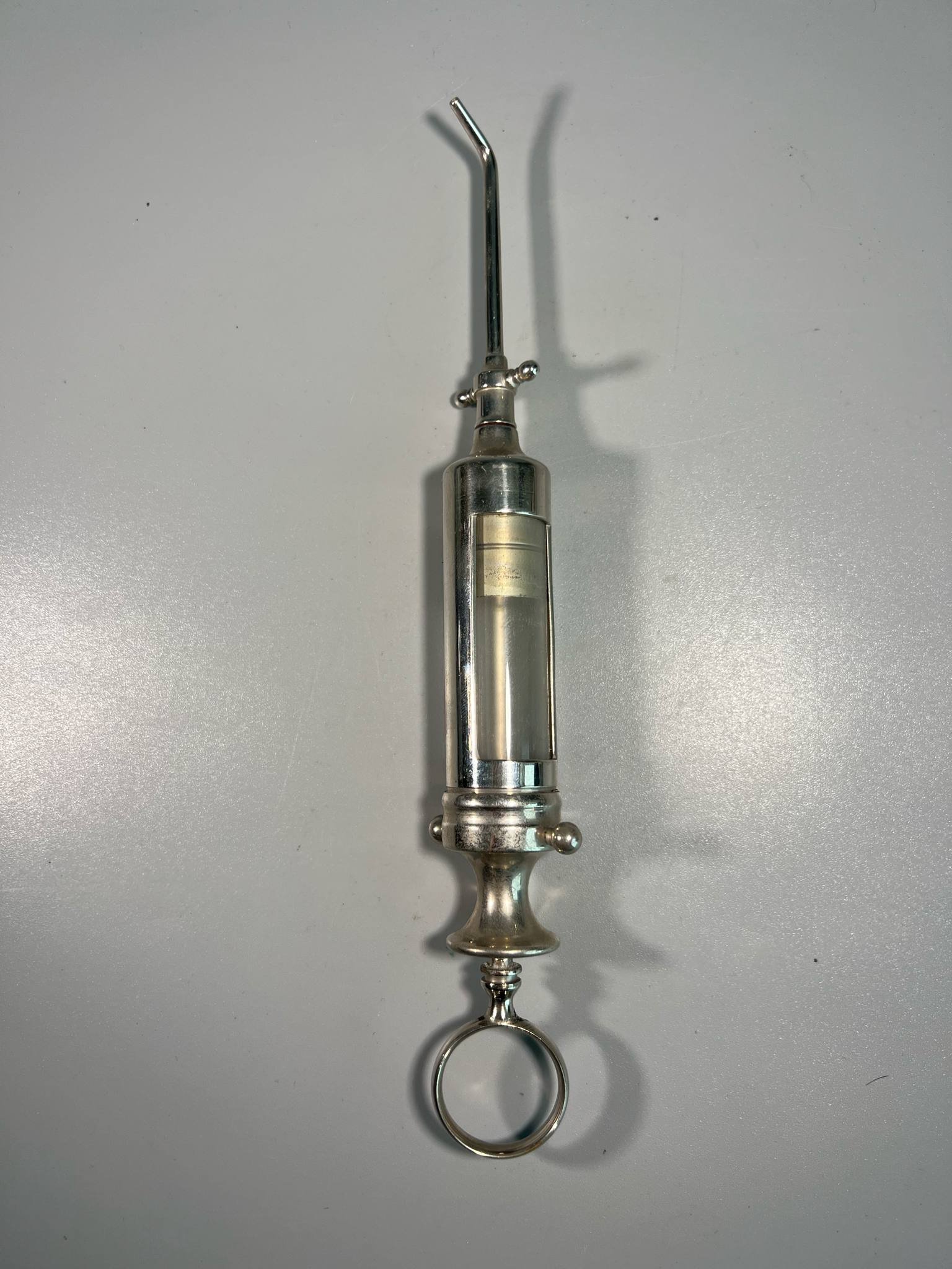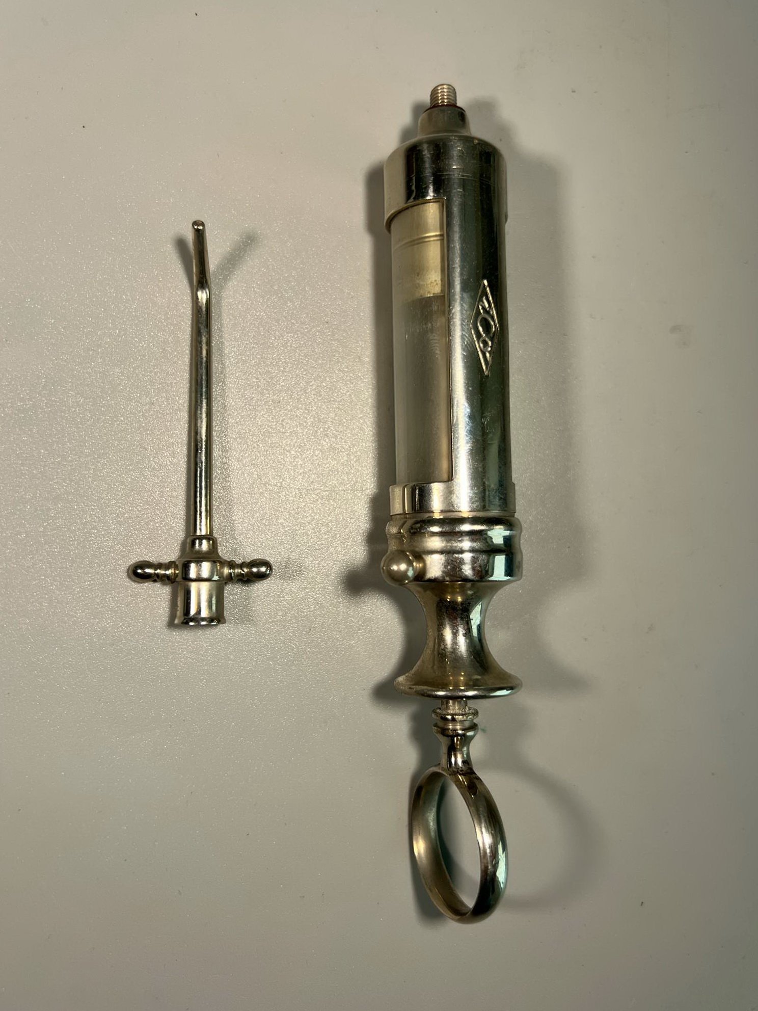 Švirkštas chirurginis, antikvarinis, ICo pagamintas „The Kny-Scheerer Corporation”. JAV. XX a. pr. Ilgis viso 21 cm. Kaina 48