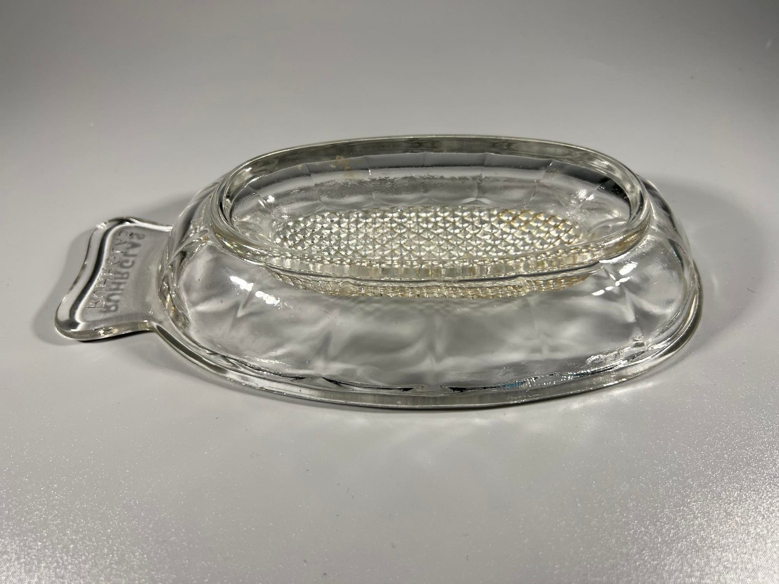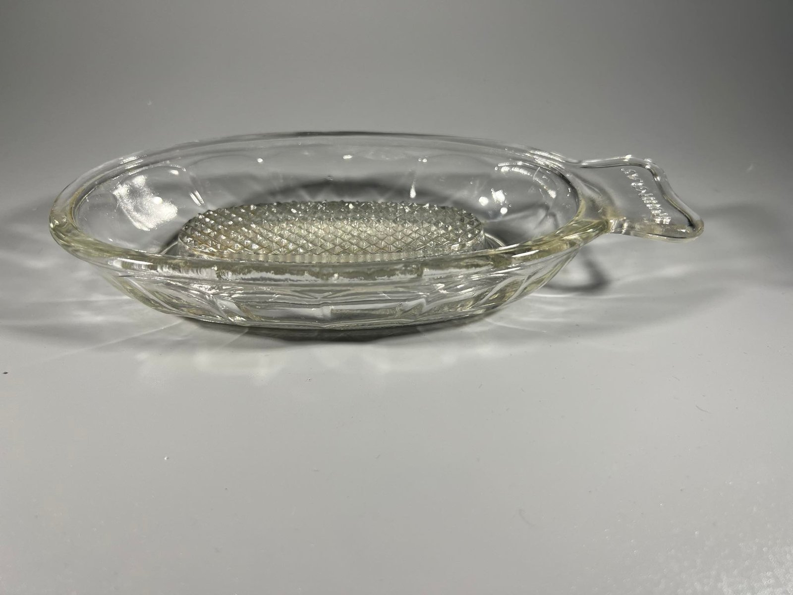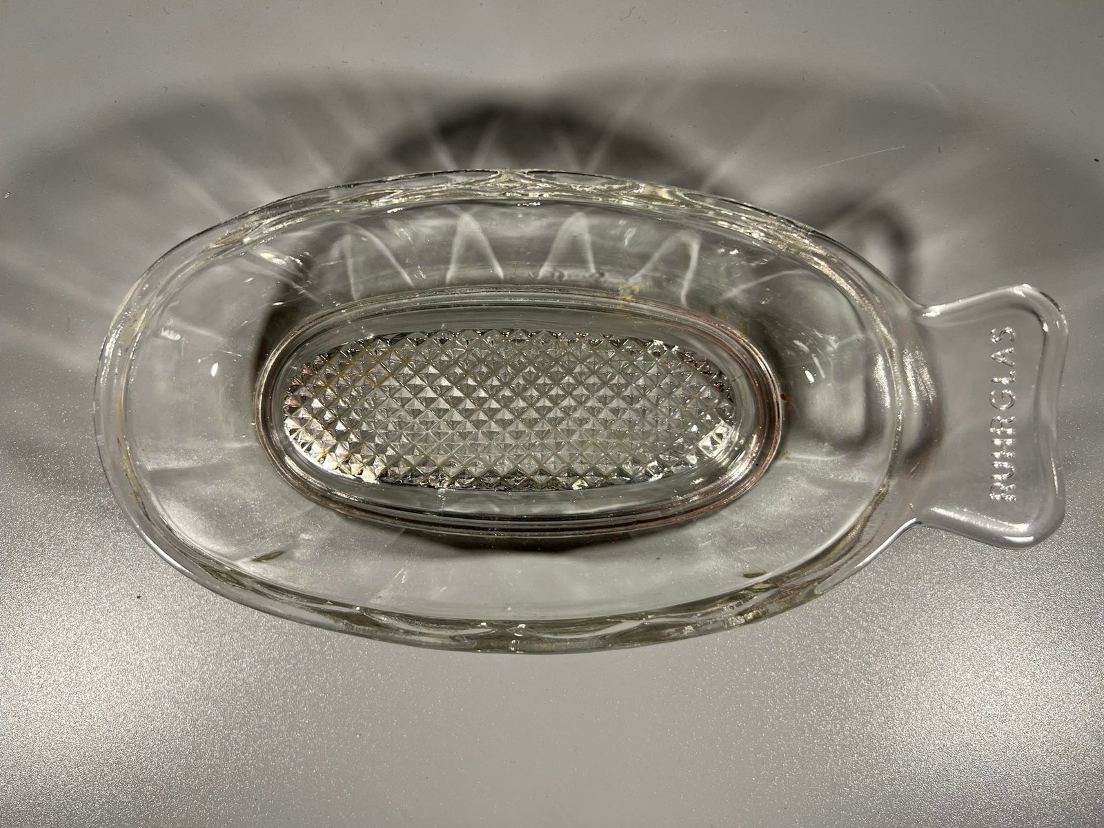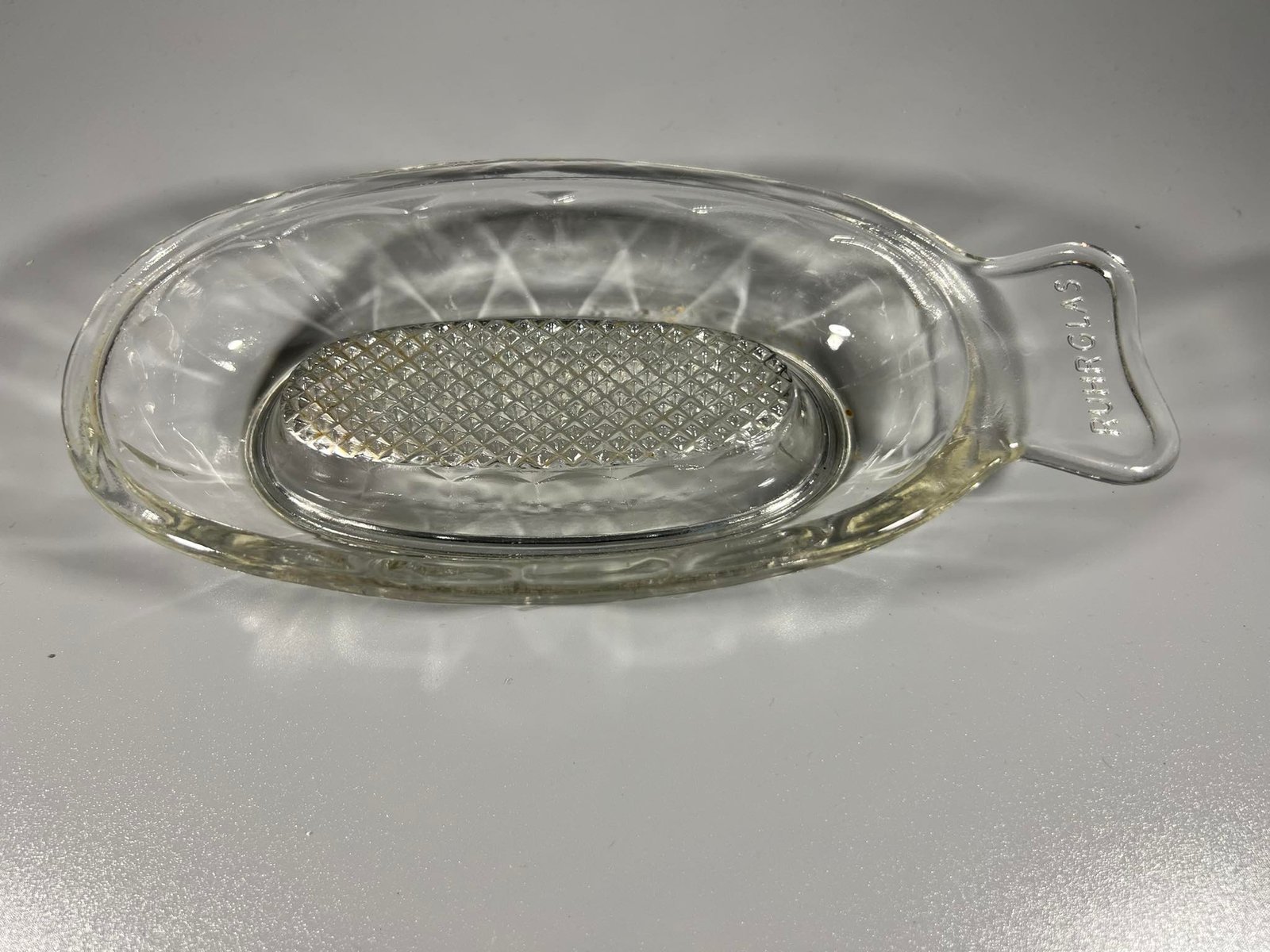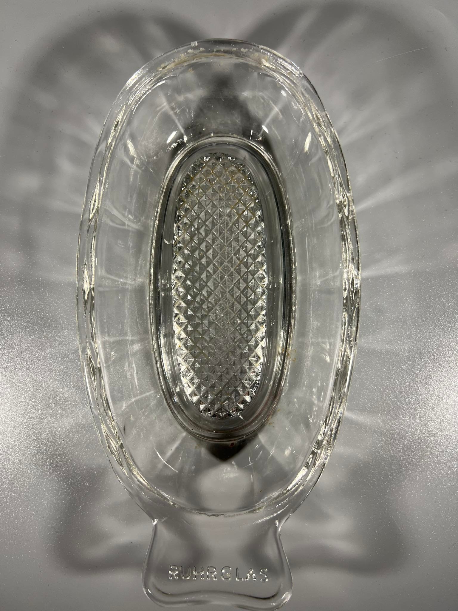 Trintuvė presuoto stiklo RUHRGLAS antikvarinė, vokiška skirta kūdikių maistui, sūriui, citrusiniams vaisiams, daržovėms, vaisiams. Ilgis 19, plotis 10, aukštis 3 cm. Kaina 28