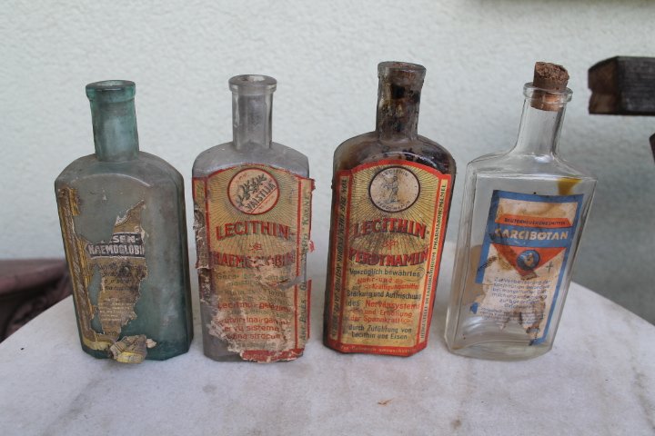 Tarpukario buteliai su vaistu etiketem. LIKO TIK PIRMAS. Kaina 9