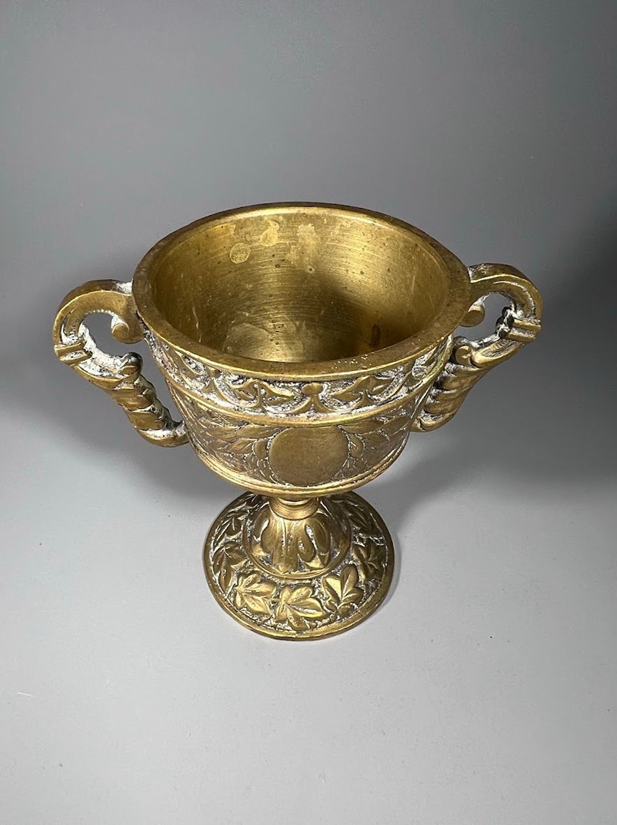 Taurė bronzinė, žalvarinė su rankenomis, antikvarinė. Aukštis 10 cm. Kaina 43