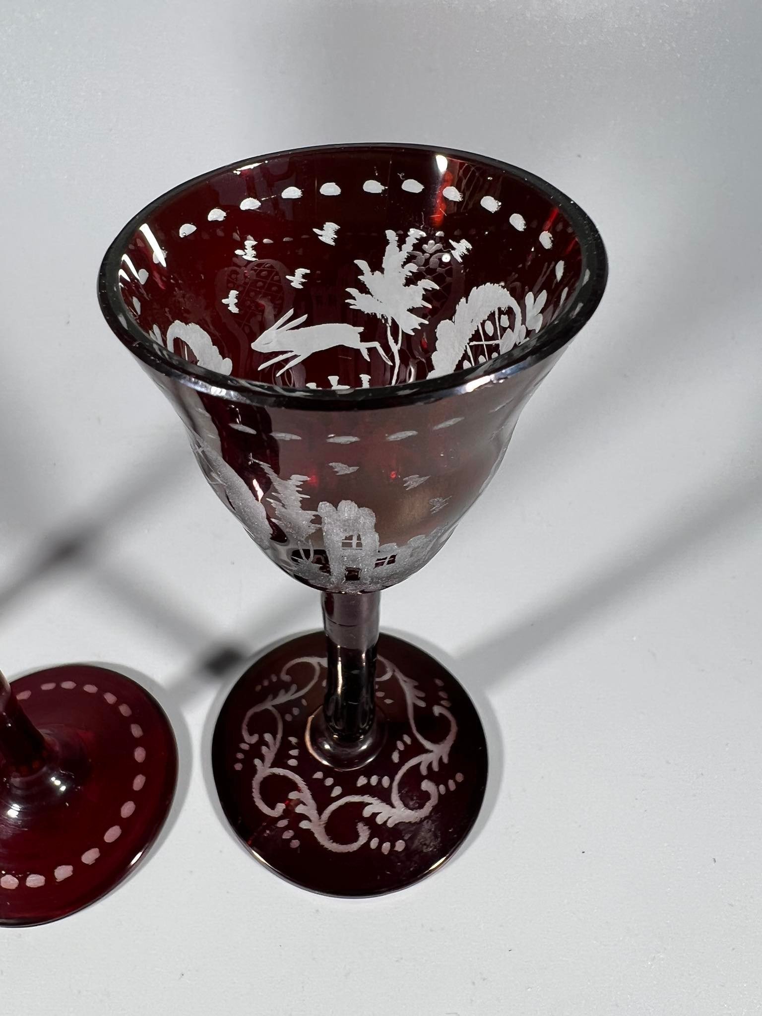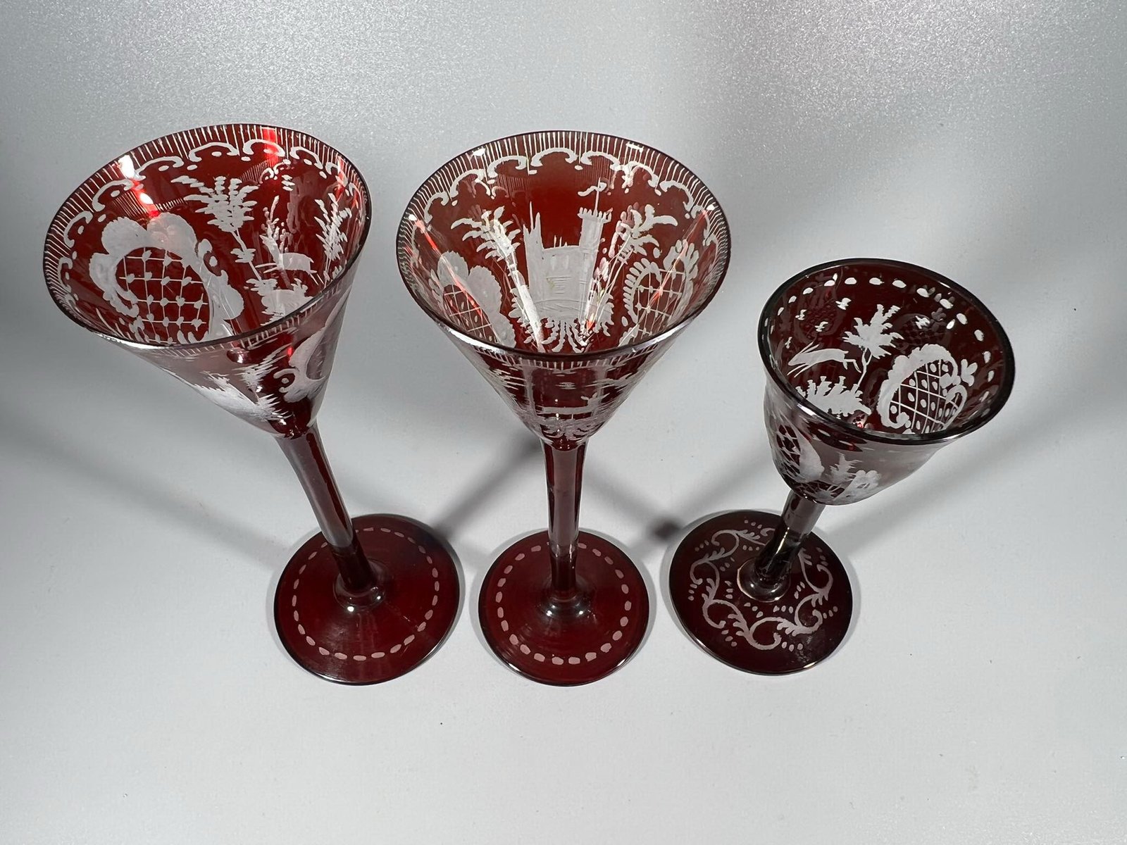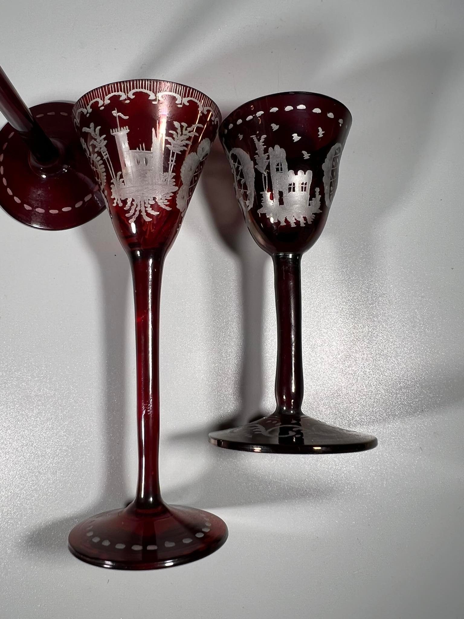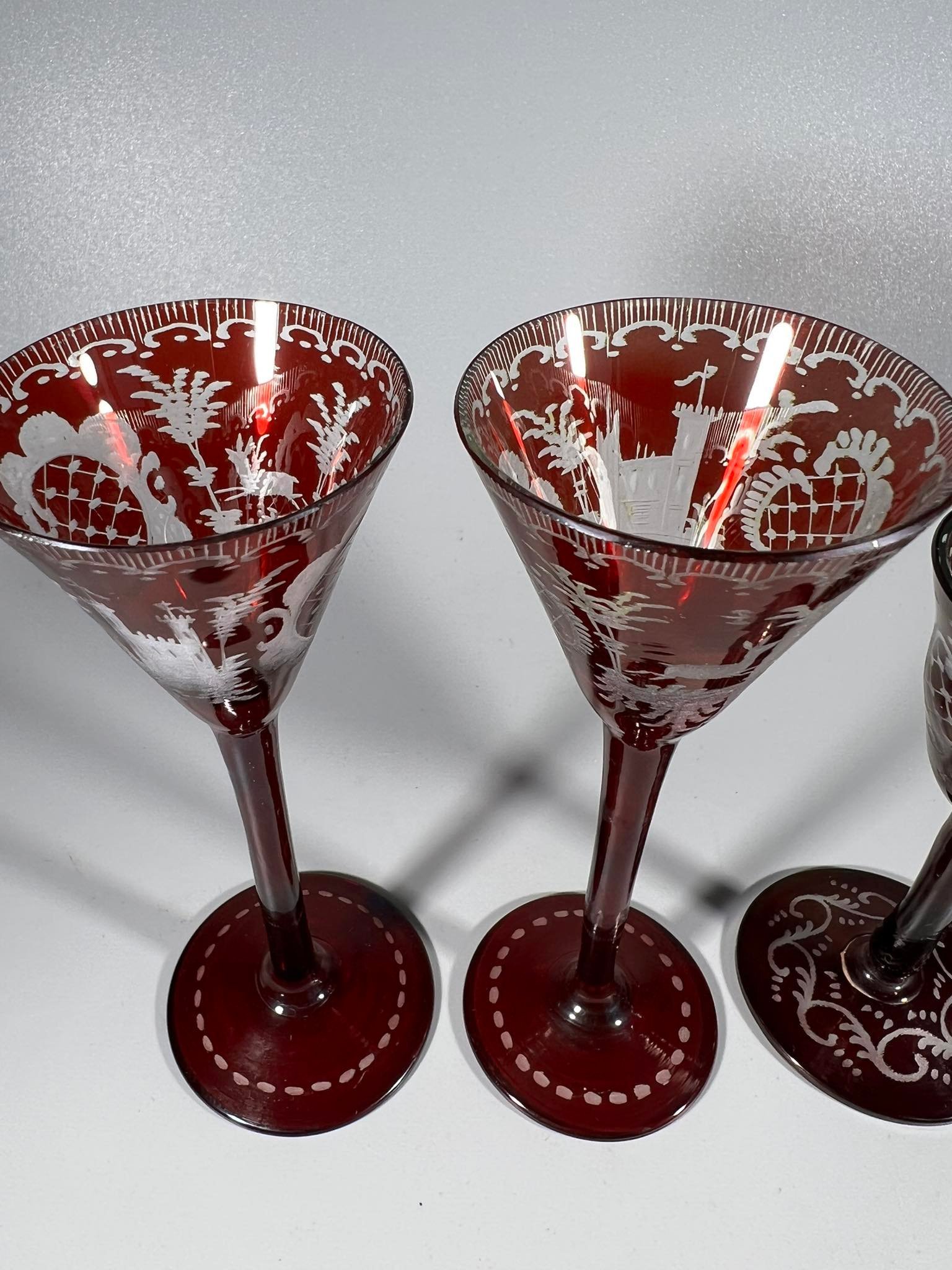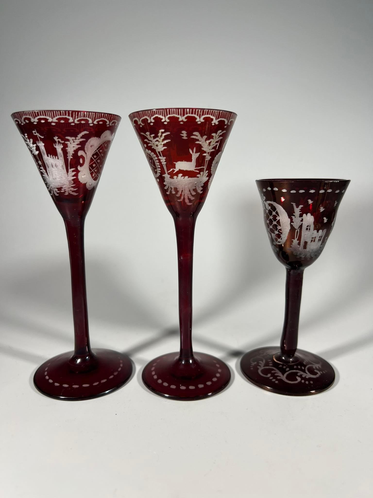 Taurelės antikvarinės, raudono, raižyto stiklo. Bohemia. 3 vnt. Talpa po 40 ml. Kaina po 26