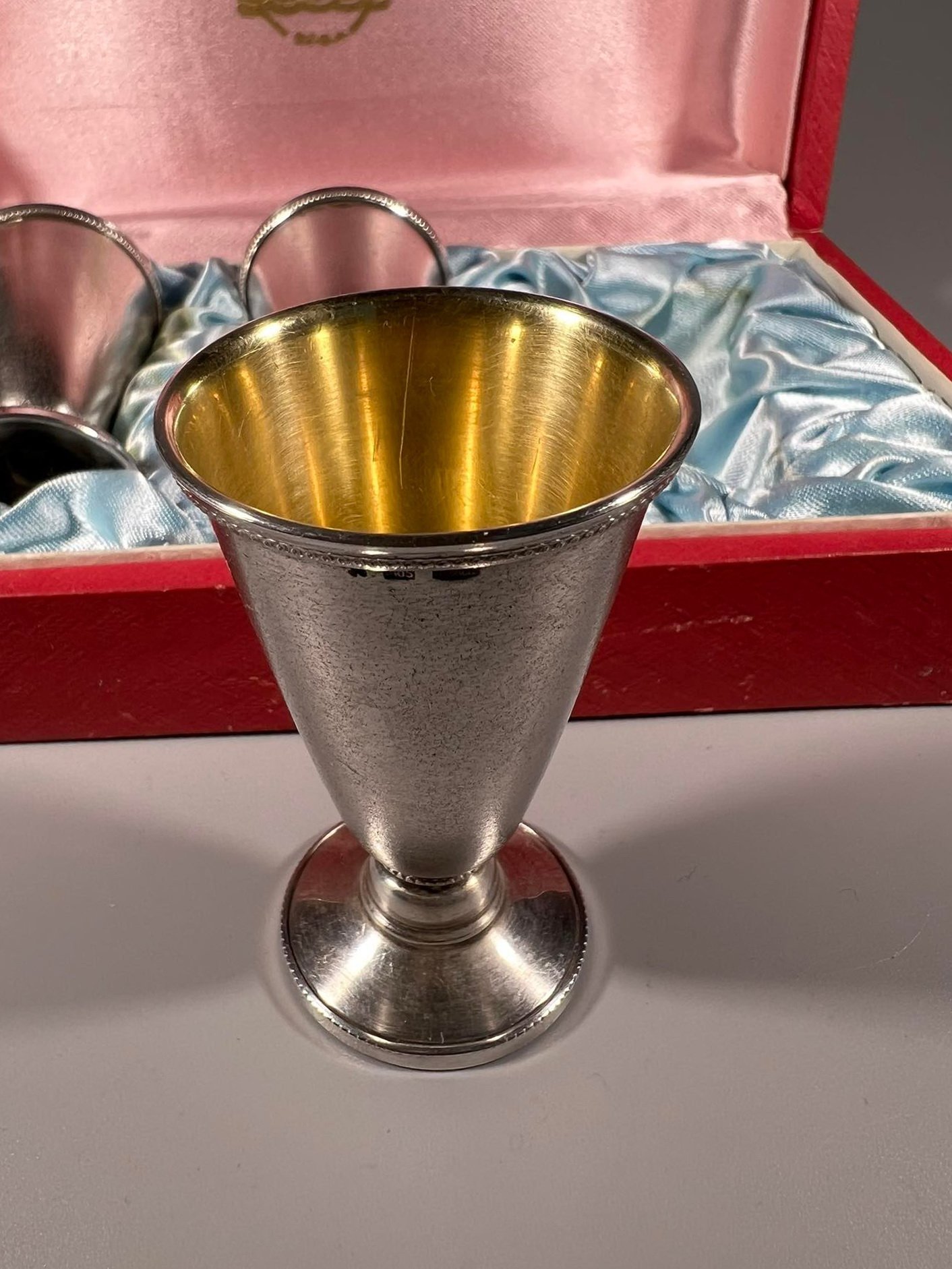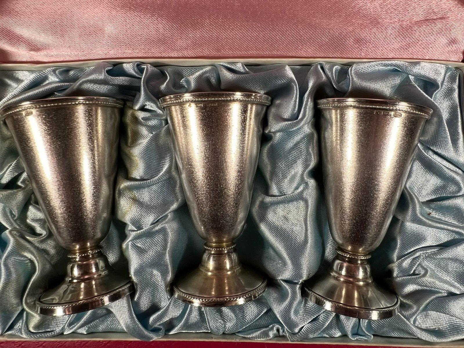 Taurelės, stikliukai ant kojelės sidabrinės dėžutėje, tarybiniai. Praba 875. Talpa 30 ml. 3 vnt. Visų svoris 90 gr. Kaina 236 už viską.
