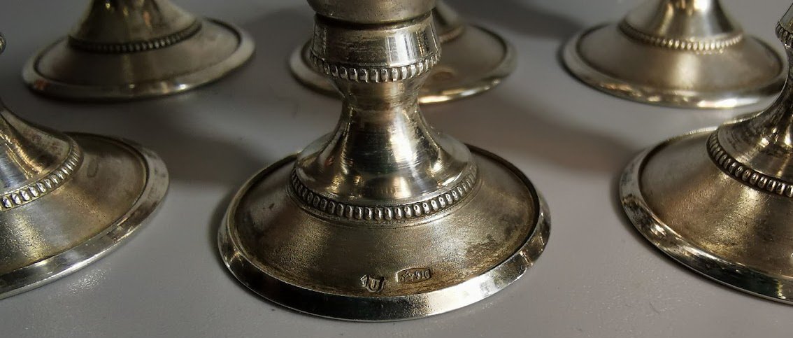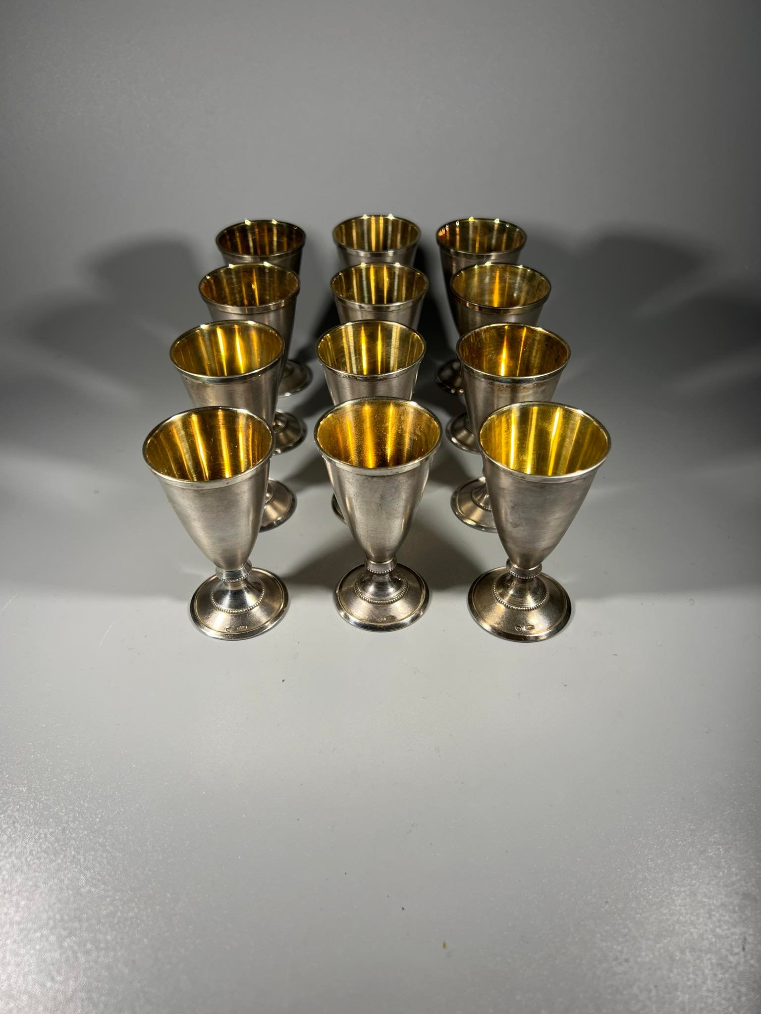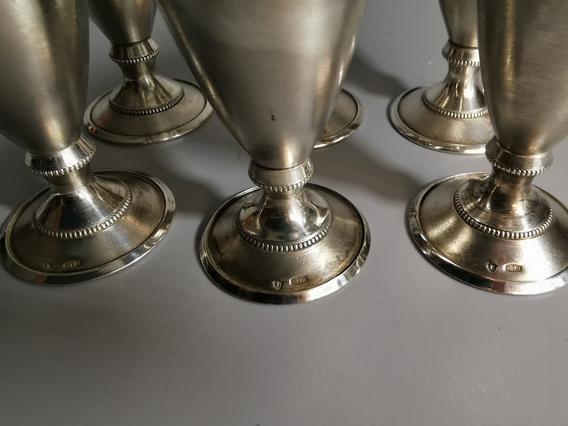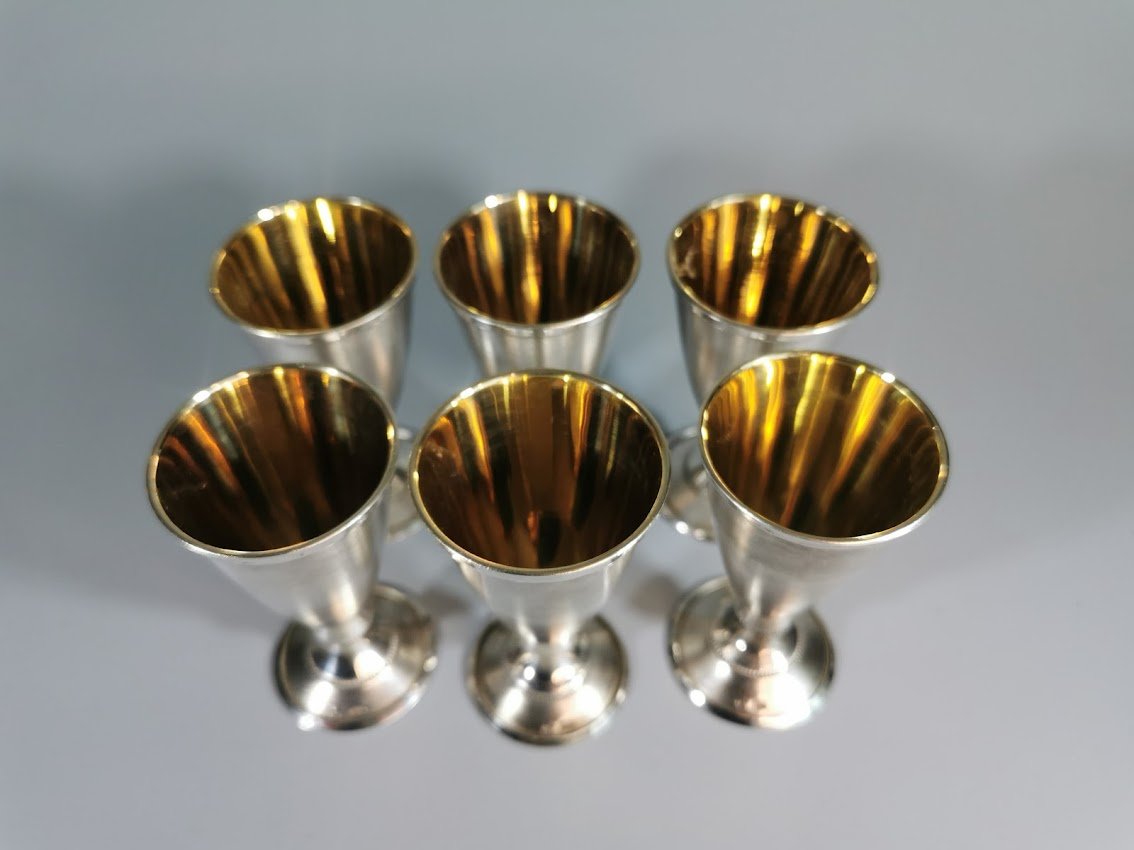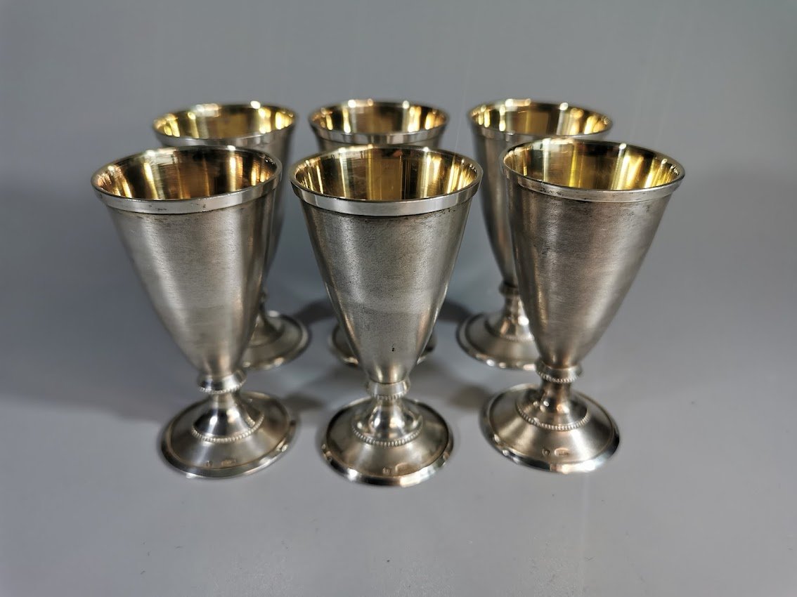 Taurelės, stikliukai ant kojelės, sidabrinės tarybinės. Praba 916. Talpa 30 ml. LIKO 6 vnt. Visų svoris 205 gr. Kaina po 98