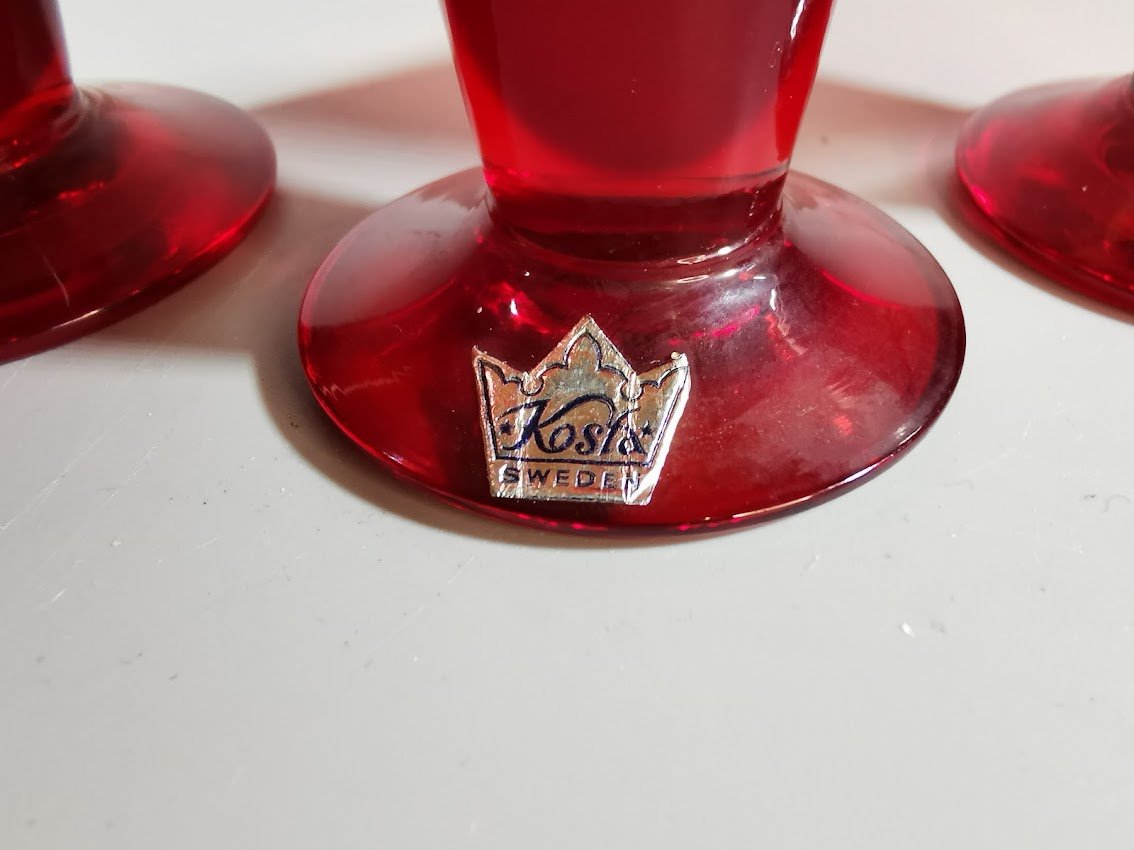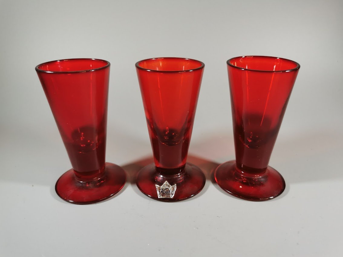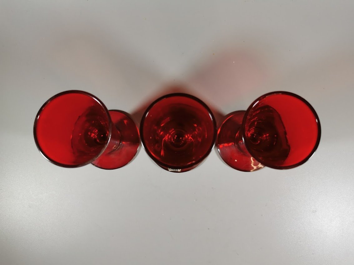 Taurelės stikliukai raudono stiklo, vintažiniai. 3 vnt. Aukštis 8,5 cm. Kaina po 6 arba 13 už visus.