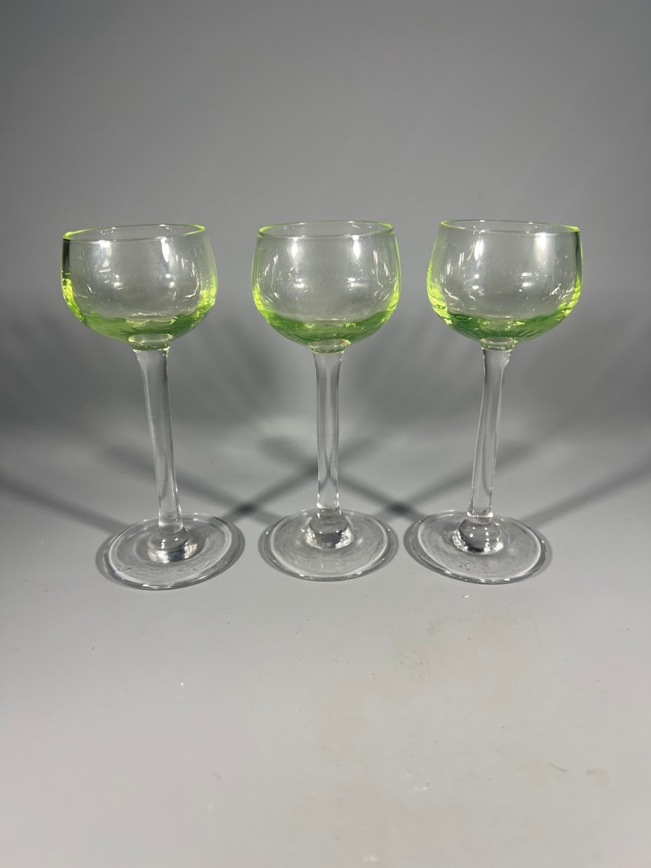 Taurelės, taurelė urano stiklo, ant kojelės, Art Deco stiliaus, antikvarinė, prancūziška. Talpa 40 ml. 3 vnt. Kaina po 18