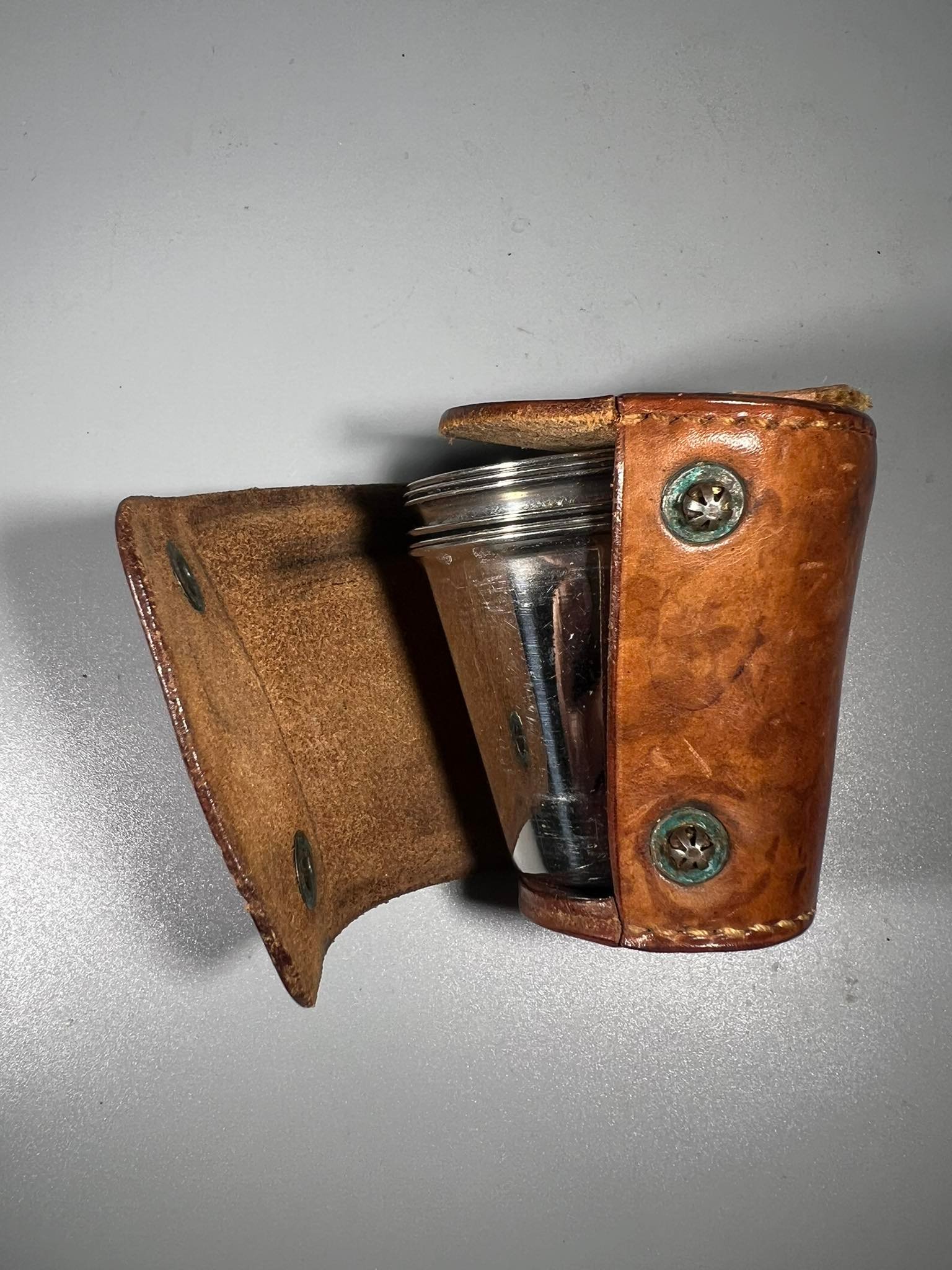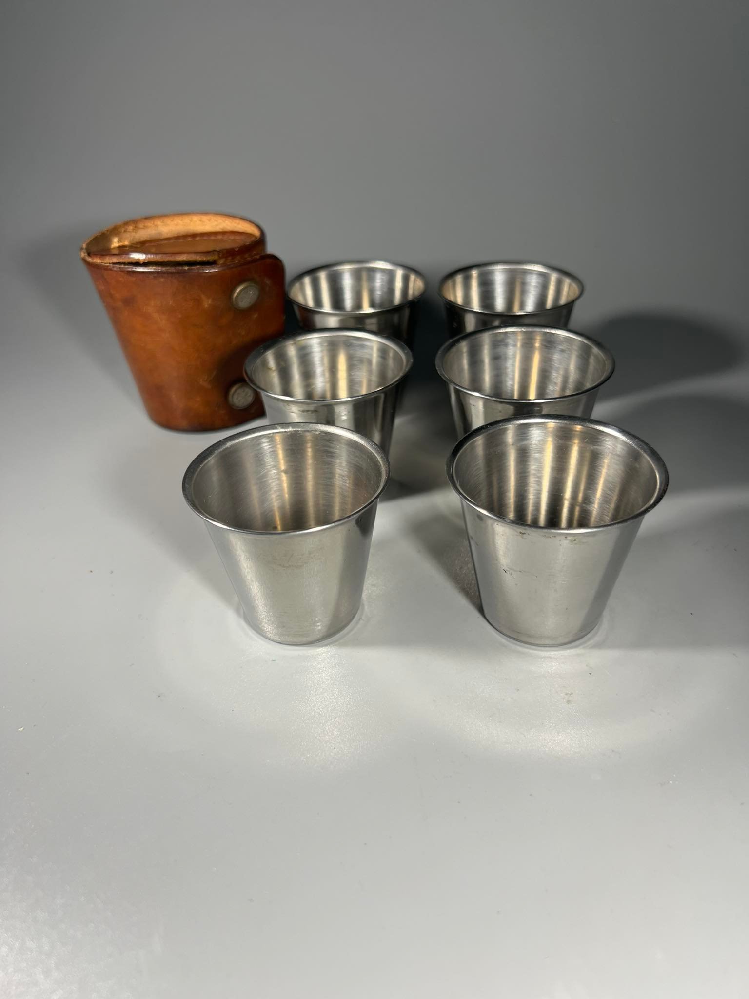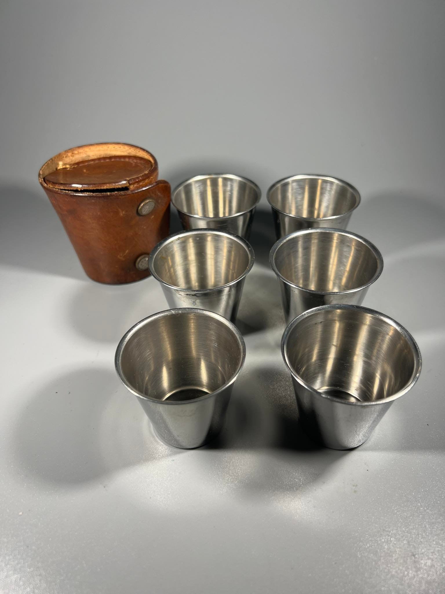Taurelių, stikliukų rinkinys nerūdijančio plieno odiniame dėkle, 6 vnt. Kaina 36