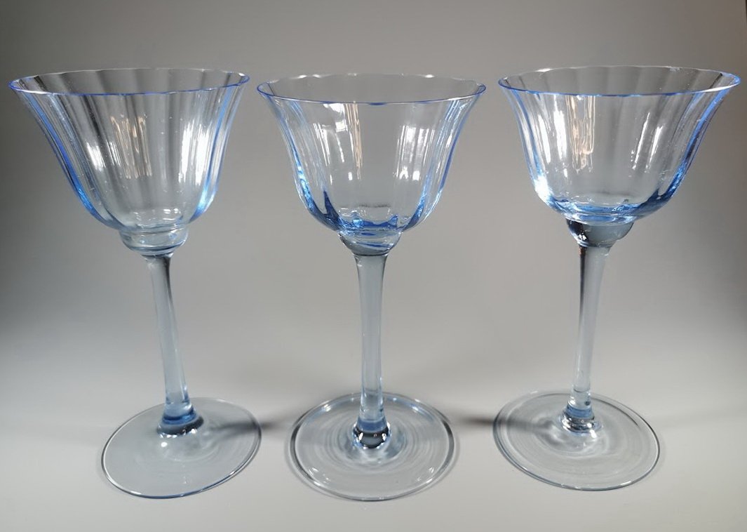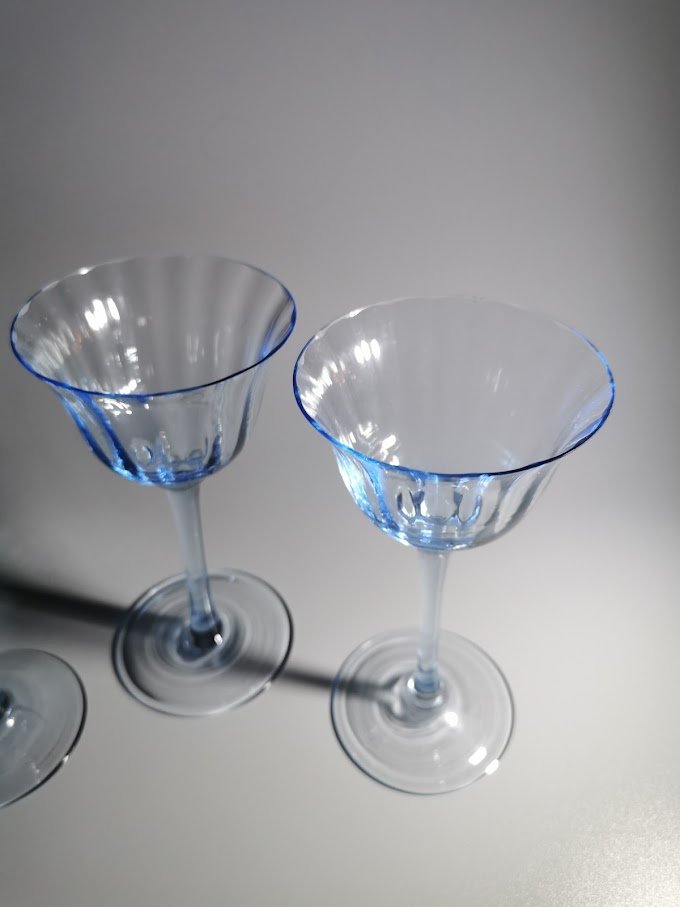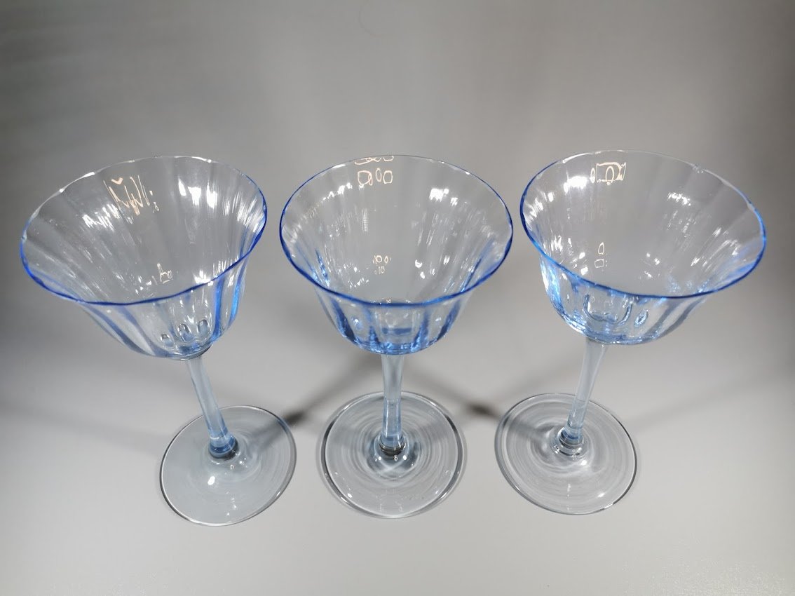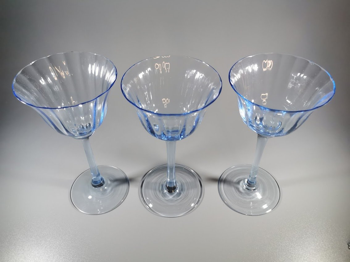 Taurės Art Deco stiliaus, melsvo stiklo, tarpukario laikų, 1920-1930 m. 3 vnt. Smulkus defektas. Kaina po 23