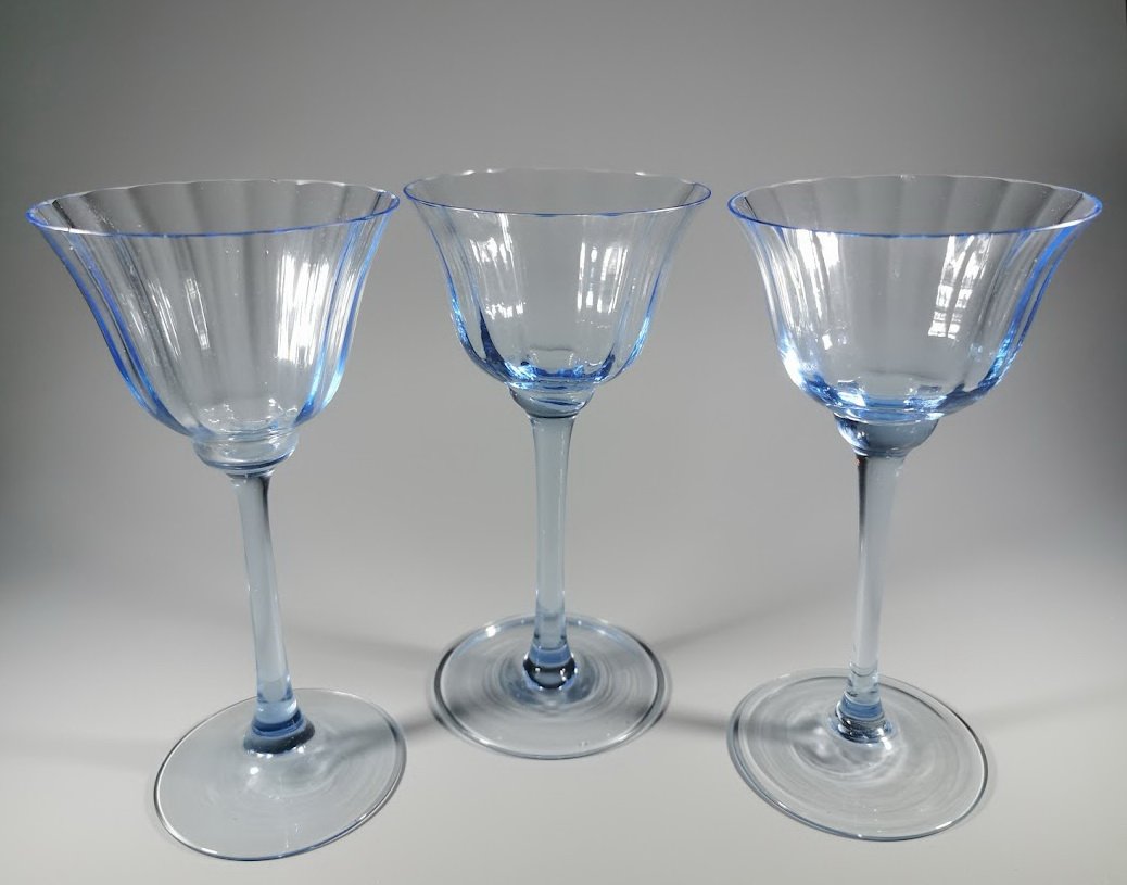 Taurės Art Deco stiliaus, melsvo stiklo, tarpukario laikų, 1920-1930 m. 3 vnt. Aukštis 17,5 cm. Smulkus defektas. Kaina po 23