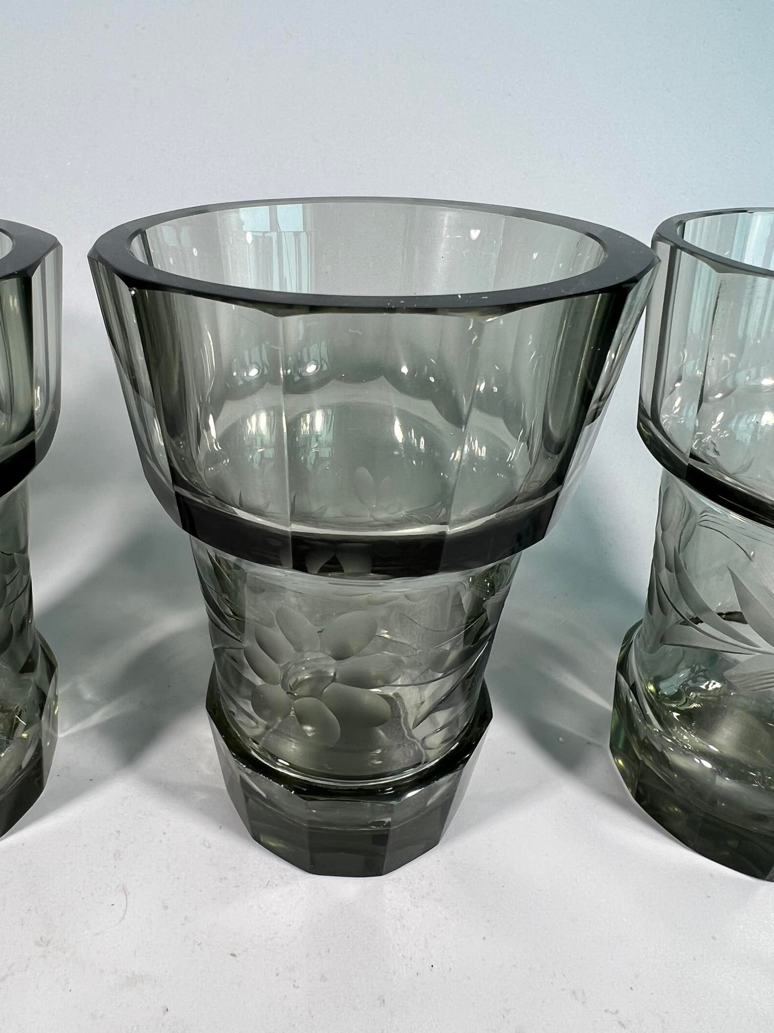 Taurės, stiklinės Art Deco stiliaus, raižyto, presuoto stiklo, antikvarinės. Talpa 130 ml. 4 vnt. Kaina po 12