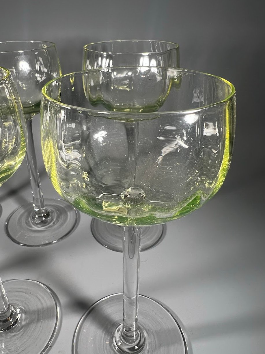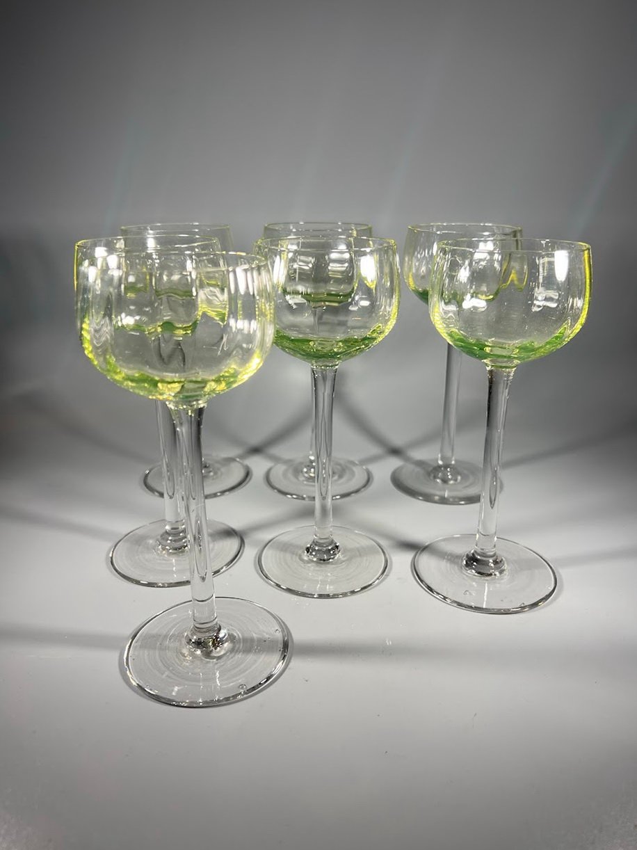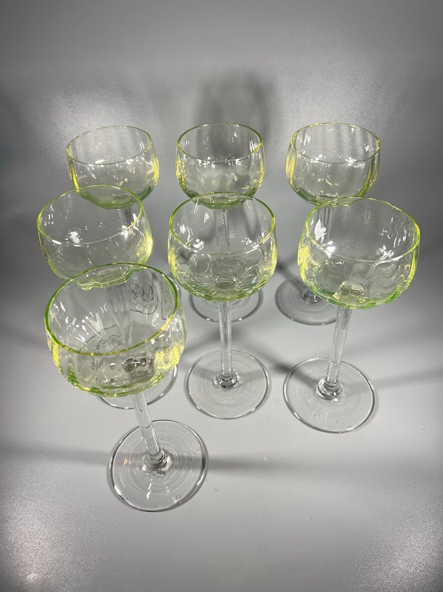 Taurės, taurė urano stiklo vyno ar vandens antikvarinės, prancūziškos. Talpa 130 ml. 7 vnt. Kaina po 28