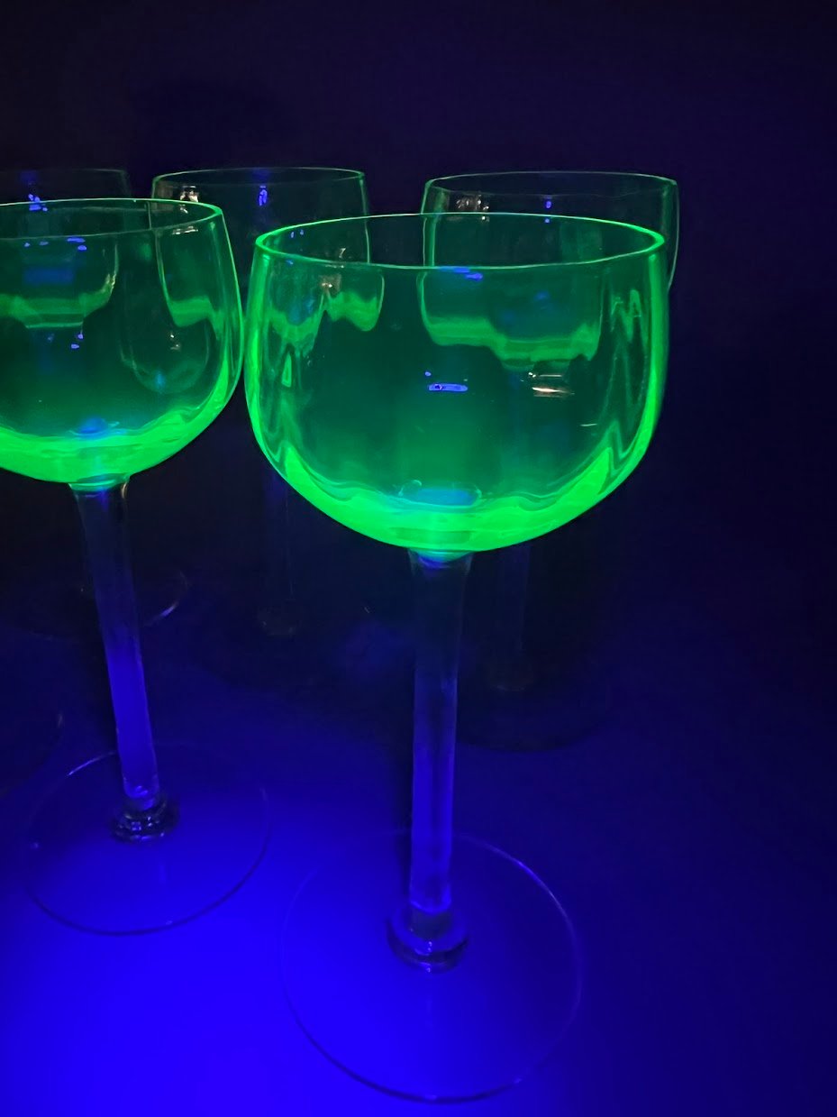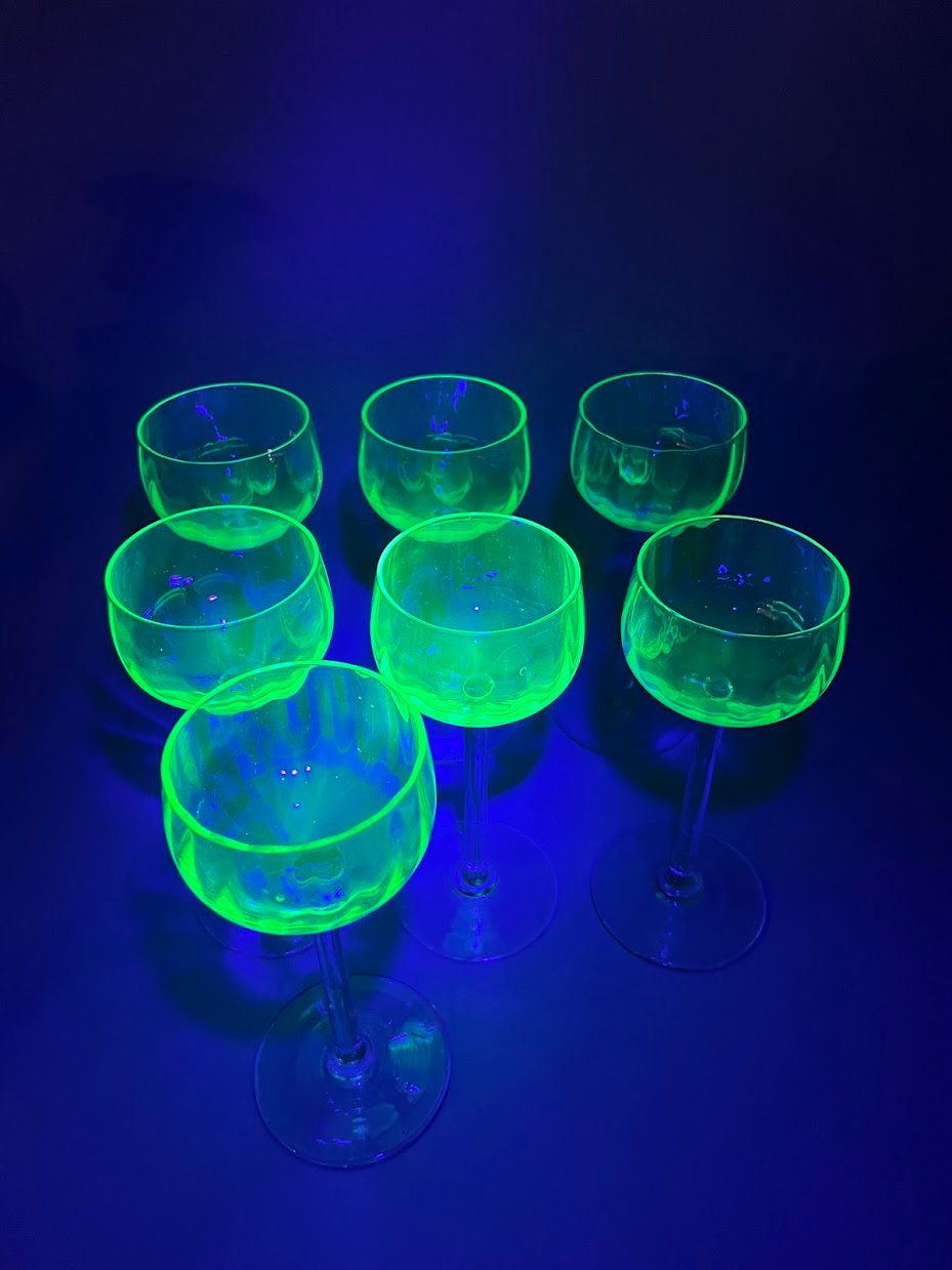Taurės, taurė urano stiklo vyno ar vandens antikvarinės, prancūziškos. Talpa 130 ml. 7 vnt. Aukštis 17 cm. Kaina po 28
