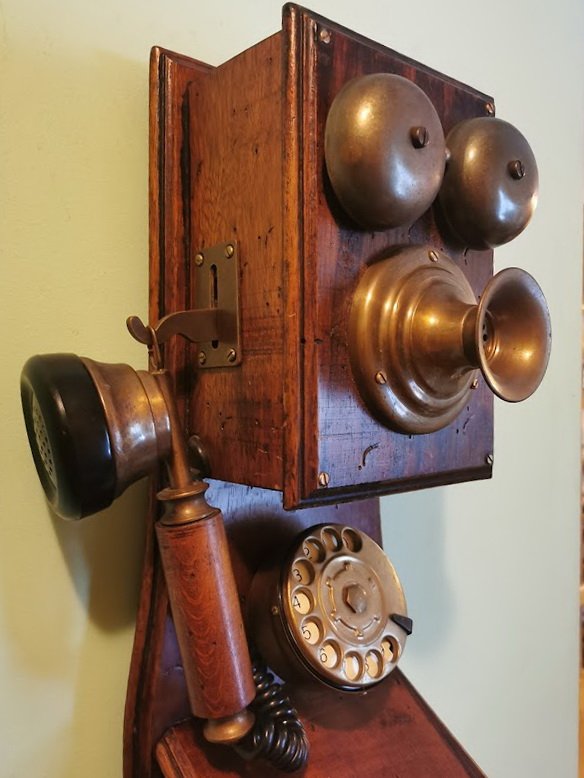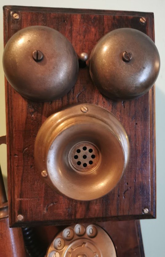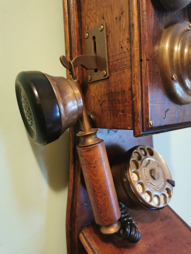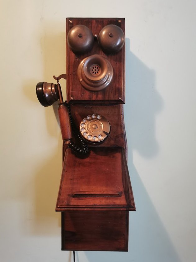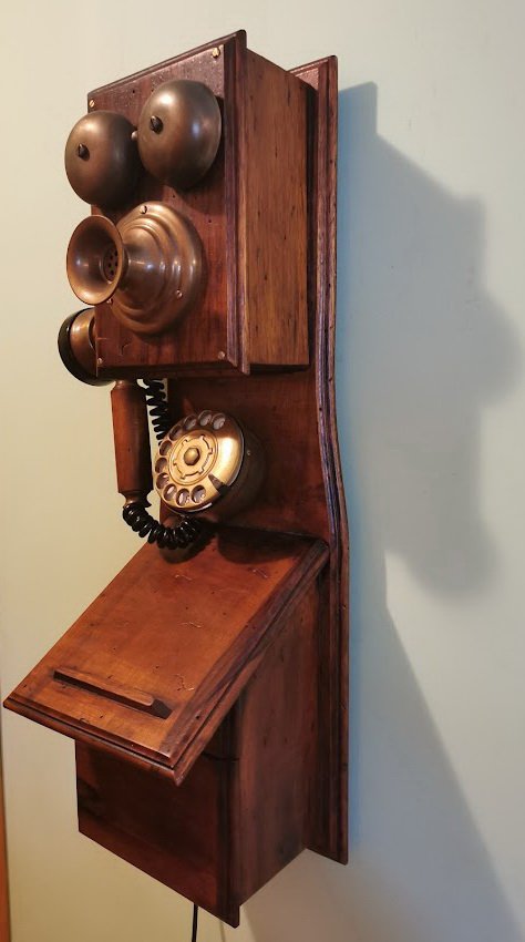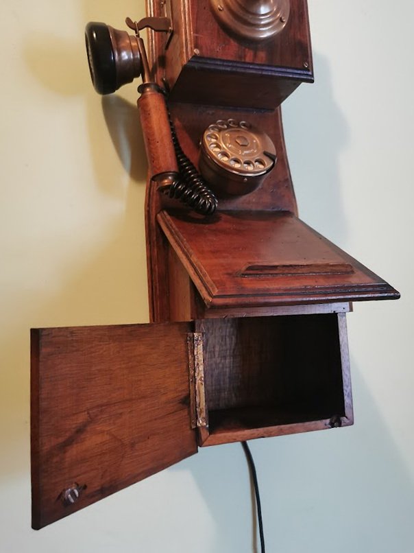 Telefonas senovinio stiliaus. Buvo naudojamas pagal paskirtį. Aukštis 59, plotis 20 cm. Kaina 187