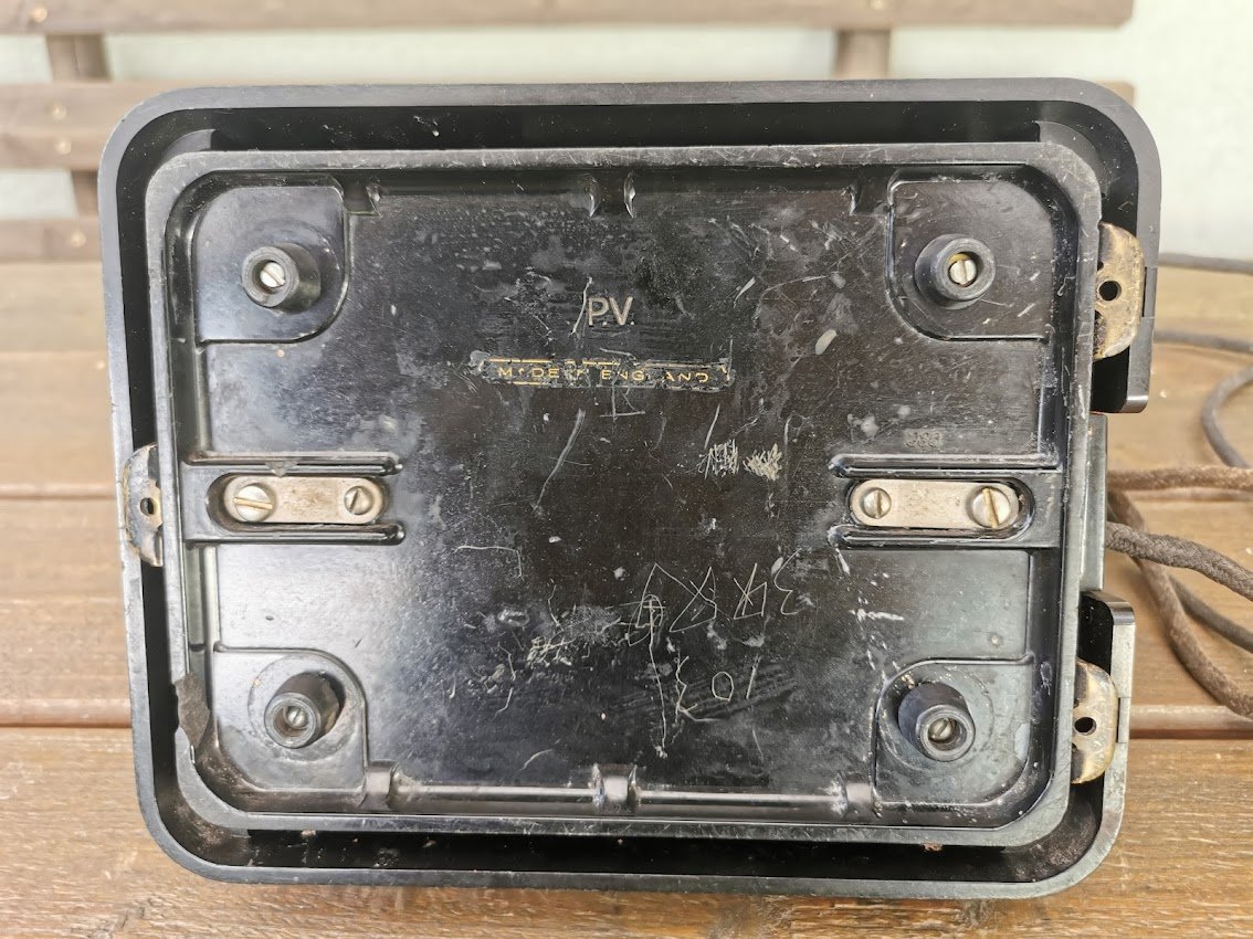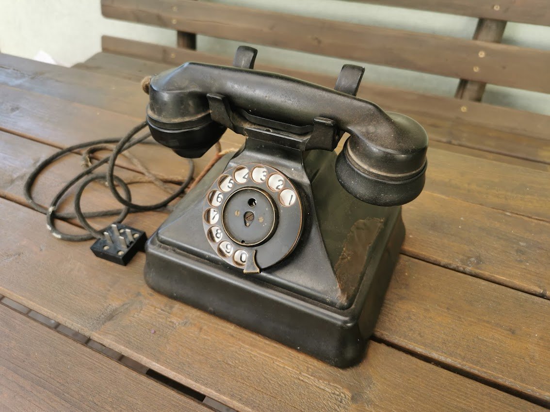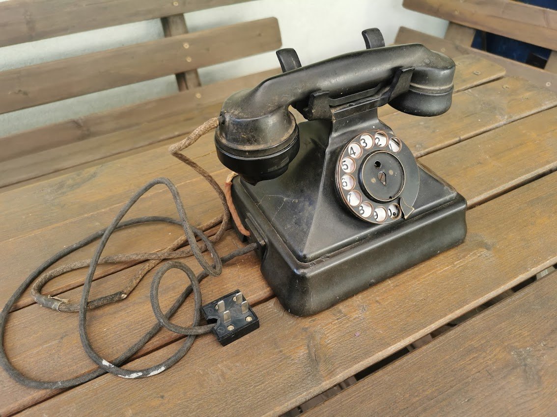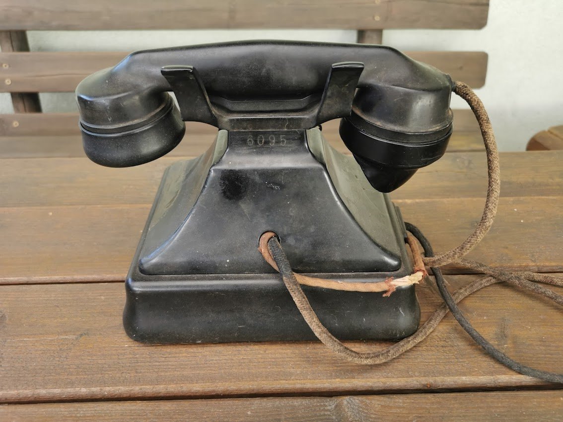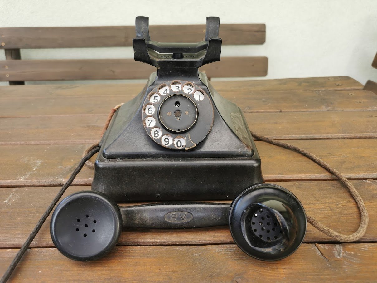 Telefonas tarpukario laikų antikvarinis, naudotas Lietuvoje, Kaune. Ragelyje spaudas: PV (Pašto Valdyba). Pagamintas Didžiojoje Britanijoje skirtas tarpukario Lietuvos rinkai. Kaina 178